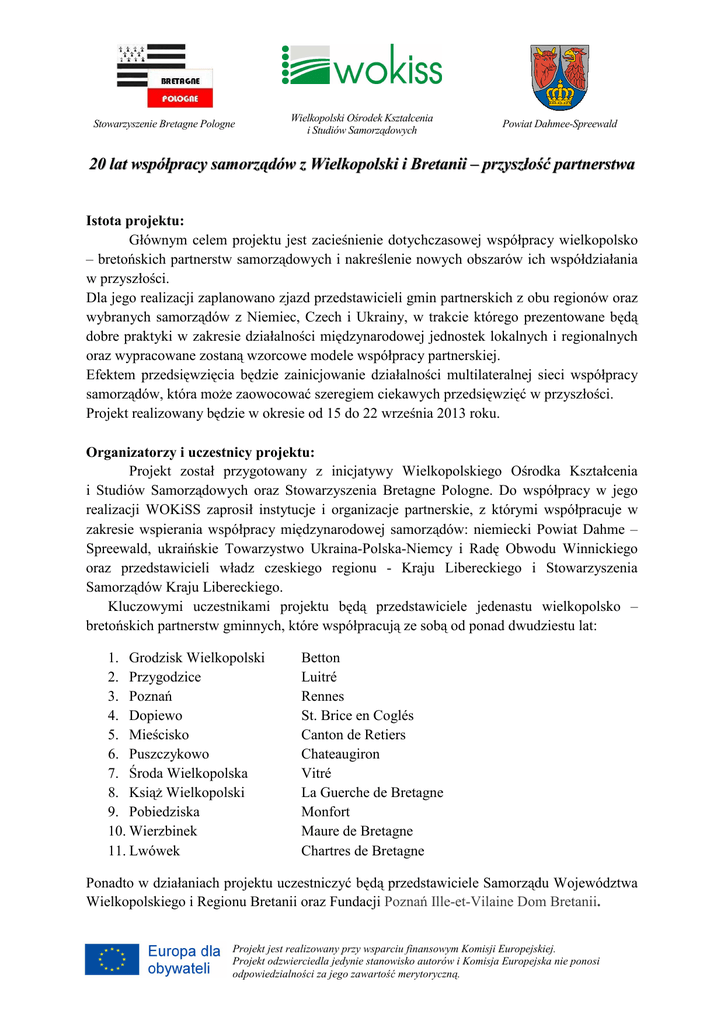 Stowarzyszenie Bretagne Pologne Wielkopolski Ośrodek Kształcenia i Studiów Samorządowych Powiat Dahmee-Spreewald 20 lat współpracy samorządów z Wielkopolski i Bretanii – przyszłość partnerstwa Istota projektu: Głównym celem projektu jest zacieśnienie dotychczasowej współpracy wielkopolsko – bretońskich partnerstw samorządowych i nakreślenie nowych obszarów ich współdziałania w przyszłości. Dla jego realizacji zaplanowano zjazd przedstawicieli gmin partnerskich z obu regionów oraz wybranych samorządów z Niemiec, Czech i Ukrainy, w trakcie którego prezentowane będą dobre praktyki w zakresie działalności międzynarodowej jednostek lokalnych i regionalnych oraz wypracowane zostaną wzorcowe modele współpracy partnerskiej. Efektem przedsięwzięcia będzie zainicjowanie działalności multilateralnej sieci współpracy samorządów, która może zaowocować szeregiem ciekawych przedsięwzięć w przyszłości. Projekt realizowany będzie w okresie od 15 do 22 września 2013 roku. Organizatorzy i uczestnicy projektu: Projekt został przygotowany z inicjatywy Wielkopolskiego Ośrodka Kształcenia i Studiów Samorządowych oraz Stowarzyszenia Bretagne Pologne. Do współpracy w jego realizacji WOKiSS zaprosił instytucje i organizacje partnerskie, z którymi współpracuje w zakresie wspierania współpracy międzynarodowej samorządów: niemiecki Powiat Dahme – Spreewald, ukraińskie Towarzystwo Ukraina-Polska-Niemcy i Radę Obwodu Winnickiego oraz przedstawicieli władz czeskiego regionu - Kraju Libereckiego i Stowarzyszenia Samorządów Kraju Libereckiego. Kluczowymi uczestnikami projektu będą przedstawiciele jedenastu wielkopolsko – bretońskich partnerstw gminnych, które współpracują ze sobą od ponad dwudziestu lat: 1. Grodzisk Wielkopolski 2. Przygodzice 3. Poznań 4. Dopiewo 5. Mieścisko 6. Puszczykowo 7. Środa Wielkopolska 8. Książ Wielkopolski 9. Pobiedziska 10. Wierzbinek 11. Lwówek Betton Luitré Rennes St. Brice en Coglés Canton de Retiers Chateaugiron Vitré La Guerche de Bretagne Monfort Maure de Bretagne Chartres de Bretagne Ponadto w działaniach projektu uczestniczyć będą przedstawiciele Samorządu Województwa Wielkopolskiego i Regionu Bretanii oraz Fundacji Poznań Ille-et-Vilaine Dom Bretanii. Projekt jest realizowany przy wsparciu finansowym Komisji Europejskiej. Projekt odzwierciedla jedynie stanowisko autorów i Komisja Europejska nie ponosi odpowiedzialności za jego zawartość merytoryczną. Stowarzyszenie Bretagne Pologne Wielkopolski Ośrodek Kształcenia i Studiów Samorządowych Powiat Dahmee-Spreewald 20 lat współpracy samorządów z Wielkopolski i Bretanii – przyszłość partnerstwa Działania projektu: Projekt podzielony został na 4 kluczowe etapy. Pierwszy z nich, pod hasłem Poznaj Wielkopolskę będzie miał charakter integracyjno – poznawczy. Delegacje zagraniczne odwiedzą wybrane wielkopolskie gminny (Kleczew i Kłodawę), które zaprezentują uczestnikom zasady współpracy samorządów z podmiotami gospodarczymi, dla podniesienia atrakcyjności turystycznej swoich terenów. Wspólny wyjazd będzie doskonałą okazją na wzajemne zapoznanie się członków delegacji, co wpłynie pozytywnie na kolejne etapy przedsięwzięcia. Drugi etap, o charakterze edukacyjnym, obejmuje przeprowadzenie warsztatów oraz konferencji nt Współpraca partnerska samorządów, a przyszłość Unii Europejskiej. Podczas warsztatów uczestnicy, podzieleni na 4 grupy, będą pracować nad stworzeniem wzorcowych modeli współpracy partnerskiej samorządów, zarówno pod kątem formy jak i płaszczyzn współpracy. Wykorzystanie określonych modeli prowadzić może bowiem do efektywniejszej współpracy, szerszej wymiany doświadczeń oraz głębszej integracji obywateli partnerskich samorządów. Natomiast konferencja poświęcona będzie prezentacji dobrych praktyk w obszarze współpracy międzynarodowej wszystkich uczestniczących samorządów oraz dyskusji na temat modeli współpracy wypracowanych w trakcie warsztatów. Trzeci etap projektu dotyczyć będzie już wyłącznie wielkopolsko – bretońskich partnerstw samorządowych. Odbywać się będzie bezpośrednio w wielkopolskich gminach i poświęcony zostanie dostosowaniu wypracowanych modeli współpracy do rzeczywistych potrzeb, możliwości i oczekiwań partnerów. Natomiast ostatnim działaniem projektu będzie impreza integracyjna pod hasłem Dzień Strażaka. Tematyka wydarzenia wybrana została nieprzypadkowo - po pierwsze tradycje ochotniczych straży pożarnych są bardzo silne zarówno w Polsce jaki i we Francji, po drugie z badań organizatorów wynika, że współpraca tych organizacji społecznych jest jednym z głównych filarów wielu partnerstw samorządowych. Impreza integracyjna odbędzie się w Grodzisku Wielkopolskim. Opisywane przedsięwzięcie jest kontynuacją projektu 20 - lecie konstruktywnego partnerstwa pomiędzy Bretanią a Polską, doświadczenia i nadzieje zrealizowanego w dniach 12-16 lipca 2012r. we Francji. Projekt jest realizowany przy wsparciu finansowym Komisji Europejskiej. Projekt odzwierciedla jedynie stanowisko autorów i Komisja Europejska nie ponosi odpowiedzialności za jego zawartość merytoryczną.