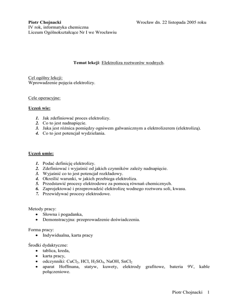 Piotr Chojnacki IV rok, informatyka chemiczna Liceum Ogólnokształcące Nr I we Wrocławiu Wrocław dn. 22 listopada 2005 roku Temat lekcji: Elektroliza roztworów wodnych. Cel ogólny lekcji: Wprowadzenie pojęcia elektrolizy. Cele operacyjne: Uczeń wie: 1. 2. 3. 4. Jak zdefiniować proces elektrolizy. Co to jest nadnapięcie. Jaka jest różnica pomiędzy ogniwem galwanicznym a elektrolizerem (elektrolizą). Co to jest potencjał wydzielania. Uczeń umie: 1. 2. 3. 4. 5. 6. 7. Podać definicję elektrolizy. Zdefiniować i wyjaśnić od jakich czynników zależy nadnapięcie. Wyjaśnić co to jest potencjał rozkładowy. Określić warunki, w jakich przebiega elektroliza. Przedstawić procesy elektrodowe za pomocą równań chemicznych. Zaprojektować i przeprowadzić elektrolizę wodnego roztworu soli, kwasu. Przewidywać procesy elektrodowe. Metody pracy: • Słowna i pogadanka, • Demonstracyjna: przeprowadzenie doświadczenia. Forma pracy: • Indywidualna, karta pracy Środki dydaktyczne: • tablica, kreda, • karta pracy, • odczynniki: CuCl2, HCl, H2SO4, NaOH, SnCl2 • aparat Hoffmana, statyw, kuwety, elektrody grafitowe, bateria 9V, kable połączeniowe. Piotr Chojnacki 1 Przebieg lekcji: 1. Część nawiązująca: Przypomnienie wiadomości o budowie ogniwa galwanicznego. W ogniwach galwanicznych wytwarzanie prądu elektrycznego jest reakcją samorzutną. Jeżeli chcielibyśmy ten proces odwrócić, musielibyśmy wykonać pracę na układzie. Byłby to więc proces wymuszony. 2. Część właściwa: Sformułowanie tematu lekcji. Podanie definicji elektrolizy. Elektroliza – jest to proces, który polega na przyłożeniu do elektrod odpowiedniego napięcia z zewnętrznego źródła, powodującego przepływ prądu przez elektrolit i wymuszenie reakcji elektrodowych. Proces elektrolizy zachodzi w stopionych solach i roztworach wodnych kwasów, zasad oraz soli i przeprowadzany jest w urządzeniach nazywanych elektrolizerami. Elektrolizery mają inną budowę jak ogniwa galwaniczne. W elektrolizerach w odróżnieniu od ogniwa, elektrody znajdują się w jednym naczyniu zawierającym roztwór jednego elektrolitu. Piotr Chojnacki 2 Na rysunku przedstawiono schemat elektrolizera stosowanego do wydzielenia miedzi z roztworu chlorku miedzi(II). Podobnie jak w ogniwie galwanicznym utlenianie zachodzi na anodzie, a redukcja na katodzie. Ruch elektronów od anody do katody odbywa się zewnętrznym przewodnikiem. W roztworze kationy poruszają się w kierunku elektrody zwanej katodą, a ujemnie naładowane aniony przesuwają się w stronę dodatnio naładowanej elektrody zwanej anodą. Jony po osiągnięciu elektrod podlegają następującym reakcjom. anoda: 2Cl-(c) --> Cl2(g) + 2ekatoda: Cu2+(c) + 2e- --> Cu(c) Podanie definicji napięcia rozkładowego i nadnapięcia. napięciem rozkładowym – nazywamy najmniejsze napięcie konieczne do wywołania elektrolizy W praktyce na wartość napięcia rozkładowego Urozkł. jest powiększana o tzw. nadnapięcie η . Na wartość nadnapięcia wpływają; • • • materiał elektrody oraz stan jej powierzchni gęstość prądu temperatura Nadnapięcie można rozłożyć na nadnapięcia przy poszczególnych elektrodach ( η = η k + η a) Aby więc otrzymać wartość rzeczywistego napięcia rozkładowego, należy teoretyczne napięcie rozkładowe powiększyć o nadnapięcie na obu elektrodach, a ponadto o spadek napiecia I * R, wywołany oporem elektrolitu: Urozkł. = E1 - E2 + η k + η a + I * R gdzie; E1 i E2 - potencjały elektrod utworzonych z produktów elektrolizy, η k - nadnapięcia, I natężenie prądu, R - opór elektrolitu. Piotr Chojnacki η a, 3 Przewidywanie produktów elektrolizy. • reakcje katodowe : w pierwszej kolejności rozładowują się kationy metali ciężkich, czyli metali położonych w szeregu napięciowym na prawo od glinu: Mn+ + ne- → M Jeśli roztwór elektrolitu nie zawiera jonów metali ciężkich, na katodzie wydziela się wodór pochodzący z rozładowania kationów H+ (jeś1i odczyn roztworu jest kwaśny): 2 H+ + 2e- → H2 lub z redukcji cząsteczek wody (w roztworach obojętnych i zasadowych): 2 H2O + 2e- → H2 + 2 OHW przypadku zakwaszonego roztworu soli metalu ciężkiego wydzielanie metalu i wodoru może zachodzić równocześnie. • reakcje anodowe: w pierwszej kolejności rozładowują się aniony kwasów beztlenowych, np: 2CI- → Cl2 + 2eJeśli są one nieobecne w roztworze, na anodzie wydziela się tlen pochodzący z rozładowania jonów OH - (w roztworach zasadowych): 4 OH- →O2 + 2 H2O + 4elub utlenienia cząsteczek wody (roztwory obojętne i kwaśne): 2H2O →O2 + 4 H+ + 4eJeśli anoda nie jest wykonana z metalu szlachetnego lub grafitu, może ulec roztwarzaniu, jak na przykład podczas elektrolizy roztworu CuSO4 na elektrodach miedzianych: M→Mn+ + ne- Działanie niektórych doświadczenia. z powyższych reguł potwierdzają następujące Piotr Chojnacki 4 Doświadczenia (pokazy): Uczniowie wypełniają karty pracy. 1. Elektroliza roztworu CuCl2. Podobne doświadczenie na SnCl2 (na szalce Petriego) Przygotuj zestaw zgodnie z rysunkiem. 1. Do 3/4 pojemności zlewki wlej roztwór CuCl2. 2. Zanurz w roztworze elektrody grafitowe. 3. Podłącz elektrody do źródła prądu stałego o napięciu około 2,5 V. Zapisz obserwacje. Przedstaw wnioski z przeprowadzonego doświadczenia. Wypełnij kartę pracy ucznia. Spostrzeżenia: Pod wpływem przyłożonego napięcia prądu stałego nastąpiło wydzielanie się produktów na elektrodach: na ujemnej czerwonobrunatnego osadu, na dodatniej- pęcherzyków zielonożółtego gazu. Wnioski: Pod wpływem prądu kationy miedzi Cu2+ (z dysocjacji) dążą do elektrody ujemnej - katody, z której pobierają elektrony, redukując się według równania: Cu2+ + 2e- → Cu (metaliczna miedź) redukcja Natomiast aniony chlorkowe są przyciągane przez elektrodę dodatnią - anodę, której przekazują swoje elektrony: 2Cl- - 2e- →Cl2↑ (gazowy chlor) ut