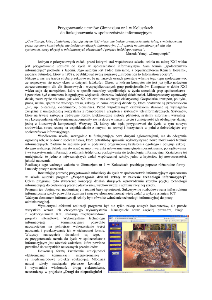 Przygotowanie uczniów Gimnazjum nr 1 w Koluszkach do funkcjonowania w społeczeństwie informacyjnym „Cywilizacja, którą zbudujemy, zbliżając się do XXI wieku, nie będzie cywilizacją materialną, symbolizowaną przez ogromne konstrukcje, ale będzie cywilizacją informacyjną [...] opartą na niewidocznych dla oka systemach, mocy ukrytej w miniaturowych elementach i potędze ludzkiego rozumu”. Masuda Yoneji „Computopia” Jednym z priorytetowych zadań, przed którymi stoi współczesna szkoła, szkoła na miarę XXI wieku jest przygotowanie uczniów do życia w społeczeństwie informacyjnym. Sam termin „społeczeństwo informacyjne” pochodzi z Japonii. Jego autorem jest Tadeo Umesamo, a popularyzatorem Kenichi Koyamie, japoński futurolog, który w 1968 r. opublikował swoją rozprawę „Introduction to Information Society”. Nikogo z nas nie trzeba chyba przekonywać, że na naszych oczach powstaje właśnie tego typu społeczeństwo, że rozpoczyna się nowy okres w dziejach ludzkości. Okres, w którym komputer nie jest już tylko gadżetem zarezerwowanym dla elit finansowych i wyspecjalizowanych grup profesjonalistów. Komputer w dobie XXI wieku staje się narzędziem, które w sposób naturalny współistnieje w życiu szerokich grup społeczeństwa i powinien być elementem integrującym większość obszarów ludzkiej działalności. Mikroprocesory opanowały dzisiaj nasze życie tak samo, jak wiek XX uzależnił nas od energii elektrycznej. Gospodarka, transport, polityka, praca, nauka, spędzanie wolnego czasu, zakupy to coraz częściej dziedziny, które opatrzone są przedrostkiem „e-”, np. e-learning, e-commerce, e-businnes. Przed współczesnym człowiekiem stawiane są wymagania związane z umiejętnością korzystania z różnorodnych urządzeń i systemów teleinformatycznych. Systemów, które na trwałe zastępują tradycyjne formy. Elektroniczne metody płatności, systemy informacji wizualnej czy korespondencja elektroniczna zadomowiły się na dobre w naszym życiu i umiejętność ich obsługi jest dzisiaj jedną z kluczowych kompetencji. Wszyscy Ci, którzy nie będą przygotowani do życia w tym nowym środowisku, stracą szansę na współdziałanie z innymi, na rozwój i korzystanie w pełni z dobrodziejstw ery społeczeństwa informacyjnego. Współczesna szkoła, szczególnie ta funkcjonująca poza dużymi aglomeracjami, ma do odegrania ogromną rolę w budowie społeczeństwa, które potrafiłoby sprawnie wykorzystywać nowe możliwości technik informacyjnych. Zadanie to zapisane jest w podstawie programowej kształcenia ogólnego i obliguje szkołę do jego realizacji. Szkoła ma stwarzać uczniom warunki nabywania umiejętności poszukiwania, porządkowania i wykorzystywania informacji z różnych źródeł oraz posługiwania się technologią informacyjną. Kształcenie tej umiejętności to jedno z najważniejszych zadań współczesnej szkoły, jedno z kryteriów jej nowoczesności, jakości nauczania. Realizacja tego ważnego zadania w Gimnazjum nr 1 w Koluszkach przebiega poprzez różnorodne formy i metody pracy z uczniami. Rozumiejąc potrzebę przygotowania młodzieży do życia w społeczeństwie informacyjnym opracowano w szkole autorski program „Wspomagania działań szkoły w zakresie technologii informacyjnej”. Celem programu było stworzenie koncepcji działań służących wprowadzaniu szeroko pojętej technologii informacyjnej do codziennej pracy dydaktycznej, wychowawczej i administracyjnej szkoły. Program ten obejmował modernizację i rozwój bazy sprzętowej. Sukcesywnie rozbudowywana infrastruktura informatyczna szkoły pozwoliła uczniom i nauczycielom zrealizować wiele zadań z wykorzystaniem ICT. Ważnym elementem informatyzacji szkoły było również wdrożenie technologii informacyjnej do pracy administracyjnej. Wymiernymi efektami realizacji programu był nie tylko zakup nowych komputerów, ale przede wszystkim wzrost ich efektywnego wykorzystania. Nauczyciele coraz częściej prowadzą lekcje z wykorzystaniem ICT, realizują międzynarodowe projekty internetowe. Wykorzystanie technologii informacyjnej i komunikacyjnej pozwoliło nauczycielom na pełniejsze wykorzystanie treści nauczania i przekazywanie ich w ciekawszej formie. Wszyscy nauczyciele świadomi są tego, że przygotowanie ucznia do życia w społeczeństwie informacyjnym jest również zadaniem, które powinno przenikać do wszystkich nauczanych przedmiotów. Doskonałą formą kształcenia umiejętności elektronicznej komunikacji interpersonalnej są międzynarodowe projekty edukacyjne. Młodzież naszej szkoły nawiązała pierwsze kontakty i wymieniała wiadomości drogą elektroniczną, uczestnicząc w projekcie „Drogi do niepodległości – narodowe impresje malarskie”, w ramach programu Komisji Europejskiej „Netd@ys”. (http://gim1koluszki.szkoly.lodz.pl/net/index_p.html) Celem tego projektu było przybliżenie polskim i fińskim uczniom ze szkoły w Ruukin Ylaste kultury i historii obu państw oraz przygotowanie ich do korzystania z różnych źródeł informacji, wykorzystanie komputera i Internetu jako narzędzia pracy intelektualnej. Na podstawie materiałów zgromadzonych i opracowanych przez uczniów stworzone zostały strony internetowe projektu, a sam projekt zgłoszony do bazy danych programu Netd@ys w Brukseli. Nowym doświadczeniem dla uczniów i nauczycieli podczas realizacji projektu była pierwsza videokonferencja z fińską szkołą, podczas której nasi gimnazjaliści mogli zobaczyć swoich kolegów i bezpośrednio wymienić uwagi dotyczące realizacji projektu. Elektroniczna wymiana korespondencji jest również kluczową umiejętnością w realizacji międzynarodowych projektów językowych. Projekt „Das Bild der Anderen” realizowany w ramach European Scholl Projekt polegał na wymianie korespondencji w języku niemieckim między uczniami, dla których język niemiecki jest językiem obcym. Celem 