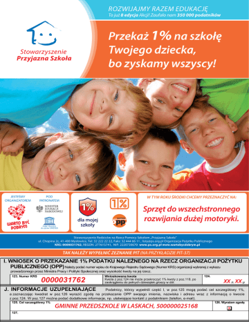 ROZWIJAJMY RAZEM EDUKACJĘ To już 8 edycja Akcji! Zaufało nam 350 000 podatników Przekaż 1% na szkołę Twojego dziecka, bo zyskamy wszyscy! JESTEŚMY ORGANIZATOREM POD PATRONATEM W TYM ROKU ŚRODKI CHCEMY PRZEZNACZYĆ NA: Sprzęt do wszechstronnego rozwijania dużej motoryki. Stowarzyszenie Rodziców na Rzecz Pomocy Szkołom „Przyjazna Szkoła” ul. Chopina 2c, 41-400 Mysłowice, Tel: 32 222 22 22, Faks: 32 444 66 11 , [email protected] Organizacja Pożytku Publicznego KRS: 0000031762, REGON: 277615741, NIP: 2220730670 www.ps.org.pl www.wartobycdobrym.pl TAK NALEŻY WYPEŁNIĆ ZEZNANIE PIT (NA PRZYKŁADZIE PIT-37) I. WNIOSEK O PRZEKAZANIE 1% PODATKU NALEĩNEGO NA RZECZ ORGANIZACJI POĩYTKU PUBLICZNEGO (OPP) NaleĪy podaü numer wpisu do Krajowego Rejestru Sądowego (Numer KRS) organizacji wybranej z wykazu prowadzonego przez Ministra Pracy i Polityki Spoáecznej oraz wysokoĞü kwoty na jej rzecz. 123. Numer KRS 0000031762 Wnioskowana kwota Kwota z poz.124 nie moĪe przekroczyü 1% kwoty z poz.118, po zaokrągleniu do peánych dziesiątek groszy w dóá. 124. ;; zá, ;; gr J. INFORMACJE UZUPEàNIAJĄCE Podatnicy, którzy wypeánili czĊĞü I, w poz.125 mogą podaü cel szczegóáowy 1%, a zaznaczając kwadrat w poz.126 wyraziü zgodĊ na przekazanie OPP swojego imienia, nazwiska i adresu wraz z informacją o kwocie z poz.124. W poz.127 moĪna podaü dodatkowe informacje, np. uáatwiające kontakt z podatnikiem (telefon, e-mail). 125. Cel szczegóáowy 1% 127. GMINNE PRZEDSZKOLE W LASKACH, 500000025168 1$=:$:<%5$1(-6=.2à<;;;;;;;;;;;; 126. WyraĪam zgodĊ X
