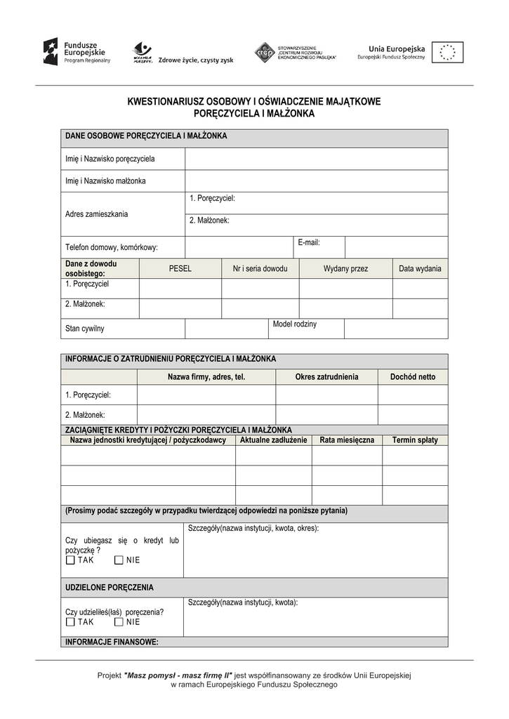 kwestionariusz osobowy i oświadczenie majątkowe poręczyciela i