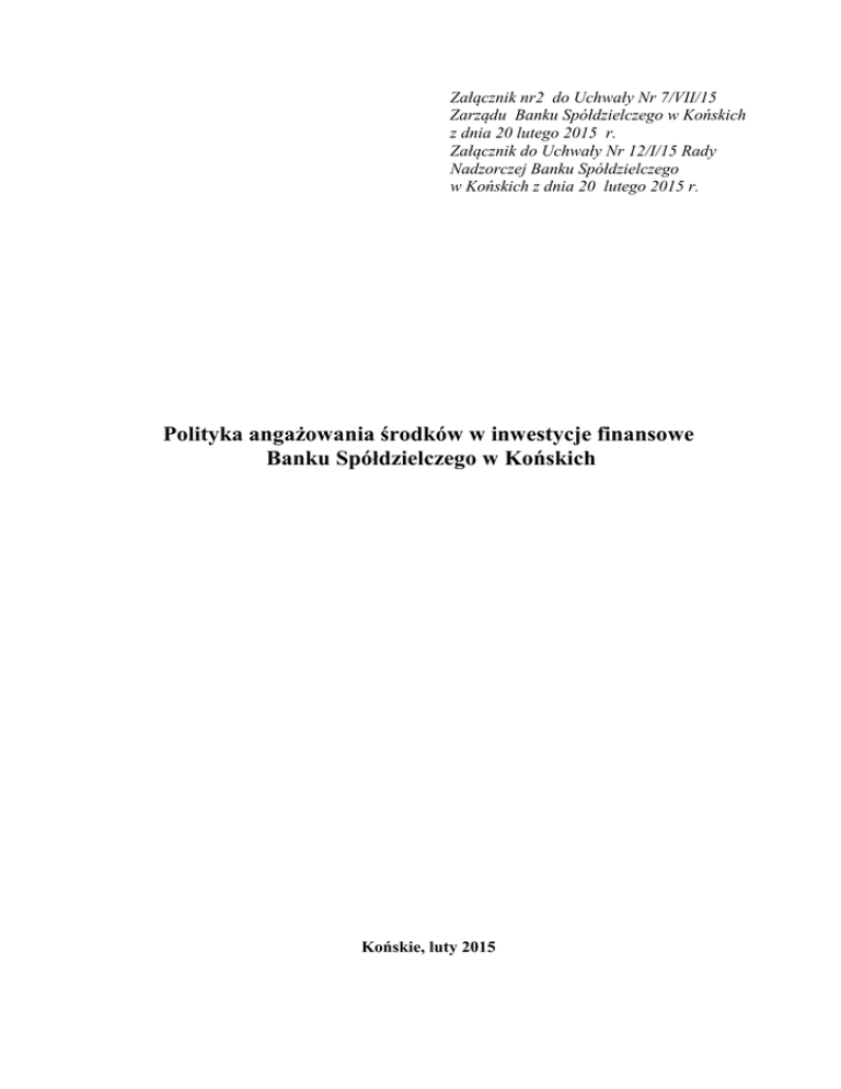 Załącznik nr2 do Uchwały Nr 7/VII/15 Zarządu Banku Spółdzielczego w Końskich z dnia 20 lutego 2015 r. Załącznik do Uchwały Nr 12/I/15 Rady Nadzorczej Banku Spółdzielczego w Końskich z dnia 20 lutego 2015 r. Polityka angażowania środków w inwestycje finansowe Banku Spółdzielczego w Końskich Końskie, luty 2015 1. Wprowadzenie §1. 1. Politykę angażowania środków w inwestycje finansowe Banku Spółdzielczego w Końskich 2. 3. 4. 5. opracowuje Zespół ryzyk i analiz ekonomicznych(ZRA), zgodnie z wytycznymi zawartymi w przepisach nadzorczych odnoszących się do koncentracji zaangażowań oraz w Rekomendacji B. Projekt polityki przedkładany jest Zarządowi Banku do akceptacji i Radzie Nadzorczej do zatwierdzenia. ZRA jest odpowiedzialny za przegląd i aktualizację polityki przynajmniej raz w roku, w szczególności w przypadku zmiany strategii Banku i tworzenia planu finansowego na dany okres obrachunkowy. Polityka angażowania środków w inwestycje finansowe oraz jej realizacja podlega corocznemu przeglądowi zarządczemu, który jest przeprowadzany przez Komisję ds. przeglądów zarządczych. Polityka angażowania środków w inwestycje finansowe obejmuje następujące zagadnienia: – cele Banku w zakresie angażowania środków w inwestycje finansowe, – struktura inwestycji finansowych Banku, – akceptowany poziom ryzyka inwestycji, – zasady budowy portfela inwestycji, – metody monitorowania ryzyka inwestycji . §2. 1. Inwestycje (zaangażowania) to inwestowanie środków finansowych Banku w celu powiększenia ich wartości (osiągnięcia korzyści finansowych) poprzez wszelkie długoterminowe zaangażowanie w instrumenty rynku kapitałowego , pieniężnego, nieruchomości lub wszelkie inne przedsięwzięcia mogące przynosić zyski bankowi. 2. Do instrumentów finansowych można zaliczyć wszelkie papiery wartościowe, jednostki uczestnictwa w funduszach inwestycyjnych, wkłady i udziały w spółkach i spółdzielniach, dopłaty do kapitału w spółkach, inwestycje w instrumenty rynku pieniężnego , nabywanie nieruchomości , gwarantowanie emisji i inne zaangażowania. 3. Postanowienia niniejszej Polityki nie dotyczą zasad lokowania środków finansowych w akcję kredytową oraz w lokaty w banku zrzeszającym. 4. Schemat organizacyjny angażowania środków w inwestycje finansowe Banku zawiera Załącznik do niniejszej Polityki. 2. Cele Banku w zakresie angażowania środków w inwestycje finansowe §3. 1. Podstawowym celem działalności inwestycyjnej Banku jest uzupełnienie bieżącej działalności i odpowiednie wykorzystanie nadwyżek finansowych z zamiarem zwiększenia rentowności działalności przy zachowaniu maksymalnego bezpieczeństwa i dywersyfikacji aktywów. 2. Dodatkowym celem inwestycyjnym jest budowa portfela aktywów płynnych celem zabezpieczenia zapasu aktywów płynnych. 3. Z reguły większemu ryzyku odpowiada większy potencjalny zysk, dlatego w działalności inwestycyjnej zmierzamy do ograniczania ryzyka do akceptowalnego poziomu. 4. Najważniejszymi sposobami obniżania ryzyka inwestycyjnego Banku jest inwestowanie w wiele różnych instrumentów finansowych oraz dokładna ocena potencjalnego ryzyka poszczególnych inwestycji. Nie oznacza to jednak, że w ten sposób można całkowicie wyeliminować ryzyko związane z inwestycjami. 1 5. Przy dywersyfikacji portfela inwestycyjnego Bank powinien uwzględniać w szczególności: - rodzaj inwestycji finansowych(w tym np. forma prawna podmiotu w który bank angażuje środki), - bieżącą i przewidywaną sytuację ekonomiczno – finansową, - powiązania organizacyjne i kapitałowe podmiotów w które Bank angażuje się kapitałowo, - zaangażowanie kredytowe Banku w te podmioty, - termin wykupu przez emitenta dłużnych papierów wartościowych , z uwzględnieniem ewentualnej możliwości przedstawienia ich do wcześniejszego wykupu zarówno przez emitenta jak i nabywcę, - płynność dokonanych inwestycji finansowych, - oczekiwaną rentowność, - dywersyfikację branżową. 6. Głównym ryzykiem dla inwestycji Banku jest niebezpieczeństwo pogorszenia się sytuacji gospodarczej Polski, które może doprowadzić do niekorzystnych zmian cen na rynkach finansowych i obniżyć rentowność inwestycji Banku. Szczególnie groźne dla rentowności inwestycji mogą być takie zjawiska jak zahamowanie wzrostu gospodarczego, narastanie deficytu na rachunku obrotów bieżących, długu publicznego i wzrost inflacji. Istotna dla Polski jest też sytuacja gospodarcza i polityczna w innych krajach powiązanych z Polską, która może niekorzystnie wpływać na sytuację gospodarczą i polityczną w naszym kraju. § 4. W celu ograniczania ryzyka inwestycji finansowych Bank ustala system limitów stanowiący jednocześnie akceptowany poziom ryzyka inwestycji i będący elementem niniejszej Polityki. 3. Struktura inwestycji finansowych Banku § 5. 1. Przeważająca część aktywów Banku poza działalnością kredytową i lokatami w banku zrzeszającym jest inwestowana w bezpieczne papiery wartościowe. Decydującym czynnikiem wpływającym na opłacalność takich inwestycji są zmiany stóp procentowych. 2. Zasady zarządzania portfelem inwestycyjnym zawiera Instrukcja angażowania środków w inwestycje finansowe. § 6. 1. Bank angażuje się w następujące instrumenty finansowe: a) b) c) d) e) f) akcje banku zrzeszającego, obligacje banku zrzeszającego, jednostki uczestnictwa w Union Investment TFI S.A. oraz BPS TFI S.A., obligacje komunalne, obligacje skarbowe, obligacje komercyjne podmiotów (w tym banków) o dobrej kondycji finansowej notowane na aktywnym rynku lub zabezpieczone, g) bony pieniężne. 2. Bank w celu dywersyfikacji portfela posiadanych instrumentów finansowych i minimalizacji ryzyka może angażować środki w : a) certyfikaty depozytowe banku zrzeszającego, 2 b) jednostki uczestnictwa w funduszach inwestycyjnych innych niż wymieniony w ust.1 lit. c) niniejs