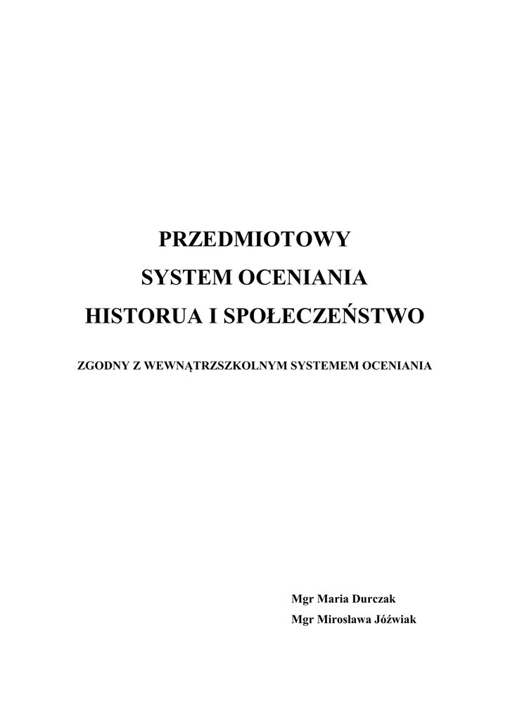 PRZEDMIOTOWY SYSTEM OCENIANIA HISTORUA I SPOŁECZEŃSTWO ZGODNY Z WEWNĄTRZSZKOLNYM SYSTEMEM OCENIANIA Mgr Maria Durczak Mgr Mirosława Jóźwiak PRZEDMIOTOWY SYSTEM OCENIANIA – HISTORIA I SPOŁECZEŃSTWO PODSTAWA PRAWNA Rozporządzenie w sprawie zasad oceniania, klasyfikowania i promowania uczniów i słuchaczy oraz przeprowadzania egzaminów i sprawdzianów w szkołach publicznych. Test jednolity z 1999r. (Dz. U. nr 401, poz.413 ze zmianami), z 2001r. (Dz. U. nr 29, poz.323 ze zmianami), z 2004 r. (Dz. U. nr 199, poz.2046 ze zmianami), z 2007 r.(Dz. U. nr 83, poz. 562 ze zmianami) i Rozporządzenie MEN z dn. 10.06.2015 PRZEDMIOTOWY SYSTEM OCENIANIA – HISTORIA I SPOŁECZEŃSTWO Spis treści: I. Kontrakt z uczniami i rodzicami. II. Narzędzia, czas pomiaru i obserwacji ucznia. III. Obszary aktywności. IV. Kryteria oceny semestralnej i rocznej. V. Informacja zwrotna ( nauczyciel – uczeń, nauczyciel – rodzic, nauczyciel – wychowawca klasy – pedagog). VI. Ewaluacja przedmiotowego systemu oceniania. PRZEDMIOTOWY SYSTEM OCENIANIA – HISTORIA I SPOŁECZEŃSTWO I. KONTRAKT Z UCZNIEM I RODZICAMI Uczeń ma obowiązek: 1. Posiadać zestaw podręczników używanych w danym roku szkolnym. 2. Prowadzić zeszyt ćwiczeń. 3. W razie nieobecności uzupełnić powstałe braki. 4. Systematycznie wykonywać zadania domowe. 5. Być przygotowanym na każdą lekcję. 6. Brak zadania domowego zgłaszać przed lekcją. 7. Dbać o piękno mowy polskiej, a w wypowiedziach stosować poprawną polszczyznę. Uczeń ma prawo: 1. Poprawić ocenę niedostateczną ze sprawdzianu. Uczeń może poprawić niekorzystny wynik sprawdzianu w ciągu 21 dni od daty oddania sprawdzianu. 2. Otrzymać oprócz stopnie (1 – 6) informację zwrotną w formie komentarza (w przypadku dłuższych prac pisemnych, sprawdzianów, testów i prac domowych) zgodnie z następującym schematem: - co zrobił dobrze, - co w swej pracy powinien poprawić - podpowiedź, w jaki sposób ma poprawić swoją pracę - wskazówki na przyszłość 3. Otrzymać ustną informację zwrotną wg powyższego schematu na bieżąco po kartkówce, odpowiedzi ustnej, pracy w grupie, pracy indywidualnej, pracy w ramach projektu. Sprawdzanie i ocenianie wiadomości: 1. Uczeń może raz w semestrze zgłosić nieprzygotowanie do lekcji (nieznajomość materiału z poprzedniej lekcji, brak zeszytu ćwiczeń, zeszytu przedmiotowego, materiałów dodatkowych, o które prosił nauczyciel). Nieprzygotowania są zaznaczane w dzienniku i powyżej jednego mają wpływ na ocenę z przedmiotu. 2. Uczeń może nie odrobić zadania domowego jeden raz w semestrze. Brak zadania odnotowywany jest w dzienniku. 3. Uczniowie, którzy nie odrabiają zadań domowych, nie mogą, gdy waha im się ocena na koniec semestru, zdawać na ocenę wyższą. 4. Uczniowie oceniani będą za wypowiedzi ustne, zadania dodatkowe, aktywność na lekcji i pracę w grupach oraz zrealizowane projekty. 5. W ciągu każdego semestru uczniowie pisać będą: sprawdziany z poszczególnych działów (2-3), niezapowiedziane kartkówki z jednej lekcji (w miarę potrzeb). PRZEDMIOTOWY SYSTEM OCENIANIA – HISTORIA I SPOŁECZEŃSTWO II. NARZĘDZIA, CZAS POMIARU I OBSERWACJI UCZNIA Pomiar osiągnięć uczniów odbywa się za pomocą takich narzędzi: zapowiedziane sprawdziany prowadzenie zeszytu przedmiotowego i zeszytu ćwiczeń niezapowiedziane kartkówki (materiał z 3 ostatnich lekcji, ocenione w ciągu tygodnia) odpowiedzi ustne zadania domowe pisemne i ustne (prace krótko - i długoterminowe) samodzielne i grupowe prace na lekcji aktywność podczas lekcji obserwacja ucznia: - przygotowanie do lekcji - systematyczność i pilność - samodzielność - prezentacja własnej pracy - chęć do podejmowania zadań dodatkowych - zachowanie i praca podczas lekcji III. OBSZARY AKTYWNOŚCI Każdy uczeń ma możliwość wykazania się wiadomościami i umiejętnościami podczas następujących czynności: podczas lekcji: - ćwiczenia w operowaniu pojęciami historycznymi - sprawdziany i kartkówki - odpowiedzi ustne - znajomość problematyki lekcji - przygotowanie zadań i tematów dodatkowych - posługiwanie się mapą - rozwiązywanie zadań w zeszycie ćwiczeń - gromadzenie dodatkowych materiałów, wycinków prasowych itp. poza lekcją: - przygotowanie zadania domowego - prace samodzielne krótsze i długoterminowe - przygotowanie do lekcji. PRZEDMIOTOWY SYSTEM OCENIANIA – HISTORIA I SPOŁECZEŃSTWO IV. KRYTERIA OCENY SEMESTRALNEJ I ROCZNEJ 1. Ocenę semestralną (roczną) wystawia nauczyciel najpóźniej na tydzień przed terminem klasyfikacji semestralnej ( rocznej). 2. O zagrożeniu oceną niedostateczną, na miesiąc przed klasyfikacją, nauczyciel informuje ucznia oraz wychowawcę klasy, który powiadamia zainteresowanych rodziców. 3. Wszystkie formy aktywności ucznia oceniane są w skali stopniowej od 1 do 6. 4. Punkty uzyskane z prac klasowych i sprawdzianów przeliczane są na stopnie wg następującej skali: % punktów 100 -98 97 -90 89 - 70 69 - 50 49 -30 29 - 0 ocena cel bdb db dst dp ndst PRZEDMIOTOWY SYSTEM OCENIANIA – HISTORIA I SPOŁECZEŃSTWO Ocenę celującą otrzymuje uczeń, który samodzielnie rozwija własne zainteresowania i zdolności, bierze udział i osiąga sukcesy w konkursach przedmiotowych, wykonuje dodatkowe zadania zaproponowane przez nauczyciela, opanował umiejętności z zakresu języka polskiego przewidziane w programie nauczania. 5. Ocena semestralna wynika z zaliczenia większości obszarów aktywności na danym poziomie edukacyjnym i nie jest średnią arytmetyczną ocen cząstkowych. 6. Ocenę roczną wystawia się na podstawie uzyskanych ocen w ciągu całego roku szkolnego z uwzględnieniem rozwoju ucznia. 7. Podczas wystawiania oceny semestralnej i rocznej brane będzie pod uwagę zaangażowanie ucznia w przyswajaniu wiedzy i nabywaniu umiejętności, a także systematyczna praca ucznia i dodatkowo ocena za I semestr przy ocenie rocznej. 8. Pod koniec 