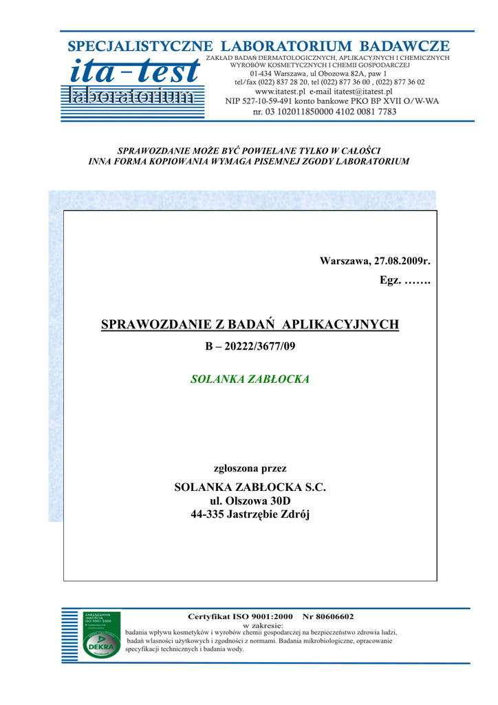 SPRAWOZDANIE MOŻE BYĆ POWIELANE TYLKO W CAŁOŚCI INNA FORMA KOPIOWANIA WYMAGA PISEMNEJ ZGODY LABORATORIUM Warszawa, 27.08.2009r. Egz. ……. SPRAWOZDANIE Z BADAŃ APLIKACYJNYCH B – 20222/3677/09 SOLANKA ZABŁOCKA zgłoszona przez SOLANKA ZABŁOCKA S.C. ul. Olszowa 30D 44-335 Jastrzębie Zdrój Sprawozdanie z badań aplikacyjnych B - 20222/3677/09 Zlecenie zarejestrowane pod nr B-20222/3677/09 w dniu 20.07.2009 oraz próbki laboratoryjne preparatu dostarczone do badań w opakowaniach zastępczych, 1. Podstawa wykonania badań Ujemne wyniki badań dermatologicznych preparatu (brak odczynów dodatnich w teście kontaktowym u ludzi) wykonanych w S. L. B. „ITA – TEST”. 2. Opakowanie zastępcze – nieoznakowana butelka z tworzywa sztucznego Charakterystyka wyrobu Wygląd – przejrzysta ciecz barwy słomkowej z widocznym brunatnym osadem. Zapach – delikatny, swoisty. Ż 3. Przeznaczenie SOLANKA ZABŁOCKA przeznaczona jest jako dodatek do kąpieli. wyrobu Stosowana jako dodatek do kąpieli ciała: 4. usuwa zmęczenie, Oczekiwane odświeża, działanie działa wygładzająco, ujędrniająco i uelastyczniająco na skórę wyrobu: zmniejsza nadmierne rogowacenie naskórka, łagodzi stresy Ustawą z dnia 30 marca 2001r. o kosmetykach (Dz. U. Nr 42 poz. 473 wraz z późniejszymi uzupełnieniami) Art. 11 ust. 1 p.4 i 6 p.4 ocena wpływu kosmetyku na bezpieczeństwo zdrowia ludzi 5. Zakres badań zgodny z obejmująca badania dotyczące tolerancji skóry na badany preparat, w miejscu jego stosowania, p.6 potwierdzenie deklarowanych przez Producenta rodzajów działań – obejmujące badanie własności użytkowych zgłoszonego wyrobu. Strona 2 z 10 Sprawozdanie z badań aplikacyjnych B - 20222/3677/09 I. Badania aplikacyjne przeprowadzono pod kontrolą lekarza dermatologa na 6. Metoda badań odpowiednio dobranej grupie probantów-ochotników w warunkach domowych (panel domowy). Dobór probantów - ochotników do badań prowadzony był zgodnie z Procedurą Badawczą S.L.B. „ITA – TEST” PB 03/DA Do badań aplikacyjnych lekarz dermatolog zakwalifikował 16 kobiet w wieku 37 – 75 lat, wśród których 6 osób miało normalną skórę ciała, 9 kobiet skórę suchą, a 1 skórę normalną ze skłonnością do przetłyszczania się w okolicach łojotokowych tułowia. 7. Dobór probantów Skóra ciała wszystkich probantek była badana przez lekarza dermatologa przed – ochotników do rozpoczęciem badania oraz po ich zakończeniu. W chwili przystąpienia do badań badań nie miała podrażnień i była bez zmian chorobowych wymagających leczenia farmakologicznego. Uczestniczącym w badaniach nie stawiano żadnych specjalnych wymagań wychodząc z założenia, że należy badać działanie tego typu wyrobu w warunkach naturalnych, w których będzie on w praktyce stosowany. I. BADANIA APLIKACYJNE ▰ Warunki domowe (panel domowy) Zakwalifikowane do badań przez lekarza dermatologa probantki otrzymały po 1 opakowaniu badanego preparatu wraz ze specjalnie opracowaną ankietą (z 10punktową skalą ocen, której była przypisana ocena słowna) oraz zostały zobowiązane do: 8. Sposób prowadzenia zastosowania otrzymanej solanki do 3-ech kąpieli w wannie zgodnie z podanym badań sposobem użycia: „Przed kąpielą z użyciem solanki skórę ciała dokładnie umyć pod prysznicem i osuszyć. Następnie do napełnionej wodą wanny dodać 1/3 butelki preparatu. Kąpiel powinna trwać od 10 do 30 minut. Następnie delikatnie osuszyć skórę ręcznikiem” nie stosowania w tym czasie innych wyrobów o identycznym lub analogicznym przeznaczeniu co badany, Strona 3 z 10 Sprawozdanie z badań aplikacyjnych B - 20222/3677/09 w przypadku wystąpienia jakichkolwiek negatywnych objawów na skórze: natychmiastowego przerwania stosowania wyrobu, bezzwłocznego zgłoszenia tych objawów lekarzowi dermatologowi w SLB „ITA – TEST”, szczegółowego odnotowywania w ankietach uwag dotyczących własności użytkowych badanego wyrobu, zgłaszania się do lekarza dermatologa na badania kontrolne w trakcie trwania badania jaki i bezpośrednio po jego zakończeniu. Opinie probantów - ochotników w zakresie własności użytkowych badanej SOLANKI ZABŁOCKIEJ opracowano w formie tabelarycznych i graficznych zapisów stanowiących integralną część niniejszego sprawozdania /Załączniki nr 1-2/ 9. Czas trwania badań Badania aplikacyjne zakończone sprawozdaniem, trwały od 27.07.2009r. do 27.08.2009r i ukończyły je wszystkie przystępujące do nich osoby. Strona 4 z 10 Sprawozdanie z badań aplikacyjnych B - 20222/3677/09 WYNIKI BADAŃ OBEJMUJĄ I. Ocenę wpływu preparatu na bezpieczeństwo zdrowia ludzi obejmującą badania dotyczące tolerancji skóry ciała na SOLANKĘ ZABŁOCKĄ Art.11 ust.1 p.4. Ustawy z dnia 30 marca 2001r o kosmetykach (Dz. U. Nr 42 poz. 473 z wraz z późniejszymi uzupełnieniami) II. Potwierdzenie rodzajów działań – obejmujące badanie własności użytkowych SOLANKI ZABŁOCKIEJ Art.11 ust.1 p.6. Ustawy z dnia 30 marca 2001r o kosmetykach (Dz. U. Nr 42 poz. 473 z wraz z późniejszymi uzupełnieniami) Strona 5 z 10 Sprawozdanie z badań aplikacyjnych B - 20222/3677/09 I. Ocena wpływu kosmetyku na bezpieczeństwo zdrowia ludzi dokonana przez lekarza dermatologa – obejmująca badania dotyczące tolerancji skóry ciała na SOLANKĘ ZABŁOCKĄ (Art. 11 ust.1 p.4 Ustawa z dnia 30 marca 2001r. o kosmetykach ( Dz. U. 42 poz. 473 wraz późniejszymi zmianami ) Na podstawie badań lekarskich oraz wywiadów zebranych od probantów-ochotników (zakwalifikowanych do badań) stwierdzam, iż badana SOLANKA ZABŁOCKA stosowana dokapieli relaksacyjnych: Nie wywoływała negatywnych objawów na skórze ciała takich jak: obrzęk, zaczerwienienie, pieczenie, mrowienie lub świąd, tak w czasie trwania badań, jak i po ich zakończeniu u wszystkich testujących ją probantek - ochotniczek. Była bardzo dobrze tolerowana przez skórę w miejscu stosowania. Nie wysuszała nadmiernie