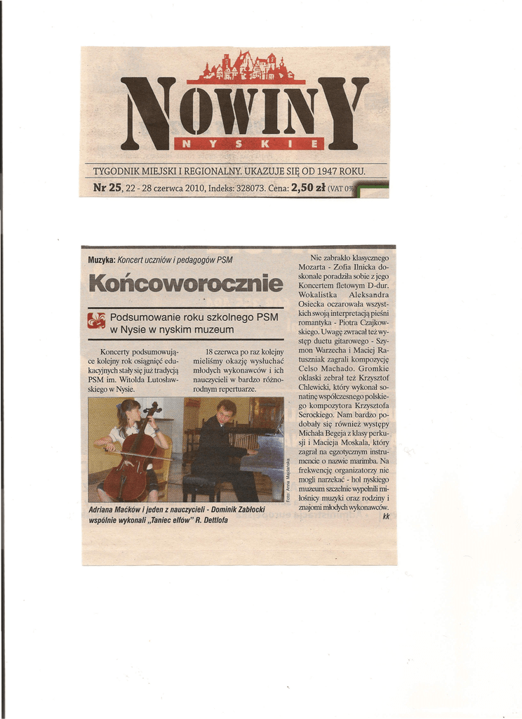 N Y S K I E TYGODNIK MIEJSKI I REGIONALNY. UKAZUJE SIĘ OD 1947 ROKU. Nr 25, 22 - 28 czerwca 2,50 zł 2010, IndeR~;~D28.073. dna: Muzyka: Koncert uczniów i pedagogów PSM Końcoworocznie fa Podsumowanie roku szkolnego PSM w Nysie w nyskim muzeum Koncerty podsumowujące kolejny rok osiągnięć edukacyjnych stały się już tradycją PSM im. Witolda Lutosławskiego w Nysie. 18 czerwca po raz kolejny mieliśmy okazję wysłuchać młodych wykonawców i ich nauczycieli w bardzo różnorodnym repertuarze. i ł ~ ~ Si ,j' Adriana Maćków i jeden z nauczycieli - Dominik Zabłocki wspólnie wykonali "Taniec ellów" R. Delt/ola (VAT oo/c Nie zabrakło klasycznego Mozarta - Zofia llnicka doskonale poradziła sobie z jego Koncertem fletowym D-dur. Wokalistka Aleksandra Osiecka oczarowała wszystkich swoją interpretacjąpicśni romantyka - Piotra Czajkowskiego. Uwagę zwracał też występ duetu gitarowego - Szymon Warzecha i Maciej Ratuszniak zagrali kompozycję Celso Machado. Gromkie oklaski zebrał też Krzysztof Chlewicki, który wykonał sonatinę współczesnego polskiego kompozytora Krzysztofa Serockiego. Nam bardzo podobały się również występy Michała Begeja z klasy perku- . sji i Macieja Moskala, który zagrał na egzotycznym instrumencie o nazwie marimba Na frekwencję organizatorzy nie mogli narzekać - hol nyskiego ID uzeum szczelnie wypełnili miłośnicy muzyki oraz rodziny i znajomi młodych wykonawców. kk