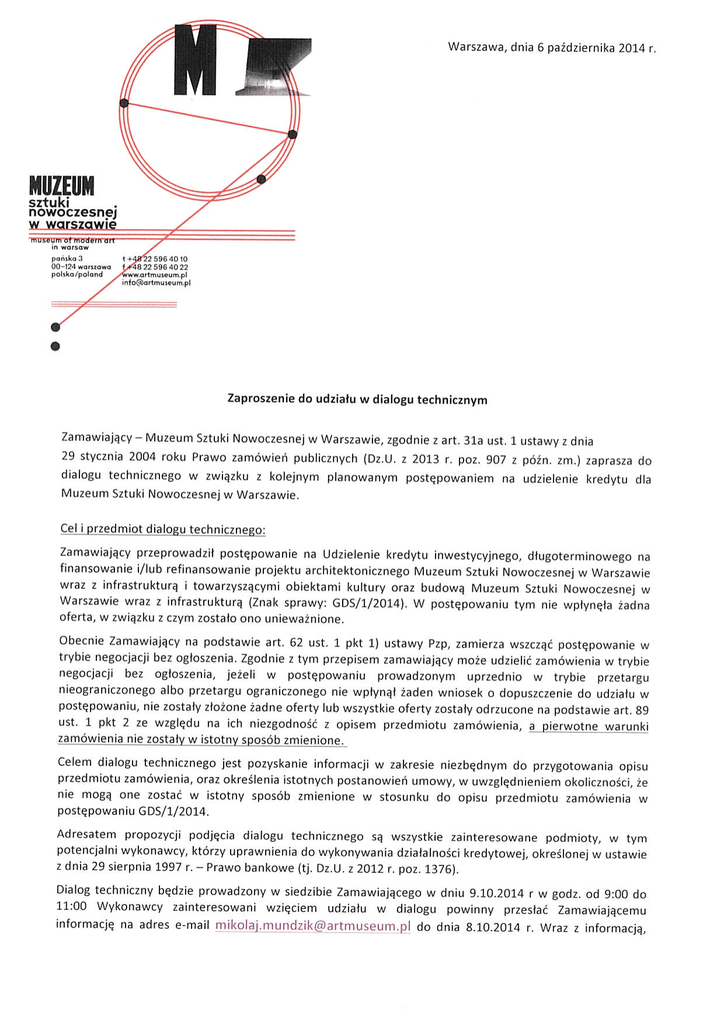 Załącznik nr 1 Przedmiotem zamówienia jest udzielenie kredytu inwestycyjnego długoterminowego na poniższych zasadach: 1.1. 1.2. 1.3. 1.4. 1.5. Udzielenie Muzeum Sztuki Nowoczesnej w Warszawie kredytu inwestycyjnego, długoterminowego o okresie udostępnienia i spłat wynoszących łącznie 29 lat w walucie PLN w kwocie maksymalnej do 270.000.000 PLN. Kredyt zostanie przeznaczony na sfinansowanie i/lub refinansowanie kosztów: 1.2.1. projektu architektonicznego Muzeum Sztuki Nowoczesnej w Warszawie wraz z infrastrukturą i towarzyszącymi obiektami kultury; 1.2.2. nadzoru nad przygotowaniem projektu architektonicznego Muzeum Sztuki Nowoczesnej w Warszawie wraz z infrastrukturą i towarzyszącymi obiektami kultury; 1.2.3. budowy Muzeum Sztuki Nowoczesnej w Warszawie wraz infrastrukturą; 1.2.4. nadzoru nad realizacją robót budowlanych, o których mowa w 1.2.3.; 1.2.5. obsługi prawnej i innych usług doradczych oraz administracyjnych całości procesu inwestycyjnego; 1.2.6. ponoszonych na płace osób zatrudnionych przy obsłudze procesu inwestycyjnego budowy Muzeum oraz wydatki administracyjne związane z tym procesem. W załączniku 5 do SIWZ przedstawiono indykatywny (orientacyjny) harmonogram ciągnień w ujęciu miesięcznym w latach 2014 -‐ 2020, który może ulec zmianie w zależności od rzeczywistych potrzeb Zamawiającego wynikających z harmonogramów płatności zawartych w umowach z wykonawcami poszczególnych prac. Zamawiający wymaga, aby odsetki z tytułu kredytu naliczane były: 1.4.1. od 1.02.2019 r. do momentu spłaty kredytu -‐ w oparciu o stawkę WIBOR 3M obowiązującą na 2 dni robocze przed rozpoczęciem trzymiesięcznego okresu obrachunkowego + marża Banku. Przy czym okres obrachunkowy wynosi 3 miesiące i rozpoczyna się kolejno w dniach 1 lutego, 1 maja, 1 sierpnia oraz 1 listopada, a kończy kolejno w dniach 30 kwietnia, 31 lipca, 31 października oraz 31 stycznia; 1.4.2. w okresie karencji, tj. od dnia udzielenia pierwszej transzy kredytu do dnia 31.01.2019 r. odsetki od kredytu będą spłacane przez Zamawiającego w oparciu o stawkę WIBOR 3M + marża Banku, przy czym całkowita kwota odsetek w roku 2014 nie przekroczy kwoty 25.000 PLN, w roku 2015 kwoty 100.000 PLN, w roku 2016 kwoty 100.000 PLN, w roku 2017 kwoty 100.000 PLN, w roku 2018 kwoty 100.000 PLN, w okresie od 01.01.2019 r. do 31.01.2019 r. kwoty 25.000PLN, przy uwzględnieniu zapisów pkt. 1.7 i 1.8 SIWZ. Zamawiający nie dopuszcza możliwości kapitalizacji odsetek. 1.6. Marża wskazana w ofercie Wykonawcy (Banku) nie może zostać podwyższona w trakcie trwania umowy kredytowej. 1.7. Wykonawca umożliwia wcześniejszą spłatę kredytu w części lub w całości bez ponoszenia przez Zamawiającego jakichkolwiek kosztów związanych lub wynikających z wcześniejszej spłaty kredytu, w szczególności prowizji, opłat bankowych i kar umownych. W przypadku spłaty kredytu we wcześniejszym terminie, odsetki liczone będą do dnia spłaty kredytu, a nie do końca umowy kredytowej. Jeżeli jednak wcześniejsza spłata kredytu nastąpi w okresie karencji, Zamawiający spłaci odsetki powstałe w okresie kredytowania, tj. od dnia zaciągnięcia zobowiązania do dnia jego spłaty w okresie karencji naliczając ich wysokość 1 według stawki WIBOR 3M + marża Banku. W przypadku skorzystania przez Zamawiającego z prawa wcześniejszej spłaty kredytu w części lub całości, Wykonawcy nie przysługują w stosunku do Zamawiającego jakiekolwiek roszczenia z tytułu utraconych korzyści wynikających lub związanych z wcześniejszą spłatą. 1.8. Wykonawca zapewnia Zamawiającemu możliwość rezygnacji z wykorzystania w części lub całości kredytu bez ponoszenia przez Zamawiającego jakichkolwiek kosztów związanych lub wynikających z ww. rezygnacją, w szczególności prowizji, opłat bankowych i kar umownych. Jeżeli jednak rezygnacja z kredytu nastąpi w okresie karencji, Zamawiający spłaci odsetki powstałe w okresie kredytowania, tj. od dnia zaciągnięcia zobowiązania do dnia jego spłaty w okresie karencji naliczając ich wysokość według stawki WIBOR 3M + marża Banku. W przypadku skorzystania przez Zamawiającego z prawa rezygnacji z wykorzystania w części lub całości kredytu, Wykonawcy nie przysługują w stosunku do Zamawiającego jakiekolwiek roszczenia z tytułu utraconych korzyści wynikających z niezrealizowanej umowy kredytowej. 1.9. Kredyt będzie spłacany po upływie okresu karencji, od dnia 30.04.2019 r., tj. od dnia zapadalności pierwszej raty kredytowej, do dnia 31.10.2042 r. z zastrzeżeniem uprawnień Zamawiającego opisanych w pkt 1.7. i 1.8. 1.10. Po upływie okresu karencji, tj. od 01.02.2019 r. spłaty rat kredytu oraz odsetek dokonywane będą zgodnie z harmonogramem wskazanym w pkt. 1.11, do ostatniego dnia danego okresu obrachunkowego, poczynając od dnia 30.04.2019 r. 1.11. W poniższej tabeli przedstawiono harmonogram spłat rat kredytu. W przypadku, gdy pociągnięta zostanie kwota niższa niż 270.000.000 PLN, zakłada się, że raty kredytu pozostaną na poniższym poziomie, ale spłata kredytu nastąpi szybciej niż do 2042 r., a ostatnia rata będzie równa różnicy pomiędzy zaciągniętą kwotą finansowania, a sumą spłat rat kredytu dokonanych do momentu zapłaty ostatniej raty. Spłata odsetek będzie następować w tych samych dniach, co spłata rat kredytu, a jej wartość będzie uzależniona od wartości stawki WIBOR 3M oraz marży Banku zgodnie z zapisami pkt 1.4.1. Poniższy harmonogram ma charakter indykatywny (orientacyjny) a Zamawiający zastrzega sobie możliwość jego zmiany. Numer raty Data spłaty raty Wartość raty [PLN] 30 kwietnia 2019 1.000.000,00 31 lipca 2019 0 31 października 2019 0 31 stycznia 2020 3.000.000,00 30 kwietnia 2020 3.000.000,00 31 lipca 2020 3.000.000,00 31 października 2020 3.000.000,00 31 stycznia 2021 3.000.000,00 30 kwietnia 2021 3.000.000,00 31 lipca 2021 3.000.000,00 31 października 202