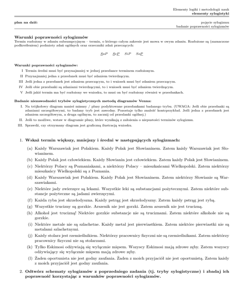 Elementy logiki i metodologii nauk elementy sylogistyki plan na dziś: pojęcie sylogizmu badanie poprawności sylogizmów Warunki poprawności sylogizmów Termin rozłożony w zdaniu subsumpcyjnym – termin, o którego całym zakresie jest mowa w owym zdaniu. Rozłożone są (zaznaczone podkreśleniem) podmioty zdań ogólnych oraz orzeczniki zdań przeczących: SaP SeP SiP SoP Warunki poprawności sylogizmów: I Termin średni musi być przynajmniej w jednej przesłance terminem rozłożonym. II Przynajmniej jedna z przesłanek musi być zdaniem twierdzącym. III Jeśli jedna z przesłanek jest zdaniem przeczącym, to i wniosek musi być zdaniem przeczącym. IV Jeśli obie przesłanki są zdaniami twierdzącymi, to i wniosek musi być zdaniem twierdzącym. V Jeśli jakiś termin ma być rozłożony we wniosku, to musi on być rozłożony również w przesłankach. Badanie niezawodności trybów sylogistycznych metodą diagramów Venna: I. Na trójkołowy diagram nanieś minusy / plusy podyktowane przesłankami badanego trybu. (UWAGA: Jeśli obie przesłanki są zdaniami szczegółowymi, to badany tryb jest zawodny. Pozostaje tylko znaleźć kontrprzykład. Jeśli jedna z przesłanek jest zdaniem szczegółowym, a druga ogólnym, to zacznij od przeslanki ogólnej.) II. Jeśli to możliwe, wstaw w diagramie plusy, które wynikają z założenia o niepustości terminów sylogizmu. III. Sprawdź, czy otrzymany diagram jest graficzną ilustracją wniosku. 1. Wskaż termin większy, mniejszy i średni w następujących sylogizmach: (a) Każdy Warszawiak jest Polakiem. Każdy Polak jest Słowianinem. Zatem każdy Warszawiak jest Słowianinem. (b) Każdy Polak jest człowiekiem. Każdy Słowianin jest człowiekiem. Zatem każdy Polak jest Słowianinem. (c) Niektórzy Polacy są Poznaniakami, a niektórzy Polacy – mieszkańcami Wielkopolski. Zatem niektórzy mieszkańcy Wielkopolski są z Poznania. (d) Każdy Warszawiak jest Polakiem. Każdy Polak jest Słowianinem. Zatem niektórzy Słowianie są Warszawiakami. (e) Niektóre jady zwierzęce są lekami. Wszystkie leki są substancjami pożytecznymi. Zatem niektóre substancje pożyteczne są jadami zwierzęcymi. (f) Każda ryba jest skrzelodyszna. Każdy pstrąg jest skrzelodyszny. Zatem każdy pstrąg jest rybą. (g) Wszystkie trucizny są gorzkie. Arszenik nie jest gorzki. Zatem arszenik nie jest trucizną. (h) Alkohol jest trucizną! Niektóre gorzkie substancje nie są truciznami. Zatem niektóre alkohole nie są gorzkie. (i) Niektóre metale nie są szlachetne. Każdy metal jest pierwiastkiem. Zatem niektóre pierwiastki nie są metalami szlachetnymi. (j) Każdy stolarz jest rzemieślnikiem. Niektórzy pracownicy fizyczni nie są rzemieślnikami. Zatem niektórzy pracownicy fizyczni nie są stolarzami. (k) Tylko Eskimosi odżywiają się wyłącznie mięsem. Wszyscy Eskimosi mają zdrowe zęby. Zatem wszyscy odżywiający się wyłącznie mięsem mają zdrowe zęby. (l) Żaden oportunista nie jest godny zaufania. Żaden z moich przyjaciół nie jest oportunistą. Zatem każdy z moich przyjaciół jest godny zaufania. 2. Odtwórz schematy sylogizmów z poprzedniego zadania (tj. tryby sylogistyczne) i zbadaj ich poprawność korzystając z warunków poprawności sylogizmów. 3. Zbadaj poprawność poniższych sylogizmów: (a) sylogizmu o przesłankach: „Żaden koń nie jest płazem” i „Niektóre żaby nie są płazami” oraz wniosku „Niektóre konie nie są żabami”. (b) sylogizmu o przesłankach: „Niektóre ssaki są trawożerne” i „Żaden drapieżnik nie jest trawożerny” oraz wniosku „Niektóre drapieżniki nie są ssakami”. 4. Czy poniższe tryby są poprawne? Jeśli nie, wskaż, które warunki poprawności sylogizmów zostały w danym trybie naruszone. Jeśli tak, podaj nazwę trybu. P eM M aS SoP P aM M aS SoP M oP SeM SeP P aM SaM SiP M aP SeM SeP P eM SaM SaP M aP SiM SiP 5. Uzupełnij (na wszystkie możliwe sposoby) brakującą przesłankę tak, aby otrzymać wnioskowanie, którego schematem jest poprawny tryb sylogistyczny: Każdy stróż jest pracownikiem ochrony ??? Niektórzy woźni są pracownikami ochrony ??? Niektóre misie są zabawkami Niektóre zabawki są pluszakami 6. Rozważmy sylogizm o przesłankach postaci P iM , M eS i wniosku SiP . Które z następujących podstawień nazw za zmienne pozwala wykazać, że nie jest to sylogizm poprawny: (a) S – koń, M – płaz, P – ssak (b) S – płaz, M – ssak, P – koń (c) S – płaz, M – ssak, P – drapieżnik (d) S – ssak, M – płaz, P – drapieżnik 7. Sprawdź poprawność sylogizmów z zadań 4, 1 i 3 za pomocą diagramów Venna.
