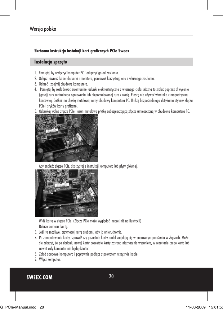 Wersja polska Skrócona instrukcja instalacji kart graficznych PCIe Sweex Instalacja sprzętu 1. Pamiętaj by wyłączyć komputer PC i odłączyć go od zasilania. 2. Odłącz również kabel drukarki i monitora, ponieważ korzystają one z własnego zasilania. 3. Odkręć i zdejmij obudowę komputera. 4. Pamiętaj by rozładować ewentualne ładunki elektrostatyczne z własnego ciała. Można to zrobić poprzez chwycenie (gołej) rury centralnego ogrzewania lub niepomalowanej rury z wodą. Proszę nie używać wkrętaka z magnetyczną końcówką. Dotknij na chwilę metalowej ramy obudowy komputera PC. Unikaj bezpośredniego dotykania styków złącza PCIe i styków karty graficznej. 5. Odszukaj wolne złącze PCIe i usuń metalową płytkę zabezpieczającą złącze umieszczoną w obudowie komputera PC. Aby znaleźć złącze PCIe, skorzystaj z instrukcji komputera lub płyty głównej. Włóż kartę w złącze PCIe. (Złącze PCIe może wyglądać inaczej niż na ilustracji) Dobrze zamocuj kartę. 6. Jeśli to możliwe, przymocuj kartę śrubami, aby ją unieruchomić. 7. Po zamontowaniu karty, sprawdź czy pozostałe karty nadal znajdują się w poprawnym położeniu w złączach. Może się zdarzyć, że po dodaniu nowej karty pozostałe karty zostaną nieznacznie wysunięte, w rezultacie czego karta lub nawet cały komputer nie będą działać. 8. Załóż obudowę komputera i poprawnie podłącz z powrotem wszystkie kable. 9. Włącz komputer. IG_PCIe-Manual.indd 20 20 11-03-2009 15:01:53 Wersja polska Instalacja oprogramowania Po uruchomieniu komputera karta graficzna zostanie automatycznie wykryta. System Windows zażąda sterowników karty. Anuluj instalację. Włóż płytę Sweex CD-ROM do napędu CD-ROM komputera. Płyta CD-ROM zostanie uruchomiona automatycznie i wyświetli się menu. Wybierz opcję zainstalowania sterowników. Konfiguracja Po udanej instalacji do skonfigurowania karty graficznej można użyć dołączonego oprogramowania. Kliknij ikonę w prawym dolnym rogu ekranu, aby przeprowadzić regulację ustawień dotyczących ekranu, rozdzielczości ekranu itp. zgodnie z osobistymi preferencjami. Gwarancja •Niniejszy produkt Sweex objęty jest dwuletnim okresem gwarancyjnym, rozpoczynającym się w dniu zakupu produktu. • W przypadku wady, należy zwrócić produkt do sprzedawcy z opisem wady, dowodem zakupu oraz wszystkimi akcesoriami. •Gwarancja zostaje anulowany w przypadku rozłożenia produktu, uszkodzenia fizycznego, nieprawidłowego wykorzystania, modyfikacji, naprawy przez nieautoryzowane osoby oraz wykorzystanie produktu do celów innych, niż jest przeznaczony. •Nie świadczymy usług dotyczących wsparcia technicznego oraz napraw w zakresie oprogramowania, baterii do ładowania oraz baterii zwykłych. Gwarancja realizowana jest jedynie w punkcie, gdzie produkt został zakupiony. Wszystkie nazwy marek oraz prawa powiązane wspomniane w niniejszej instrukcja obsługi są oraz pozostają własnością prawowitych właścicieli. IG_PCIe-Manual.indd 21 21 11-03-2009 15:01:53