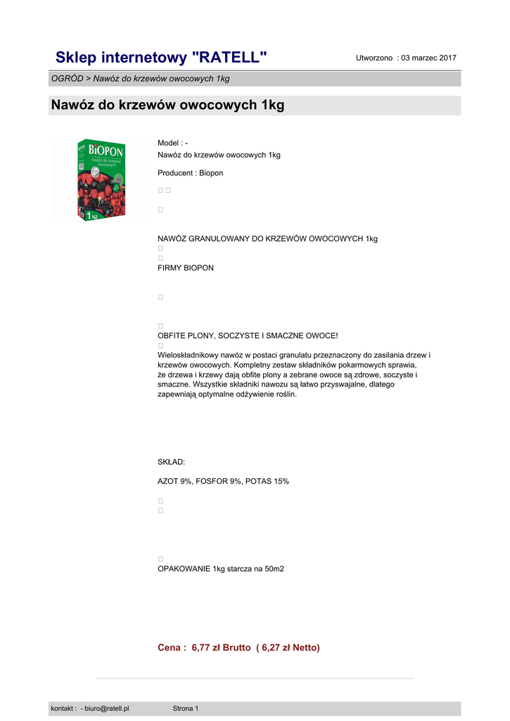 Sklep internetowy "RATELL" Utworzono : 03 marzec 2017 OGRÓD > Nawóz do krzewów owocowych 1kg Nawóz do krzewów owocowych 1kg Model : Nawóz do krzewów owocowych 1kg Producent : Biopon �� � NAWÓZ GRANULOWANY DO KRZEWÓW OWOCOWYCH 1kg � � FIRMY BIOPON � � OBFITE PLONY, SOCZYSTE I SMACZNE OWOCE! � Wieloskładnikowy nawóz w postaci granulatu przeznaczony do zasilania drzew i krzewów owocowych. Kompletny zestaw składników pokarmowych sprawia, że drzewa i krzewy dają obfite plony a zebrane owoce są zdrowe, soczyste i smaczne. Wszystkie składniki nawozu są łatwo przyswajalne, dlatego zapewniają optymalne odżywienie roślin. SKŁAD: AZOT 9%, FOSFOR 9%, POTAS 15% � � � OPAKOWANIE 1kg starcza na 50m2 Cena : 6,77 zł Brutto ( 6,27 zł Netto) kontakt : - [email protected] Strona 1 Sklep internetowy "RATELL" OGRÓD > Nawóz do krzewów owocowych 1kg Nawóz do krzewów owocowych 1kg Dostępność: Produkt dostępny w naszym sklepie od 15 czerwiec 2014 kontakt : - [email protected] Strona 2 Utworzono : 03 marzec 2017