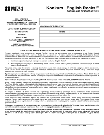 Konkurs „English Rocks!” FORMULARZ REJESTRACYJNY IMIĘ I NAZWISKO UCZESTNIKA KONKURSU IMIĘ I NAZWISKO RODZICA / OPIEKUNA PRAWNEGO UCZESTNIKA KOKURSU ADRES KORESPONDENCYJNY ULICA, NUMER BUDYNKU I LOKALU KOD POCZTOWY MIASTO TELEFON ADRES E-MAIL DATA URODZENIA UCZESTNIKA KONKURSU W PRZYPADKU ZDJĘĆ – IMIĘ I NAZWISKO FOTOGRAFA OŚWIADCZENIE RODZICA / OPIEKUNA PRAWNEGO UCZESTNIKA KONKURSU Poprzez podpisanie tego oświadczenia, wyraża Pan/Pani zgodę na gromadzenie oraz przetwarzanie przez British Council przekazanych danych osobowych - zarówno teraz jak i w przyszłości - do celów wymienionych poniżej. Przetwarzanie danych osobowych może obejmować ich przekazywanie innym biurom British Council oraz podmiotom współpracującym z British Council przy dostarczaniu produktów lub usług w kraju lub za granicą. Zgromadzone dane osobowe będą przetwarzane w następujących celach: Administracyjnych związanych z przeprowadzeniem konkursu „English Rocks”; Marketingowych związanych z działalnością British Council, w tym przekazywane podmiotom współpracującym z British Council w tym zakresie. Powyższe dane podaję dobrowolnie i przyjmuję do wiadomości, że mam prawo dostępu do ich treści oraz prawo do ich poprawiania. British Council może przekazywać Panu/Pani informacje marketingowe i handlowe dotyczące własnych usług i produktów drogą elektroniczną, telefoniczną bądź listownie. Zgodnie z przepisami dotyczącymi ochrony danych osobowych obowiązującymi na terenie Wielkiej Brytanii oraz Polski, British Council jest zobowiązane do przetwarzania danych osobowych w sposób zapewniający ich poufność i bezpieczeństwo oraz wyłącznie w oznaczonych celach. Administratorem danych osobowych jest: Fundacja British Council, Aleje Jerozolimskie 59, 00-697 Warszawa, Polska British Council zastrzega sobie prawo do wykorzystania pracy konkursowej uczestnika konkursu, w tym ewentualnego nagrania wideo Pani/Pana dziecka lub jego zdjęcia/zdjęć (jeżeli będą one stanowić część pracy konkursowej) do celów promocji swojej działalności. Wykorzystanie pracy konkursowej może obejmować umieszczanie jej w publikacjach, na stronach internetowych oraz w materiałach promocyjnych przygotowywanych przez British Council. Praca konkursowa może również w powyższych celach zostać przekazana do biur British Council za granicą. W związku z faktem, iż British Council jest organizacją międzynarodową, promocja naszej działalności może obejmować ogólnoświatową dystrybucję naszych publikacji i materiałów promocyjnych, jak również publikację pracy, w tym ewentualnego nagrania wideo czy zdjęcia(ć) Pani/Pana dziecka na powszechnie dostępnych stronach internetowych. Przez podpisanie tego dokumentu zgadza się Pani/Pan na wykorzystanie przez British Council pracy konkursowej uczestnika konkursu, w tym ewentualnego nagrania wideo Pani/Pana dziecka lub jego zdjęcia/zdjęć (jeżeli będą one stanowić część pracy konkursowej) do celów wymienionych powyżej, w tym na przekazywanie i wykorzystanie nagrania wideo Pani/Pana dziecka poza granicami Polski. Niniejszym oświadczam, iż zapoznałam/em się z regulaminem konkursu „English Rocks” i godzę się na wymienione w nim warunki oraz oświadczam, iż przekazane dane osobowe są zgodne ze stanem faktycznym. Potwierdzam, iż przeczytałam/przeczytałem informacje zawarte w niniejszym dokumencie i wyrażam zgodę na wykorzystanie pracy konkursowej do wymienionych celów. Przyjmuję do wiadomości, iż nagranie wideo może ujawniać informacje określone w art. 27 ust. 1 ustawy z dnia 29 sierpnia 1997 r. o ochronie danych osobowych (Dz. U. 2002 Nr 101, poz. 926 ze zm.). CZYTELNY PODPIS MIEJSCOWOŚĆ I DATA