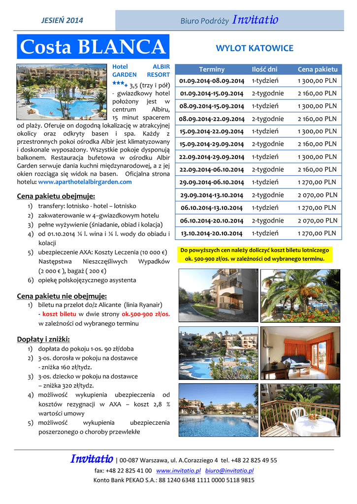 JESIEŃ 2014 Biuro Podróży Costa BLANCA. Hotel GARDEN ALBIR RESORT Invitatio WYLOT KATOWICE Terminy Ilość dni Cena pakietu ***+ 3,5 (trzy i pół) 01.09.2014-08.09.2014 1-tydzień 1 300,00 PLN - gwiazdkowy hotel położony jest w centrum Albiru, 15 minut spacerem od plaży. Oferuje on dogodną lokalizację w atrakcyjnej okolicy oraz odkryty basen i spa. Każdy z przestronnych pokoi ośrodka Albir jest klimatyzowany i doskonale wyposażony. Wszystkie pokoje dysponują balkonem. Restauracja bufetowa w ośrodku Albir Garden serwuje dania kuchni międzynarodowej, a z jej okien rozciąga się widok na basen. Oficjalna strona hotelu: www.aparthotelalbirgarden.com 01.09.2014-15.09.2014 2-tygodnie 2 160,00 PLN 08.09.2014-15.09.2014 1-tydzień 1 300,00 PLN Cena pakietu obejmuje: 1) 2) 3) 4) transfery: lotnisko - hotel – lotnisko zakwaterowanie w 4–gwiazdkowym hotelu pełne wyżywienie (śniadanie, obiad i kolacja) od 01.10.2014 ¼ l. wina i ¼ l. wody do obiadu i kolacji 5) ubezpieczenie AXA: Koszty Leczenia (10 000 €) Następstwa Nieszczęśliwych Wypadków (2 000 € ), bagaż ( 200 €) 6) opiekę polskojęzycznego asystenta 08.09.2014-22.09.2014 2-tygodnie 2 160,00 PLN 15.09.2014-22.09.2014 1-tydzień 1 300,00 PLN 15.09.2014-29.09.2014 2-tygodnie 2 160,00 PLN 22.09.2014-29.09.2014 1-tydzień 1 300,00 PLN 22.09.2014-06.10.2014 2-tygodnie 2 160,00 PLN 29.09.2014-06.10.2014 1-tydzień 1 270,00 PLN 29.09.2014-13.10.2014 2-tygodnie 2 070,00 PLN 06.10.2014-13.10.2014 1-tydzień 1 270,00 PLN 06.10.2014-20.10.2014 2-tygodnie 2 070,00 PLN 13.10.2014-20.10.2014 1-tydzień 1 270,00 PLN Do powyższych cen należy doliczyć koszt biletu lotniczego ok. 500-900 zł/os. w zależności od wybranego terminu. Cena pakietu nie obejmuje: 1) biletu na przelot do/z Alicante (linia Ryanair) - koszt biletu w dwie strony ok.500-900 zł/os. w zależności od wybranego terminu Dopłaty i zniżki: 1) dopłata do pokoju 1-os. 90 zł/doba 2) 3-os. dorosła w pokoju na dostawce - zniżka 160 zł/tydz. 3) 3-os. dziecko w pokoju na dostawce – zniżka 320 zł/tydz. 4) możliwość wykupienia ubezpieczenia od kosztów rezygnacji w AXA – koszt 2,8 % wartości umowy 5) możliwość wykupienia ubezpieczenia poszerzonego o choroby przewlekłe Invitatio | 00-087 Warszawa, ul. A.Corazziego 4 tel. +48 22 825 49 55 fax: +48 22 825 41 00 www.invitatio.pl [email protected] Konto Bank PEKAO S.A.: 88 1240 6348 1111 0000 5118 9815 JESIEŃ 2014 Biuro Podróży Costa BLANCA. Hotel GRAN BALI **** 4-gwiazdkowy hotel położony w zatoczce Benidormu, bardzo blisko morza, z imponującymi widokami i niedaleko parku rozrywki Terra Mítica, jest najbardziej wyjątkowym na Costa Blanca. Zajmuje dwa budynki, z których jeden, liczący 186 metrów wysokości, jest jednym z najwyższych w Hiszpanii. Hotel posiada basen i duże jezioro o oryginalnym projekcie; dodatkowo jacuzzi pod gołym niebem, otoczone rozległą strefą solarium z hamakami i parasolami. Oficjalna strona hotelu: www.granhotelbali.com Invitatio WYLOT KATOWICE Terminy Ilość dni Cena pakietu 15.09.2014-22.09.2014 1-tydzień 1 320,00 PLN 15.09.2014-29.09.2014 2-tygodnie 2 300,00 PLN 22.09.2014-29.09.2014 1-tydzień 1 320,00 PLN 22.09.2014-06.10.2014 2-tygodnie 2 300,00 PLN 29.09.2014-06.10.2014 1-tydzień 1 250,00 PLN 29.09.2014-13.10.2014 2-tygodnie 2 110,00 PLN 06.10.2014-13.10.2014 1-tydzień 1 250,00 PLN 06.10.2014-20.10.2014 2-tygodnie 2 110,00 PLN 13.10.2014-20.10.2014 1-tydzień 1 250,00 PLN Do powyższych cen należy doliczyć koszt biletu lotniczego ok. 500-900 zł/os. w zależności od wybranego terminu. Cena pakietu obejmuje: 1) transfery: lotnisko - hotel – lotnisko 2) zakwaterowanie w 4–gwiazdkowym hotelu 3) pełne wyżywienie (śniadanie, obiad i kolacja) + ¼ l. wina i ¼ l. wody do obiadu i kolacji 4) ubezpieczenie AXA: Koszty Leczenia (10 000 €) Następstwa Nieszczęśliwych Wypadków (2 000 € ), bagaż ( 200 €) 5) opiekę polskojęzycznego asystenta Cena pakietu nie obejmuje: 1) biletu na przelot do/z Alicante (linia Ryanair) - koszt biletu w dwie strony ok.500-900 zł/os. w zależności od wybranego terminu Dopłaty i zniżki: 1) dopłata do pokoju 1-os. 68 zł/doba 2) 3-os. dorosła w pokoju na dostawce - zniżka 120 zł/tydz. 3) 3-os. dziecko 2-12 lat w pokoju na dostawce – zniżka 480 zł/tydz. 4) możliwość wykupienia ubezpieczenia od kosztów rezygnacji w AXA – koszt 2,8 % wartości umowy 5) możliwość wykupienia ubezpieczenia poszerzonego o choroby przewlekłe Invitatio | 00-087 Warszawa, ul. A.Corazziego 4 tel. +48 22 825 49 55 fax: +48 22 825 41 00 www.invitatio.pl [email protected] Konto Bank PEKAO S.A.: 88 1240 6348 1111 0000 5118 9815