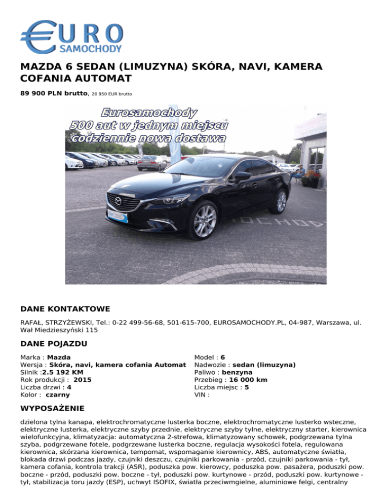 MAZDA 6 SEDAN (LIMUZYNA) SKÓRA, NAVI, KAMERA COFANIA AUTOMAT 89 900 PLN brutto, 20 950 EUR brutto DANE KONTAKTOWE RAFAŁ, STRZYŻEWSKI, Tel.: 0-22 499-56-68, 501-615-700, EUROSAMOCHODY.PL, 04-987, Warszawa, ul. Wał Miedzieszyński 115 DANE POJAZDU Marka : Mazda Wersja : Skóra, navi, kamera cofania Automat Silnik :2.5 192 KM Rok produkcji : 2015 Liczba drzwi : 4 Kolor : czarny Model : 6 Nadwozie : sedan (limuzyna) Paliwo : benzyna Przebieg : 16 000 km Liczba miejsc : 5 VIN : WYPOSAŻENIE dzielona tylna kanapa, elektrochromatyczne lusterka boczne, elektrochromatyczne lusterko wsteczne, elektryczne lusterka, elektryczne szyby przednie, elektryczne szyby tylne, elektryczny starter, kierownica wielofunkcyjna, klimatyzacja: automatyczna 2-strefowa, klimatyzowany schowek, podgrzewana tylna szyba, podgrzewane fotele, podgrzewane lusterka boczne, regulacja wysokości fotela, regulowana kierownica, skórzana kierownica, tempomat, wspomaganie kierownicy, ABS, automatyczne światła, blokada drzwi podczas jazdy, czujniki deszczu, czujniki parkowania - przód, czujniki parkowania - tył, kamera cofania, kontrola trakcji (ASR), poduszka pow. kierowcy, poduszka pow. pasażera, poduszki pow. boczne - przód, poduszki pow. boczne - tył, poduszki pow. kurtynowe - przód, poduszki pow. kurtynowe tył, stabilizacja toru jazdy (ESP), uchwyt ISOFIX, światła przeciwmgielne, aluminiowe felgi, centralny zamek, gniazdo SD, gniazdo USB, immobiliser, komputer pokładowy, nawigacja satelitarna, przyciemniane szyby, reflektory halogenowe, szyberdach, wyjście aux OPIS POJAZDU Mazda 6 WITAMY W NAJWIĘKSZYM W POLSCE SALONIE SAMOCHODÓW UŻYWANYCH SUPER PROMOCJA GWARANCJA TECHNICZNA NA 12 MIESIĘCY lub KOMPLET OPON ZIMOWYCH lub LETNICH GRATIS*(do wyczerpania zapasów, możliwość rozszerzenia gwarancji do 36 miesięcy) - 500 AUT Z GWARANCJĄ w jednym miejscu / różne marki , modele , wersje wyposażenia/ - 8 dni na zamianę auta - Sprawdzone pochodzenie pojazdów - bezwypadkowe - Gwarancja przebiegu - Gwarancja pełnej historii serwisowej - Samochody od I właściciela - dla klientów zamiejscowych rezerwacja auta do czasu przyjazdu - udzielamy 12-miesięcznej gwarancji technicznej, możliwość przedłużenia do 36-miesięcy /bez limitu kilometrów, ważna na terenie całej Polski + assistance- darmowe holowanie , potwierdzenie certyfikatem / Kupującemu oferujemy: 1. Jazdę próbną 2. Bezpłatny przegląd przedsprzedażowy obejmujący: - kontrolę amortyzatorów - hamulców - podwozia samochodu - pomiar geometrii - diagnoza komputerowa - pomiar grubości powłoki lakierniczej - możliwość sprawdzenia przed zakupem w serwisie lub stacji diagnostycznej lub za pośrednictwem niezależnego rzeczoznawcy na zlecenie kupującego /dla klientów zamiejscowych bez konieczności przyjazdu/. - wszystkie nasze samochody posiadają komplet dokumentów wymaganych do zarejestrowania bądź przerejestrowania samochodu - przyjmujemy auta w rozliczeniu oraz kupujemy /bez ograniczeń wiekowych/ - Zajmujemy się sprzedażą detaliczną oraz hurtową / zapraszamy do współpracy osoby prywatne, firmy również z branży i instytucje / -Kupujący otrzymuje fakturę VAT 23% /nie ponosi opłaty PCC w wysokości 2%/ -kredyt 0% wpłaty własnej,raty dopasowane do własnych potrzeb -leasing bez zaświadczeń ,również dla widniejących w BIK szybka obsługa na miejscu "Niniejsze ogłoszenia są wyłącznie informacją handlową i nie stanowią oferty w myśl art. 66, § 1. Kodeksu Cywilnego. Sprzedający nie odpowiada za ewentualne błędy lub nieaktualność ogłoszenia." Zapis ten został zamieszczony ze względu na możliwość niezamierzonych pomyłek. Jeżeli zauważysz nieścisłość napisz do nas. Szukasz pewnego używanego auta ? Tylko u nas sprawdzone samochody z polskich salonów To nie komis to salon aut używanych z wieloletnim doświadczeniem Więcej informacji na eurosamochody . pl ZADZWOŃ TERAZ!!! Rafał 501 615 700 Tomasz 512 345 150 Marcin 505 416 300 Piotr 501 087 038 Mariusz 500 130 727 QR CODE DLA OGŁOSZENIA Powered by TCPDF (www.tcpdf.org)