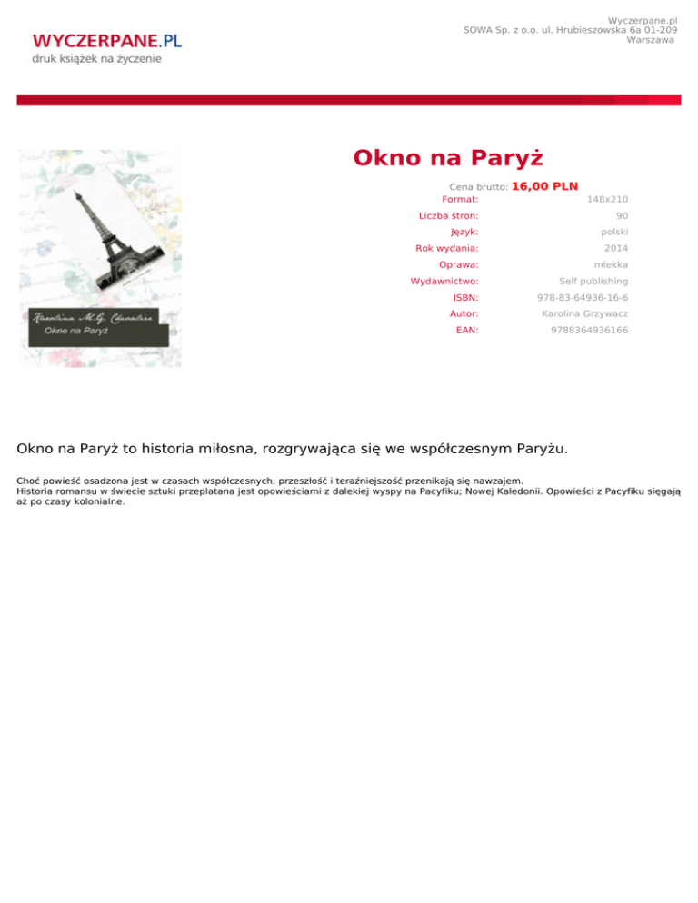 Wyczerpane.pl SOWA Sp. z o.o. ul. Hrubieszowska 6a 01-209 Warszawa Okno na Paryż Cena brutto: Format: 16,00 PLN 148x210 Liczba stron: 90 Język: polski Rok wydania: 2014 Oprawa: miekka Wydawnictwo: Self publishing ISBN: 978-83-64936-16-6 Autor: Karolina Grzywacz EAN: 9788364936166 Okno na Paryż to historia miłosna, rozgrywająca się we współczesnym Paryżu. Choć powieść osadzona jest w czasach współczesnych, przeszłość i teraźniejszość przenikają się nawzajem. Historia romansu w świecie sztuki przeplatana jest opowieściami z dalekiej wyspy na Pacyfiku; Nowej Kaledonii. Opowieści z Pacyfiku sięgają aż po czasy kolonialne.