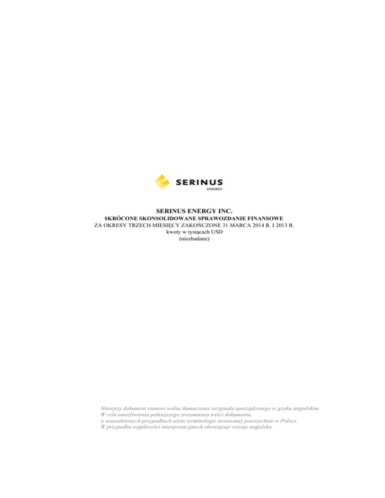 Serinus Energy Inc. sporządzonego na dzień 31 marca 2014 r., skróconego skonsolidowanego śródrocznego sprawozdania