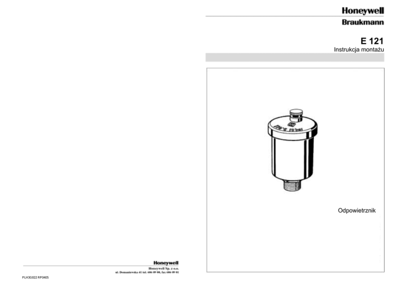 E 121 Instrukcja montażu Odpowietrznik PLH3G022 RP0405 1. Instalacja Przy montażu należy postępować zgodnie z lokalnymi przepisami oraz instrukcją montażu. Miejsce montażu musi być zabezpieczone przed mrozem i w pełni dostępne. 1.1 Montaż 1. Przepłukać dokładnie rurociąg. 2. Wkręcić odpowietrznik w najwyższym punkcie instalacji grzewczej. Użyć klucza płaskiego i mocno dokręcić. 2. Obsługa Odpowietrznik musi być sprawdzany regularnie, ponieważ brud może prowadzić do wadliwego działania. 1. Odkręcić i usunąć pokrywkę z pływakiem. 2. Oczyścić wszystkie części i zmontować na nowo. 3. Sprawdzić, czy korek jest odkręcony. 3. Zakres zastosowań Instalacje centralnego ogrzewania. Nie nadaje się do olei mineralnych i cieczy z dodatkami na bazie olei mineralnych. 4.Dane techniczne Maks. temperatura pracy 110 °C Maksymalne ciśnienie 10 bar Rozmiary przyłączy R 3/8” lub R1/2” 5. Akcesoria Z 121 – 3/8 Z 121 – ½ zawór odcinający 3/8" zawór odcinający ½”