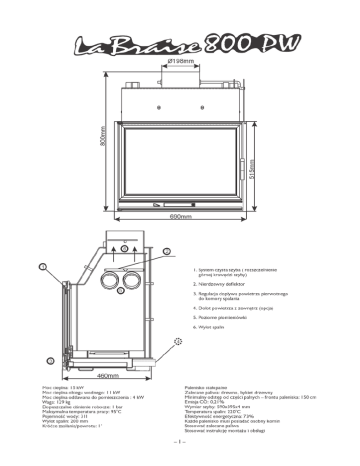–1– –2– –3– –4– –5– –6– –7– INSTRUKCJA MONTAŻU I OBSŁUGI WKŁADU KOMINKOWEGO Oddajemy Państwu w użytkowanie wkład kominkowy marki LaBraise. Przed przystąpieniem do jego użytkowania prosimy o zapoznanie się z instrukcją montażu i obsługi. Montaż kominka musi być zgodny z polskimi przepisami prawa budowlanego. Nasza odpowiedzialność ogranicza się jedynie do dostawy paleniska. Jego montaż musi być wykonany zgodnie z zaleceniami zawartymi w niniejszej instrukcji i zgodnie z zasadami sztuki budowlanej, oraz musi być wykonywany przez wykwalifikowany personel firmy ponoszącej całkowitą odpowiedzialność za całość instalacji. Przepisy prawne dotyczące budowy kominków: I Prawo budowlane Dz. U. Nr 89 poz. 414 z 1994 r. – Ustawa z dn. 07.07.1994r. z późniejszymi zmianami. II. Rozporządzenie Ministra Infrastruktury z dn. 12.04.2002 r. w sprawie warunków technicznych jakim powinny odpowiadać budynki i ich usytuowanie – Dziennik Ustaw Nr 75 z 2002 poz. 690 z późniejszymi zmianami w tym § 132: „Kominki opalane drewnem z otwartym paleniskiem lub zamkniętym wkładem kominkowym mogą być instalowane wyłącznie w budynkach jednorodzinnych, mieszkalnych w zabudowie zagrodowej i rekreacji indywidualnej oraz niskich budynkach wielorodzinnych, w pomieszczeniach: 1) o kubaturze wynikającej ze wskaźnika 4 m3/kW nominalnej mocy cieplnej kominka, lecz nie mniejszej niż 30 m3, 2) spełniających wymagania dotyczące wentylacji, o których mowa w § 150 ust. 9, 3) posiadających przewody kominowe określone w § 140 ust. 1 i 2 oraz § 145 ust. 1, 4) w których możliwy jest dopływ powietrza do paleniska kominka w ilości: a) co najmniej 10m3/h na 1kW nominalnej mocy cieplnej kominka – dla kominków o obudowie zamkniętej, b) zapewniającej nie mniejszą prędkość przepływu powietrza w otworze komory spalania niż 0,2 m/s – dla kominków o obudowie otwartej” III. Norma PN-EN 13229: „Wkłady grzewcze wraz z kominkami otwartymi na paliwa stałe. Wymagania i badania” SPIS TREŚCI 1. 2. 3. 4. 5. Opis techniczny Dobór paleniska Przewody kominowe, wentylacyjne, dopływ powietrza Montaż paleniska, podłączenie przewodu spalinowego Eksploatacja: – pierwsze rozpalenie – ustawienie regulatorów – opał – konserwacja i czyszczenie 6. Bezpieczeństwo –8– 1. Opis techniczny Front wkładu kominkowego został wykonany z odlewów żeliwnych, które połączono ze sobą wzajemnie na zasadzie „pióro-wpust”, uszczelniono masą ogniotrwałą, a następnie skręcono śrubami. drzwiczki paleniska oraz szyba zostały osadzone na niepalnych uszczelkach (włókno szklane), zapewniając należytą szczelność całego urządzenia. W dolnej części paleniska znajduje się szuflada popielnika, a w niej regulator wlotu powietrza do paleniska. Wewnątrz w górnej części paleniska znajduje się nierdzewny deflektor umieszczony nad poziomymi płomieniówkami, wydłużający proces spalania. Wkład kominkowy wyposażony jest w regulowany szyber. Płaszcz wodny wkładu jest konstrukcja spawaną wykonaną z blachy st3 o grubości 4mm, wyposażoną w króćce podłączeniowe, dwie płomieniówki z stali kotłowej, dno paleniska wyłożone jest kształtkami szamotowymi. Ponadto wkłady przystosowane są do systemu doprowadzenia powietrza z zewnątrz. Możliwe jest to przez dokupienie przyłącza znajdującego się w handlu. Wkład La braise 810PW posiada obudowę izolacyjną podnoszącą jego sprawność. Palenisko ogrzewa poprzez: 1. Konwekcję powietrza zasysanego z pomieszczenia przez otwór o powierzchni min. 800 cm2 umieszczony, np. pod wkładem żeliwnym i wyrzucanego przez kratki powietrzne umieszczone w górnej części obudowy lub wyprowadzone kanałami do innych pomieszczeń, o łącznej powierzchni min. 1000 cm2. 2. Oddawanie ciepła przez nagrzane elementy żeliwne i przeszklone wkładu grzewczego. 3. Oddawanie ciepła przez wodę która obiera energie cieplną z palącego się paliwa. 2. Dobór paleniska Przy wyborze odpowiedniego paleniska dla określonego pomieszczenia (pomieszczeń) należy poza względami estetycznymi kierować się następującymi zasadami: 1. Przepisy wynikające z Rozp. Ministra Infrastruktury z 12.04.2002 (Dz.U. 02.75.690) oraz prawa budowlanego. 2. Dobór mocy wkładu kominkowego jest uzależniony od stopnia izolacji pomieszczenia oraz ogrzewanej przestrzeni. Przyjmuje się, że dla wystarczająco izolowanego pomieszczenia lkW mocy wkładu starcza na ogrzanie l0m2 o standardowej wysokości 2,5 m. 3. Przewody kominowe, wentylacyjne, dopływ powietrza Dla prawidłowego funkcjonowania paleniska urządzenie powinno być podłączone do komina zgodnie z obowiązującymi przepisami prawa (patrz Rozp. Ministra Infrastruktury z 12.04.2002 (Dz.U. 02.75.690 z późn. zm.)). Zaleca się, aby: – minimalna wysokość przewodu kominowego była równa 3,5–4 m, optymalna 5–6 m, licząc od dna paleniska, – przewód kominowy powinien być szczelny o tym samym przekroju na całej długości oraz wystawać ok. 0,5 m ponad kalenicę budynku celem niedopuszczenia do zakłócenia ciągu. W sytuacjach szczególnych (II i III strefa obciążenia wiatrem, ze względu na lokalne warunki topograficzne) należy stosować nasady kominowe zabezpieczające przed odwrócenim ciągu. Uwaga: – przewody kominowe o wymiarach (przekroju) mniejszych od zalecanych, – przewody w budynkach o niekorzystnym położeniu (np. w otoczeniu wysokich budynków, budynki w dolinach), – przewody odchylone od pionu i o długich odcinkach poziomych, w/w przypadki mogą doprowadzić do braku żądanego podciśnienia w przewodzie, co nie –9– spowoduje wyssania spalin (dymienie). Zjawisko takie nie uprawnia do zgłoszenia reklamacji (patrz pkt 5 gwarancji). Przed zamontowaniem wkładu niezbędnym jest uzyskanie opinii kominiarza określającej siłę ciągu przewodu kominowego oraz możliwości zastosowanie istniejącego przewodu kominowego do