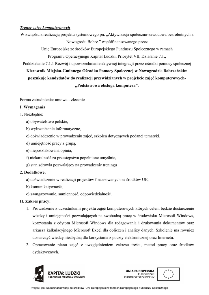 Trener zajęć komputerowych W związku z realizacją projektu systemowego pn. „Aktywizacja społeczno-zawodowa bezrobotnych z Nowogrodu Bobrz.” współfinansowanego przez Unię Europejską ze środków Europejskiego Funduszu Społecznego w ramach Programu Operacyjnego Kapitał Ludzki, Priorytet VII, Działanie 7.1., Poddziałanie 7.1.1 Rozwój i upowszechnianie aktywnej integracji przez ośrodki pomocy społecznej Kierownik Miejsko-Gminnego Ośrodka Pomocy Społecznej w Nowogrodzie Bobrzańskim poszukuje kandydatów do realizacji przewidzianych w projekcie zajęć komputerowych,,Podstawowa obsługa komputera”. Forma zatrudnienia: umowa - zlecenie I. Wymagania 1. Niezbędne: a) obywatelstwo polskie, b) wykształcenie informatyczne, c) doświadczenie w prowadzeniu zajęć, szkoleń dotyczących podanej tematyki, d) umiejętność pracy z grupą, e) nieposzlakowana opinia, f) niekaralność za przestępstwa popełnione umyślnie, g) stan zdrowia pozwalający na prowadzenie treningu 2. Dodatkowe: a) doświadczenie w realizacji projektów finansowanych ze środków UE, b) komunikatywność, c) zaangażowanie, sumienność, odpowiedzialność. II. Zakres pracy: 1. Prowadzenie z uczestnikami projektu zajęć komputerowych których celem będzie dostarczenie wiedzy i umiejętności pozwalających na swobodną pracę w środowisku Microsoft Windows, korzystania z edytora Microsoft Windows dla redagowania i drukowania dokumentów oraz arkusza kalkulacyjnego Microsoft Excel dla obliczeń i analizy danych. Szkolenie ma również dostarczyć wiedzę niezbędną dla korzystania z poczty elektronicznej oraz Internetu. 2. Opracowanie planu zajęć z uwzględnieniem zakresu treści, metod pracy oraz środków dydaktycznych. Projekt jest współfinansowany ze środków Unii Europejskiej w ramach Europejskiego Funduszu Społecznego 3. Prowadzenie dokumentacji dotyczącej przeprowadzonych zajęć. III. Wymagane dokumenty a) list motywacyjny, b) życiorys cv, c) kserokopie dokumentów potwierdzających posiadane wykształcenie, staż pracy i kwalifikacje, d) oświadczenie o niekaralności oraz posiadaniu pełnej zdolności do czynności prawnych i korzystaniu z pełni praw publicznych. e) wymagane dokumenty aplikacyjne powinny zawierać oświadczenie dotyczące zgody na przetwarzanie danych osobowych do celów rekrutacji zgodnie z ustawą z dn. 29.08.1997 r. o ochronie danych osobowych (Dz.U. z 2002 r. nr 101, poz. 926 z późn. zm.) IV. Termin, sposób i miejsce składania dokumentów aplikacyjnych: a) termin: do dnia 7 września 2012r. b) sposób składania dokumentów aplikacyjnych: w zamkniętej kopercie z zaznaczeniem „nabór na trenera do prowadzenia zajęć komputerowych” – osobiście w godzinach pracy Ośrodka Pomocy Społecznej lub listem poleconym, c) miejsce: Miejsko-Gminny Ośrodek Pomocy Społecznej 66-010 Nowogród Bobrzański, ul. Ogrodowa 9. V. Dodatkowe informacje: a) szczegółowe informacje na temat oferty pracy zostaną przekazane kandydatom na spotkaniu, jednocześnie zastrzegamy sobie prawo kontaktu tylko z wybranymi kandydatami; b) e-mail : [email protected] c) aplikacje które wpłyną do Ośrodka po wskazanym terminie nie będą rozpatrywane; e) informacja o wyniku naboru zostanie ogłoszona na stronie internetowej Ośrodka – www.mgopsnb.pl Projekt jest współfinansowany ze środków Unii Europejskiej w ramach Europejskiego Funduszu Społecznego