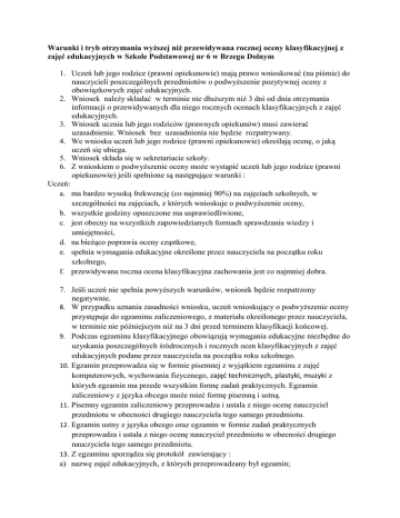 Warunki i tryb otrzymania wyższej niż przewidywana rocznej oceny klasyfikacyjnej z zajęć edukacyjnych w Szkole Podstawowej nr 6 w Brzegu Dolnym 1. Uczeń lub jego rodzice (prawni opiekunowie) mają prawo wnioskować (na piśmie) do nauczycieli poszczególnych przedmiotów o podwyższenie pozytywnej oceny z obowiązkowych zajęć edukacyjnych. 2. Wniosek należy składać w terminie nie dłuższym niż 3 dni od dnia otrzymania informacji o przewidywanych dla niego rocznych ocenach klasyfikacyjnych z zajęć edukacyjnych. 3. Wniosek ucznia lub jego rodziców (prawnych opiekunów) musi zawierać uzasadnienie. Wniosek bez uzasadnienia nie będzie rozpatrywany. 4. We wniosku uczeń lub jego rodzice (prawni opiekunowie) określają ocenę, o jaką uczeń się ubiega. 5. Wniosek składa się w sekretariacie szkoły. 6. Z wnioskiem o podwyższenie oceny może wystąpić uczeń lub jego rodzice (prawni opiekunowie) jeśli spełnione są następujące warunki : Uczeń: a. ma bardzo wysoką frekwencję (co najmniej 90%) na zajęciach szkolnych, w szczególności na zajęciach, z których wnioskuje o podwyższenie oceny, b. wszystkie godziny opuszczone ma usprawiedliwione, c. jest obecny na wszystkich zapowiedzianych formach sprawdzania wiedzy i umiejętności, d. na bieżąco poprawia oceny cząstkowe, e. spełnia wymagania edukacyjne określone przez nauczyciela na początku roku szkolnego, f. przewidywana roczna ocena klasyfikacyjna zachowania jest co najmniej dobra. 7. Jeśli uczeń nie spełnia powyższych warunków, wniosek będzie rozpatrzony negatywnie. 8. W przypadku uznania zasadności wniosku, uczeń wnioskujący o podwyższenie oceny przystępuje do egzaminu zaliczeniowego, z materiału określonego przez nauczyciela, w terminie nie późniejszym niż na 3 dni przed terminem klasyfikacji końcowej. 9. Podczas egzaminu klasyfikacyjnego obowiązują wymagania edukacyjne niezbędne do uzyskania poszczególnych śródrocznych i rocznych ocen klasyfikacyjnych z zajęć edukacyjnych podane przez nauczyciela na początku roku szkolnego. 10. Egzamin przeprowadza się w formie pisemnej z wyjątkiem egzaminu z zajęć komputerowych, wychowania fizycznego, zajęć technicznych, plastyki, muzyki z których egzamin ma przede wszystkim formę zadań praktycznych. Egzamin zaliczeniowy z języka obcego może mieć formę pisemną i ustną. 11. Pisemny egzamin zaliczeniowy przeprowadza i ustala z niego ocenę nauczyciel przedmiotu w obecności drugiego nauczyciela tego samego przedmiotu. 12. Egzamin ustny z języka obcego oraz egzamin w formie zadań praktycznych przeprowadza i ustala z niego ocenę nauczyciel przedmiotu w obecności drugiego nauczyciela tego samego przedmiotu. 13. Z egzaminu sporządza się protokół zawierający : a) nazwę zajęć edukacyjnych, z których przeprowadzany był egzamin; b) imiona i nazwiska osób wchodzących w skład komisji; c) termin egzaminu; d) imię i nazwisko ucznia; e) zadania egzaminacyjne; f) ustaloną ocenę klasyfikacyjną. 14. Roczna ocena klasyfikacyjna z zajęć edukacyjnych ustalona w wyniku egzaminu klasyfikacyjnego nie może być niższa niż przewidywana. 15. Uczeń lub jego rodzice (prawni opiekunowie) mają prawo wnioskować (na piśmie) do wychowawcy o podwyższenie oceny zachowania w terminie nie dłuższym niż 3 dni od otrzymania informacji o przewidywanej dla niego rocznej ocenie zachowania 16. We wniosku uczeń lub jego rodzice (prawni opiekunowie) określają ocenę, o jaką uczeń się ubiega. 17. Ocena zachowania ucznia może być podwyższona w przypadku : a. zaistnienia nowych okoliczności np. informacji o pozytywnych zachowaniach ucznia poza szkoła, osiągnięciach w pracy społecznej na rzecz środowiska itp.; b. pozytywnej opinii samorządu klasowego. 18. W przypadku uznania zasadności wniosku, prowadzi się postępowanie dotyczące podwyższania przewidywanej rocznej oceny klasyfikacyjnej zachowania w terminie nie późniejszym niż na 3 dni przed posiedzeniem klasyfikacyjnym rady pedagogicznej. 19. Postępowanie przeprowadza wychowawca wraz z pedagogiem szkolnym. 20. Ocena jest ustalona w drodze głosowania zwykłą większością głosów. 21. Z postępowania sporządza się protokół zawierający: a) imiona i nazwiska osób wchodzących w skład komisji; b) termin posiedzenia komisji; c) imię i nazwisko ucznia; d) wynik głosowania; e) ustaloną ocenę klasyfikacyjną z zachowania wraz z uzasadnieniem.