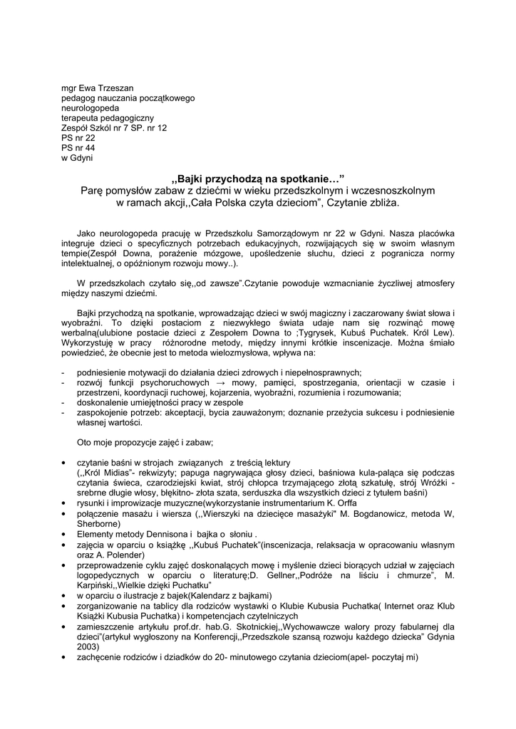 mgr Ewa Trzeszan pedagog nauczania początkowego neurologopeda terapeuta pedagogiczny Zespół Szkól nr 7 SP. nr 12 PS nr 22 PS nr 44 w Gdyni ,,Bajki przychodzą na spotkanie…” Parę pomysłów zabaw z dziećmi w wieku przedszkolnym i wczesnoszkolnym w ramach akcji,,Cała Polska czyta dzieciom”, Czytanie zbliża. Jako neurologopeda pracuję w Przedszkolu Samorządowym nr 22 w Gdyni. Nasza placówka integruje dzieci o specyficznych potrzebach edukacyjnych, rozwijających się w swoim własnym tempie(Zespół Downa, porażenie mózgowe, upośledzenie słuchu, dzieci z pogranicza normy intelektualnej, o opóźnionym rozwoju mowy..). W przedszkolach czytało się,,od zawsze”.Czytanie powoduje wzmacnianie życzliwej atmosfery między naszymi dziećmi. Bajki przychodzą na spotkanie, wprowadzając dzieci w swój magiczny i zaczarowany świat słowa i wyobraźni. To dzięki postaciom z niezwykłego świata udaje nam się rozwinąć mowę werbalną(ulubione postacie dzieci z Zespołem Downa to ;Tygrysek, Kubuś Puchatek. Król Lew). Wykorzystuję w pracy różnorodne metody, między innymi krótkie inscenizacje. Można śmiało powiedzieć, że obecnie jest to metoda wielozmysłowa, wpływa na: - podniesienie motywacji do działania dzieci zdrowych i niepełnosprawnych; rozwój funkcji psychoruchowych → mowy, pamięci, spostrzegania, orientacji w czasie i przestrzeni, koordynacji ruchowej, kojarzenia, wyobraźni, rozumienia i rozumowania; doskonalenie umiejętności pracy w zespole zaspokojenie potrzeb: akceptacji, bycia zauważonym; doznanie przeżycia sukcesu i podniesienie własnej wartości. Oto moje propozycje zajęć i zabaw; • • • • • • • • • • czytanie baśni w strojach związanych z treścią lektury (,,Król Midias”- rekwizyty; papuga nagrywająca głosy dzieci, baśniowa kula-paląca się podczas czytania świeca, czarodziejski kwiat, strój chłopca trzymającego złotą szkatułę, strój Wróżki srebrne długie włosy, błękitno- złota szata, serduszka dla wszystkich dzieci z tytułem baśni) rysunki i improwizacje muzyczne(wykorzystanie instrumentarium K. Orffa połączenie masażu i wiersza (,,Wierszyki na dziecięce masażyki" M. Bogdanowicz, metoda W, Sherborne) Elementy metody Dennisona i bajka o słoniu . zajęcia w oparciu o książkę ,,Kubuś Puchatek”(inscenizacja, relaksacja w opracowaniu własnym oraz A. Polender) przeprowadzenie cyklu zajęć doskonalących mowę i myślenie dzieci biorących udział w zajęciach logopedycznych w oparciu o literaturę;D. Gellner,,Podróże na liściu i chmurze”, M. Karpiński,,Wielkie dzięki Puchatku” w oparciu o ilustracje z bajek(Kalendarz z bajkami) zorganizowanie na tablicy dla rodziców wystawki o Klubie Kubusia Puchatka( Internet oraz Klub Książki Kubusia Puchatka) i kompetencjach czytelniczych zamieszczenie artykułu prof.dr. hab.G. Skotnickiej,,Wychowawcze walory prozy fabularnej dla dzieci”(artykuł wygłoszony na Konferencji,,Przedszkole szansą rozwoju każdego dziecka” Gdynia 2003) zachęcenie rodziców i dziadków do 20- minutowego czytania dzieciom(apel- poczytaj mi) • • • • • • • • • Opieka i pomoc w zorganizowaniu biblioteki dla nauczycieli. Opracowanie dyplomiku dla czytających rodziców i opiekunów. czytanie bajek przez rodziców goście w Przedszkolu; myśliwy i bajka ,,Czerwony Kapturek” pies (dogoterapia) dobra wróżka posłaniec Pani Zimy (stroje leśnych zwierząt) biedak,,Trzy życzenia”( po wysłuchaniu tekstu, opowiadanie na podstawie ilustracji o życzeniach ubogich wieśniaków) ,,O jeżyku, którego wszyscy się bali”- po wysłuchaniu tekstu ćwiczenia ortofoniczne,,W krainie leśnych stworzeń”, lepienie z masy solnej jeży. ,,Pasterz o oczach jak gwiazdy”(rysowanie portretu królewny, ćwiczenia motoryki dużej-,,Taniec Królewny ”do melodii z nagrań) ,,Królewicz zaklęty w żabę”( przedstawienie części ilustrowanej bajki ,dokończenie bajki przez dzieci, ćwiczenia doskonalące wymowę głosek szeregu szumiącego) ,,Księżniczka na ziarnku grochu”(po wysłuchaniu bajki dzieci same zamieniają się w aktorów, rekwizyty poduszki, groch, tron , strój księżniczki) Seria zabaw doskonalących spostrzegawczość wzrokową oraz rozwijającą mówienie i wyobraźnię; • Jaka to bajka? (zagadki słowne, obrazkowe, ilustracje, rekwizyty z bajek) • A teraz ty opowiedz bajkę!(swobodna twórczość dzieci nagrywanie na magnetofon) Seria zabaw doskonalących koordynacje wzrokowo- ruchową; • Robimy lalki(piłeczka pingpongowa, patyczek, włóczka, szmatki) • wycinanie konturu Jasia z papieru(,,O głupim Jasiu”) oraz zaznaczenie wszystkich jego części. • pejzaż baśniowy(malowanie farbami w konturze lasu) • wiosna, lato, zima rysowanie kredkami postaci i elementów znanych bajek w konturze pór roku. • apel zachęcający rodziców do współpracy z Biblioteką Filia nr 10 w Gdyni( gazetka poświęcona historii biblioteki, godziny pracy,zdjęcia dzieci z wizyty u pracownika biblioteki mgr J. Zamorskiej) Zachęcenie do współpracy innych pracowników przedszkola; Rytmika; Współpraca z rytmiczką, zaproponowanie nauki piosenki hymnu,,W krainie bajek”muzyka A. Nowak, Słowa H. A. Cenarska. Pani Małgosia przygotowuje ciekawe zabawy(KIanza), interpretacje muzyczne do bajek i inscenizacji (przedstawienia ekologiczne) Religia Czytanie treści religijnych(Pismo Święte dla dzieci w obrazkach) w połączeniu z ruchem. Gimnastyka korekcyjna Zaproponowanie wzbogacenia ćwiczeń o ,,Wierszyki na dziecięce masażyki” (słowo i ruch)M. Bogdanowicz. Język angielski Zapoznanie z wykazem literatury czytanej w j. angielskim w grupie angielskiej przez mgr A. Niedzielską • Lady Bird-Ladybird Books • Oxford-Oxford University Press • Penguin Books • Wydawnictwo Haddock • Express Publishing • Klasyka Baśni-,,Uczymy się angielskiego”wydawnictwo,,Wilga” • Polska Oficyna Wydawnicza,,BGM” • Puffin 