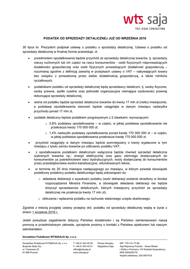 PODATEK OD SPRZEDAŻY DETALICZNEJ JUŻ OD WRZEŚNIA 2016 30 lipca br. Prezydent podpisał ustawę o podatku o sprzedaży detalicznej. Ustawa o podatku od sprzedaży detalicznej w finalnej formie przewiduje, iż: przedmiotem opodatkowania będzie przychód ze sprzedaży detalicznej towarów, tj. sprzedaży rzeczy ruchomych lub ich części na rzecz konsumentów - osób fizycznych nieprowadzących działalności gospodarczej oraz osób fizycznych prowadzących działalność gospodarczą – rozumianą zgodnie z definicją zawartą w przepisach ustawy o VAT – nabywających towary bez związku z prowadzoną przez siebie działalnością gospodarczą, a także rolników ryczałtowych, podatnikami podatku od sprzedaży detalicznej będą sprzedawcy detaliczni, tj. osoby fizyczne, osoby prawne, spółki cywilne oraz jednostki organizacyjne niemające osobowości prawnej dokonujące sprzedaży detalicznej, wolna od podatku będzie sprzedaż detaliczna towarów do kwoty 17 mln zł (netto) miesięcznie, a podstawę opodatkowania stanowić będzie osiągnięta w danym miesiącu nadwyżka przychodu ponad 17 mln zł, podatek detaliczny będzie podatkiem progresywnym z 2 stawkami, wynoszącymi: o 0,8% podstawy opodatkowania – w części, w jakiej podstawa opodatkowania nie przekracza kwoty 170 000 000 zł; o 1,4% nadwyżki podstawy opodatkowania ponad kwotę 170 000 000 zł – w części, w jakiej podstawa opodatkowania przekracza kwotę 170 000 000 zł. przychód osiągnięty w danym miesiącu będzie pomniejszany o kwoty wypłacone w tym miesiącu z tytułu zwrotu towarów po odliczeniu podatku VAT, z opodatkowania podatkiem detalicznym wyłączona będzie również sprzedaż detaliczna wybranych towarów np.: energii elektrycznej oraz gazu ziemnego dostarczanych do konsumentów za pośrednictwem sieci dystrybucyjnych, wody dostarczanej do konsumentów przez przedsiębiorstwa wodno-kanalizacyjne, refundowanych leków, w terminie do 25 dnia miesiąca następującego po miesiącu, w którym powstał obowiązek podatkowy podatnicy podatku detalicznego będą zobowiązani do: o składania deklaracji o wysokości podatku (wzór deklaracji zostanie określony w drodze rozporządzenia Ministra Finansów, a obowiązek składania deklaracji nie będzie dotyczył sprzedawców detalicznych, których miesięczny przychód ze sprzedaży detalicznej nie przekracza kwoty 17 mln zł), o obliczenia i wpłacenia podatku na rachunek właściwego urzędu skarbowego. Zgodnie z treścią przyjętej ustawy przepisy dot. podatku od sprzedaży detalicznej wejdą w życie z dniem 1 września 2016 r. Jeżeli powyższe zagadnienie dotyczy Państwa działalności i są Państwo zainteresowani naszą pomocą w przedmiotowym zakresie, uprzejmie prosimy o kontakt z Państwa opiekunem lub naszym sekretariatem. Doradztwo Podatkowe WTS&SAJA Sp. z o.o. Doradztwo Podatkowe WTS&SAJA Sp. z o.o. Budynek Delta IVp. ul. Towarowa 35 61-896 Poznań T +48 61 643 45 50 F +48 61 643 45 51 [email protected] www.wtssaja.pl Prezes Zarządu: Magdalena Saja NIP: 778-141-77-66 Sąd Rejonowy Poznań – Nowe Miasto i Wilda w Poznaniu, VIII Wydział Gospodarczy KRS 0000206176 Kapitał zakładowy: 200.000 PLN Budynek Delta IV p. ul. Towarowa 35 61-896 Poznań tel. (+48) 61 643 45 50 fax. (+48) 61 643 45 51 Biuro w Warszawie Budynek Central Tower XXII p. Al. Jerozolimskie 81 02-001 Warszawa Powyższy Newsletter stanowi informację o charakterze ogólnym, jego celem jest dostarczenie Państwu na bieżąco informacji o zmianach w prawie podatkowym, interpretacjach organów podatkowych, rozwoju linii orzeczniczej oraz ciekawych komentarzach. Doradztwo Podatkowe WTS&SAJA nie ponosi prawnej odpowiedzialności za żadne działania lub zaniechania podjęte w wyniku powyższych informacji. Doradztwo Podatkowe WTS&SAJA Sp. z o.o. Budynek Delta IVp. ul. Towarowa 35 61-896 Poznań T +48 61 643 45 50 F +48 61 643 45 51 [email protected] www.wtssaja.pl Prezes Zarządu: Magdalena Saja NIP: 778-141-77-66 Sąd Rejonowy Poznań – Nowe Miasto i Wilda w Poznaniu, VIII Wydział Gospodarczy KRS 0000206176 Kapitał zakładowy: 200.000 PLN