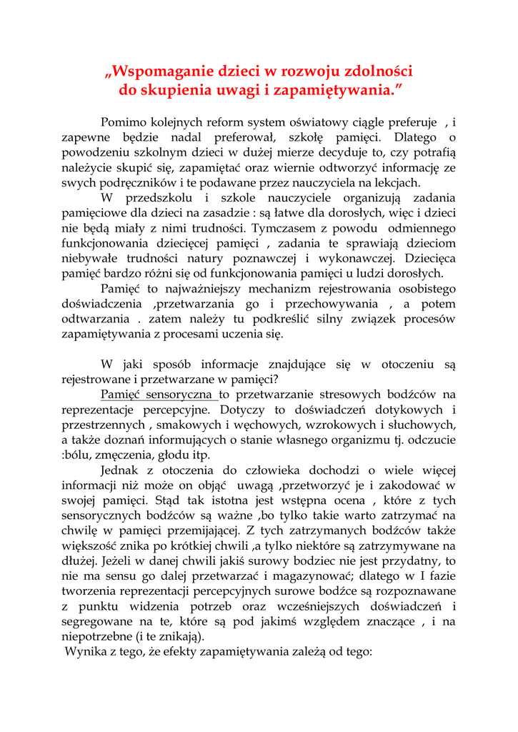 „Wspomaganie dzieci w rozwoju zdolności do skupienia uwagi i zapamiętywania.” Pomimo kolejnych reform system oświatowy ciągle preferuje , i zapewne będzie nadal preferował, szkołę pamięci. Dlatego o powodzeniu szkolnym dzieci w dużej mierze decyduje to, czy potrafią należycie skupić się, zapamiętać oraz wiernie odtworzyć informację ze swych podręczników i te podawane przez nauczyciela na lekcjach. W przedszkolu i szkole nauczyciele organizują zadania pamięciowe dla dzieci na zasadzie : są łatwe dla dorosłych, więc i dzieci nie będą miały z nimi trudności. Tymczasem z powodu odmiennego funkcjonowania dziecięcej pamięci , zadania te sprawiają dzieciom niebywałe trudności natury poznawczej i wykonawczej. Dziecięca pamięć bardzo różni się od funkcjonowania pamięci u ludzi dorosłych. Pamięć to najważniejszy mechanizm rejestrowania osobistego doświadczenia ,przetwarzania go i przechowywania , a potem odtwarzania . zatem należy tu podkreślić silny związek procesów zapamiętywania z procesami uczenia się. W jaki sposób informacje znajdujące się w otoczeniu są rejestrowane i przetwarzane w pamięci? Pamięć sensoryczna to przetwarzanie stresowych bodźców na reprezentacje percepcyjne. Dotyczy to doświadczeń dotykowych i przestrzennych , smakowych i węchowych, wzrokowych i słuchowych, a także doznań informujących o stanie własnego organizmu tj. odczucie :bólu, zmęczenia, głodu itp. Jednak z otoczenia do człowieka dochodzi o wiele więcej informacji niż może on objąć uwagą ,przetworzyć je i zakodować w swojej pamięci. Stąd tak istotna jest wstępna ocena , które z tych sensorycznych bodźców są ważne ,bo tylko takie warto zatrzymać na chwilę w pamięci przemijającej. Z tych zatrzymanych bodźców także większość znika po krótkiej chwili ,a tylko niektóre są zatrzymywane na dłużej. Jeżeli w danej chwili jakiś surowy bodziec nie jest przydatny, to nie ma sensu go dalej przetwarzać i magazynować; dlatego w I fazie tworzenia reprezentacji percepcyjnych surowe bodźce są rozpoznawane z punktu widzenia potrzeb oraz wcześniejszych doświadczeń i segregowane na te, które są pod jakimś względem znaczące , i na niepotrzebne (i te znikają). Wynika z tego, że efekty zapamiętywania zależą od tego: a) jakie surowe bodźce człowiek (dziecko) uznało w dobrej chwili za ważne na tyle aby zatrzymać je w pamięci. Chcąc wspierać dzieci w skutecznym zapamiętywaniu, trzeba zająć się rozwijaniem zdolności do skupienia uwagi, czyli skierowaniu świadomości na to co warto zapamiętać. Równie ważne jest wdrażanie dzieci do takiego organizowania pola percepcyjnego, aby mogły zatrzymać w pamięci możliwie dużo surowych bodźców. Warto także zadbać o to, aby dzieci potrafiły przetworzyć je w reprezentacje i zakodować, bo mogą być one zatrzymane pamięci na dłużej . Pamięć przemijająca i trzecia to dwa nierozłączne zbiory a w części wspólnej jest pamięć operacyjna. Zatem aby wspomagać dzieci w rozwoju umysłowym trzeba uwzględnić i rozumowanie i zapamiętywanie. Naturalne i spontaniczne sposoby organizowania informacji dla ich trwalszego zachowania polegają na : - grupowanie informacji „bo podobne”, „bo odmienne” (kontrast) - tworzenie hierarchii „to jest częścią tego…” (tworzenie podzbiorów), „ w tym się mieści to i to ,i jeszcze to…” - dobieranie par powiązanych ze sobą : „to skutkuje tym…”, „po tym nastąpi to…” - ustalanie łańcuszków : „zawsze to po tym…” - dostrzeganie przestrzennych zależności: „to obok tego, to nad tym, to przed tym” Wzrost skuteczności intencjonalnego zapamiętywania jest zależny od tego, jakie strategie pamięciowe dzieci stosują . Okazuje się (dzięki dobrym badaniom M.Jagodzińskiej), że powtarzanie nie daje lepszych wyników w zapamiętywaniu . Na strategię pamięciową składają się: 1. ŚWIADOMOŚĆ CELU PAMIĘCIOWEGO I DĄŻENIE DO JESGO REALIZACJI: „chcę to zapamiętać i staram się coś w tym kierunku zrobić” 2. OBRANY SPOSÓB ZAPAMIĘTANIA „żeby zapamiętać zdanie muszę je powtórzyć kilka razy” 3. WYSIŁEK WŁOŻONY W REALIZACJĘ CZYNNOŚCI UŁATWIAJĄCYCH ZAPAMIĘTYWANIE „skupię się i powtórzę kilka razy , chociaż jest to trudne” Według cytowanej już M. Jagodzińskiej, ekwiwalenty strategii pamięciowych można zaobserwować w zabawach dziecięcych , zwłaszcza tematycznych. Nie ulega wątpliwości to, że dziecko zapamiętuje to na co zwraca uwagę, niezależnie od tego, w jakim stopniu czyni to intencjonalnie czy mimowolnie. Jak zatem (słów kilka o tym) dzieci skupiają uwagę i gospodarują swoją aktywnością poznawczą? Uwaga w poznawaniu rzeczywistości jak też w realizowaniu wszystkich zadań życiowych jest bardzo ważna. Powszechnie twierdzi się, że dzieci dysponują głównie uwagą mimowolną (uwaga mimowolna to nie to samo, co automatyczne przetwarzanie informacji ,bo automatycznie to: szybko i bez większego wysiłku przekazaniu informacji i nie mają wglądu w ich przebieg i nie możemy ich zatrzymać ani modyfikować , a uwaga jako proces przebiega wolno i wymaga wysiłku, a ponadto znaczna część przetwarzania informacji ma charakter świadomy. S. Szuman opierając uwagę dowolną podkreśla , że wymaga ona nie tylko wysiłku, ale także umiejętności przymuszenia się do skupienia i natężenia aktywności poznawczych. To przymuszenie może być spowodowane własnym nakazem lub czyimś . Oznacza to, że: Dorosły może wymusić na dziecku , żeby skierowało swoją aktywność poznawczą na coś, co jest w danej chwili ważne i żeby tym czymś się zajmowało nieco dłużej Dziecko może także samo sobie nakazać , że ma skupić uwagę Skrypt to schemat umysłowy czyli umysłowy model rzeczywistości. W 6 i 7 roku życia dziecka to czas na tworzenie pierwotnych skryptów i stwarzanie im wszystkich następnych modyfik
