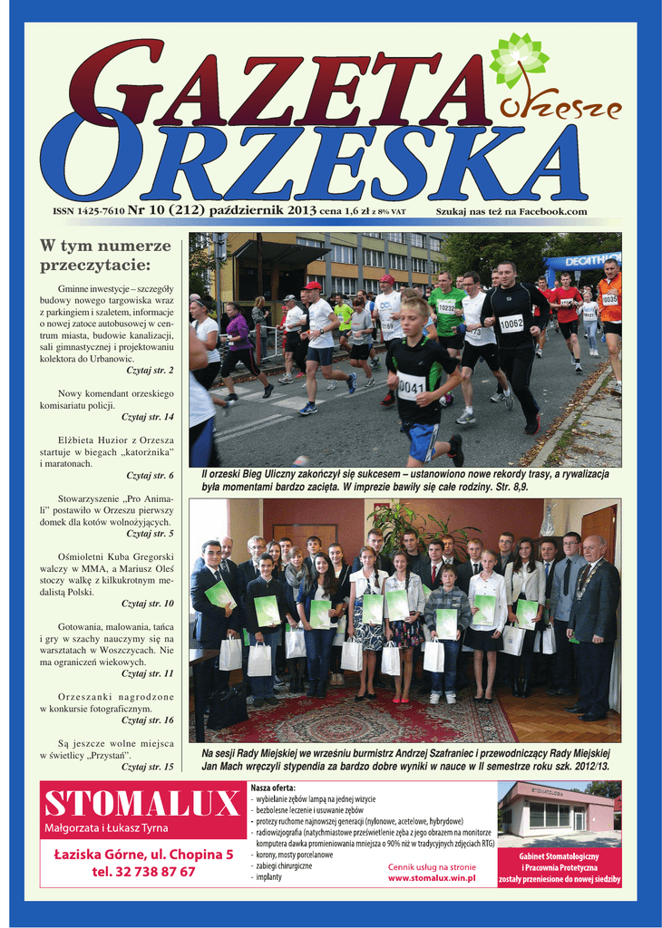 ISSN 1425-7610 Nr 10 (212) październik 2013 cena 1,6 zł z 8% VAT Szukaj nas też na Facebook.com W tym numerze przeczytacie: Gminne inwestycje – szczegóły budowy nowego targowiska wraz z parkingiem i szaletem, informacje o nowej zatoce autobusowej w centrum miasta, budowie kanalizacji, sali gimnastycznej i projektowaniu kolektora do Urbanowic. Czytaj str. 2 Nowy komendant orzeskiego komisariatu policji. Czytaj str. 14 Elżbieta Huzior z Orzesza startuje w biegach „katorżnika” i maratonach. Czytaj str. 6 II orzeski Bieg Uliczny zakończył się sukcesem – ustanowiono nowe rekordy trasy, a rywalizacja była momentami bardzo zacięta. W imprezie bawiły się całe rodziny. Str. 8,9. Stowarzyszenie „Pro Animali” postawiło w Orzeszu pierwszy domek dla kotów wolnożyjących. Czytaj str. 5 Ośmioletni Kuba Gregorski walczy w MMA, a Mariusz Oleś stoczy walkę z kilkukrotnym medalistą Polski. Czytaj str. 10 Gotowania, malowania, tańca i gry w szachy nauczymy się na warsztatach w Woszczycach. Nie ma ograniczeń wiekowych. Czytaj str. 11 Orzeszanki nagrodzone w konkursie fotograficznym. Czytaj str. 16 Są jeszcze wolne miejsca w świetlicy „Przystań”. Czytaj str. 15 Na sesji Rady Miejskiej we wrześniu burmistrz Andrzej Szafraniec i przewodniczący Rady Miejskiej Jan Mach wręczyli stypendia za bardzo dobre wyniki w nauce w II semestrze roku szk. 2012/13. Gminne inwestycje Sześć wiodących inwestycji które gmina już kończy albo właśnie zaczyna, znacząco wpłyną ma poprawę wizerunku i estetyki miasta, a jedna z nich – budowa sieci informatycznej Silesia Net poprawi jakość usług świadczonych przez magistrat. Sprawozdanie z gminnych inwestycji przedstawili na sesji Rady Miejskiej we wrześniu Marek Bem, naczelnik Wydziału Inwestycji oraz burmistrz Andrzej Szafraniec. Budowa targowiska wraz z parkingiem i szaletem Ta długo oczekiwana inwestycja pozwoli uporządkować i poprawić estetykę sporego kawałka ziemi (ok. pół hektara) w centrum miasta. Swoim zasięgiem obejmie gminne grunty począwszy od miejsca gdzie dzisiaj jest parking – klepisko przy strażnicy OSP, w stronę ul. Kopernika. Co będzie robione? Cały teren zostanie wyłożony puzzlami i odwodniony budową kanalizacji deszczowej. Powstaną tu 63 miejsca parkingowe dla samochodów osobowych. Staną też wiaty dla handlowców, ma być ich tyle, że pomieszczą się wszyscy, którzy w czwartki handlują w Orzeszu na targu. Niektóre stanowiska będą mogły być wykorzystywane we wszystkie dni handlowe, nie tylko w czwartki. Na tej działce zbudowany zostanie również długo oczekiwany szalet miejski. Na parking wraz z targowiskiem będziemy mogli wjechać z dwóch stron – tak jak obecnie od ul. św. Wawrzyńca (ten wjazd nie podlega przebudowie) oraz od strony ul. Jasnej – po przeciwnej stronie działki. Wewnątrz tego terenu powstanie przelotowa droga, łącząca oba te wjazdy, którymi jednocześnie będziemy mogli stamtąd wyjechać. Przy okazji tej inwestycji zostanie również specjalnie wydzielony pas ziemi dla swobodnego i bezkolizyjnego przejazdu wozów strażackich. Od targowiska i parkingu publicznego będzie oddzielony krawężnikami i nasadzoną zielenią. Roboty ziemne rozpoczną się już w październiku, a planowane zakończenie tej inwestycji to sierpień przyszłego roku. Koszt robót (przed rozstrzygnięciem przetargu) to 2,6 mln zł, z tego miasto pozyskało dofinansowanie połowy tej kwoty z Programu rozwoju obszarów wiejskich. Przy okazji tej inwestycji, ale jako osobne zadanie, wybudowana 2 zostanie nowa zatoka autobusowa przy ul. św. Wawrzyńca, obsługująca autobusy jadące w stronę Łazisk, Mikołowa. Będzie miała 50 m długości, a jej początek znajdzie się na wysokości wjazdu na probostwo. Tę inwestycję wykonuje Zarząd Dróg Powiatowych w Mikołowie, a Orzesze dokłada się kwotą 45 tys. zł. Przy tej okazji na ul. św. Wawrzyńca zostanie również zrobione przejście dla pieszych – na wysokości pomiędzy furtką a bramą wjazdową do kościoła. Budowa nowej zatoki wraz z przejściem dla pieszych zaczyna się w październiku i jeszcze w tym roku będzie zakończona. Dodajmy jeszcze, że obecny mały parking naprzeciwko kościoła (przy „małym” Amaro) oraz pawilony handlowe przy ul. św. Wawrzyńca pozostają na swoich miejscach – inwestycje nie obejmują tego terenu. Budowa kanalizacja na Waryńskiego i Chopina Do końca listopada zakończą się wszystkie prace związane z budową kanalizacji sanitarnej etap XII zadanie 1, obejmujący rejon ulic Waryńskiego, Chopina i częściowo Wiosny Ludów. W tej chwili prowadzone są roboty drogowe przy kładzeniu nowej nawierzchni zniszczonej budową kanalizacji. Na wniosek mieszkańców ul. Waryńskiego poparty staraniami urzędu, kolej wyremontowała przejazd kolejowy na ul. Waryńskiego. W sumie położono 3,5 km kolektorów ściekowych oraz wybudowano dwie przepompownie sieciowe. Pierwsi mieszkańcy zaczynają się już podłączać do nowej sieci. Silesia Net Kolejną inwestycją prowadzoną przez miasto jest Silesia Net – Budowa Społeczeństwa Informacyjnego w subregionie centralnym województwa Śląskiego. Decyzja o przystąpieniu do tej inwestycji zapadła jeszcze w ubiegłej kadencji władz samorządowych. W ramach tego projektu realizowane są m.in. projektowanie sieci światłowodowej a także budowa rurociągów kablowych. Liderem projektu w którym uczestniczy Orzesze jest Starostwo Powiatowe w Mikołowie, a prace prowadzone są we wszystkich gminach naszego powiatu. W przyszłości sieć światłowodowa powiatu mikołowskiego połączona zostanie w jeden system z sieciami, które zakładane są w całym subregionie i powstanie sieć metropolitalna, której właścicielem będą samorządy. Realizacja tego zadania to wypełnienie jednej z dyrektyw unijnych nakazującej budowę sieci internetowej szerokopasmowej. Po jej uruchomieniu znacznie zwiększy się szybkość i pojemnoś