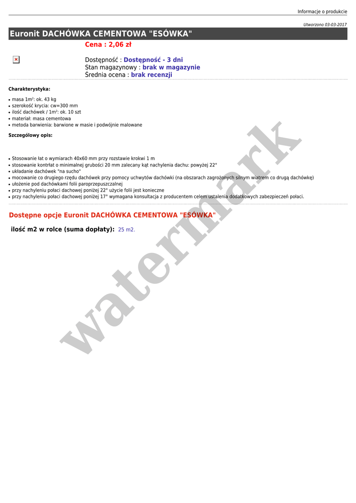 Informacje o produkcie Utworzono 03-03-2017 Euronit DACHÓWKA CEMENTOWA "ESÓWKA" Cena : 2,06 zł Dostępność : Dostępność - 3 dni Stan magazynowy : brak w magazynie Średnia ocena : brak recenzji Charakterystyka: ● ● ● ● ● masa 1m2: ok. 43 kg szerokość krycia: cw=300 mm ilość dachówek / 1m2: ok. 10 szt materiał: masa cementowa metoda barwienia: barwione w masie i podwójnie malowane ● ● ● ● ● ● ● er m ar k Szczególowy opis: Stosowanie łat o wymiarach 40x60 mm przy rozstawie krokwi 1 m stosowanie kontrłat o minimalnej grubości 20 mm zalecany kąt nachylenia dachu: powyżej 22° układanie dachówek "na sucho" mocowanie co drugiego rzędu dachówek przy pomocy uchwytów dachówki (na obszarach zagrożonych silnym wiatrem co drugą dachówkę) ułożenie pod dachówkami folii paroprzepuszczalnej przy nachyleniu połaci dachowej poniżej 22° użycie folii jest konieczne przy nachyleniu połaci dachowej poniżej 17° wymagana konsultacja z producentem celem ustalenia dodatkowych zabezpieczeń połaci. Dostępne opcje Euronit DACHÓWKA CEMENTOWA "ESÓWKA" w at ilość m2 w rolce (suma dopłaty): 25 m2.