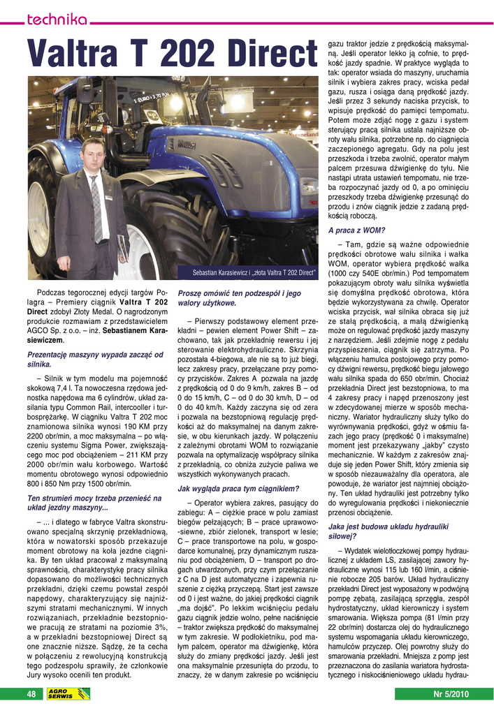 technika Valtra T 202 Direct gazu traktor jedzie z prędkością maksymalną. Jeśli operator lekko ją cofnie, to prędkość jazdy spadnie. W praktyce wygląda to tak: operator wsiada do maszyny, uruchamia silnik i wybiera zakres pracy, wciska pedał gazu, rusza i osiąga daną prędkość jazdy. Jeśli przez 3 sekundy naciska przycisk, to wpisuje prędkość do pamięci tempomatu. Potem może zdjąć nogę z gazu i system sterujący pracą silnika ustala najniższe obroty wału silnika, potrzebne np. do ciągnięcia zaczepionego agregatu. Gdy na polu jest przeszkoda i trzeba zwolnić, operator małym palcem przesuwa dźwigienkę do tyłu. Nie nastąpi utrata ustawień tempomatu, nie trzeba rozpoczynać jazdy od 0, a po ominięciu przeszkody trzeba dźwigienkę przesunąć do przodu i znów ciągnik jedzie z zadaną prędkością roboczą. A praca z WOM? Sebastian Karasiewicz i „złota Valtra T 202 Direct” Podczas tegorocznej edycji targów Polagra – Premiery ciągnik Valtra T 202 Direct zdobył Złoty Medal. O nagrodzonym produkcie rozmawiam z przedstawicielem AGCO Sp. z o.o. – inż. Sebastianem Karasiewiczem. Prezentację maszyny wypada zacząć od silnika. – Silnik w tym modelu ma pojemność skokową 7,4 l. Ta nowoczesna rzędowa jednostka napędowa ma 6 cylindrów, układ zasilania typu Common Rail, intercooller i turbosprężarkę. W ciągniku Valtra T 202 moc znamionowa silnika wynosi 190 KM przy 2200 obr/min, a moc maksymalna – po włączeniu systemu Sigma Power, zwiększającego moc pod obciążeniem – 211 KM przy 2000 obr/min wału korbowego. Wartość momentu obrotowego wynosi odpowiednio 800 i 850 Nm przy 1500 obr/min. Ten strumień mocy trzeba przenieść na układ jezdny maszyny... – ... i dlatego w fabryce Valtra skonstruowano specjalną skrzynię przekładniową, która w nowatorski sposób przekazuje moment obrotowy na koła jezdne ciągnika. By ten układ pracował z maksymalną sprawnością, charakterystykę pracy silnika dopasowano do możliwości technicznych przekładni, dzięki czemu powstał zespół napędowy, charakteryzujący się najniższymi stratami mechanicznymi. W innych rozwiązaniach, przekładnie bezstopniowe pracują ze stratami na poziomie 3%, a w przekładni bezstopniowej Direct są one znacznie niższe. Sądzę, że ta cecha w połączeniu z rewolucyjną konstrukcją tego podzespołu sprawiły, że członkowie Jury wysoko ocenili ten produkt. 48 Proszę omówić ten podzespół i jego walory użytkowe. – Pierwszy podstawowy element przekładni – pewien element Power Shift – zachowano, tak jak przekładnię rewersu i jej sterowanie elektrohydrauliczne. Skrzynia pozostała 4-biegowa, ale nie są to już biegi, lecz zakresy pracy, przełączane przy pomocy przycisków. Zakres A pozwala na jazdę z prędkością od 0 do 9 km/h, zakres B – od 0 do 15 km/h, C – od 0 do 30 km/h, D – od 0 do 40 km/h. Każdy zaczyna się od zera i pozwala na bezstopniową regulację prędkości aż do maksymalnej na danym zakresie, w obu kierunkach jazdy. W połączeniu z zależnymi obrotami WOM to rozwiązanie pozwala na optymalizację współpracy silnika z przekładnią, co obniża zużycie paliwa we wszystkich wykonywanych pracach. Jak wygląda praca tym ciągnikiem? – Operator wybiera zakres, pasujący do zabiegu: A – ciężkie prace w polu zamiast biegów pełzających; B – prace uprawowo-siewne, zbiór zielonek, transport w lesie; C – prace transportowe na polu, w gospodarce komunalnej, przy dynamicznym ruszaniu pod obciążeniem, D – transport po drogach utwardzonych, przy czym przełączanie z C na D jest automatyczne i zapewnia ruszenie z ciężką przyczepą. Start jest zawsze od 0 i jest ważne, do jakiej prędkości ciągnik „ma dojść”. Po lekkim wciśnięciu pedału gazu ciągnik jedzie wolno, pełne naciśnięcie – traktor zwiększa prędkość do maksymalnej w tym zakresie. W podłokietniku, pod małym palcem, operator ma dźwigienkę, która służy do zmiany prędkości jazdy. Jeśli jest ona maksymalnie przesunięta do przodu, to znaczy, że w danym zakresie po wciśnięciu – Tam, gdzie są ważne odpowiednie prędkości obrotowe wału silnika i wałka WOM, operator wybiera prędkość wałka (1000 czy 540E obr/min.) Pod tempomatem pokazującym obroty wału silnika wyświetla się domyślna prędkość obrotowa, która będzie wykorzystywana za chwilę. Operator wciska przycisk, wał silnika obraca się już ze stałą prędkością, a małą dźwigienką może on regulować prędkość jazdy maszyny z narzędziem. Jeśli zdejmie nogę z pedału przyspieszenia, ciągnik się zatrzyma. Po włączeniu hamulca postojowego przy pomocy dźwigni rewersu, prędkość biegu jałowego wału silnika spada do 650 obr/min. Chociaż przekładnia Direct jest bezstopniowa, to ma 4 zakresy pracy i napęd przenoszony jest w zdecydowanej mierze w sposób mechaniczny. Wariator hydrauliczny służy tylko do wyrównywania prędkości, gdyż w ośmiu fazach jego pracy (prędkość 0 i maksymalne) moment jest przekazywany „jakby” czysto mechanicznie. W każdym z zakresów znajduje się jeden Power Shift, który zmienia się w sposób niezauważalny dla operatora, ale powoduje, że wariator jest najmniej obciążony. Ten układ hydrauliki jest potrzebny tylko do wyregulowania prędkości i niekoniecznie przenosi obciążenie. Jaka jest budowa układu hydrauliki siłowej? – Wydatek wielotłoczkowej pompy hydraulicznej z układem LS, zasilającej zawory hydrauliczne wynosi 115 lub 160 l/min, a ciśnienie robocze 205 barów. Układ hydrauliczny przekładni Direct jest wyposażony w podwójną pompę zębatą, zasilającą sprzęgła, zespół hydrostatyczny, układ kierowniczy i system smarowania. Większa pompa (81 l/min przy 22 obr/min) dostarcza olej do hydraulicznego systemu wspomagania układu kierowniczego, hamulców przyczep. Olej powrotny służy do smarowania przekładni. Mniejsza z pomp jest przeznaczona do zasilania