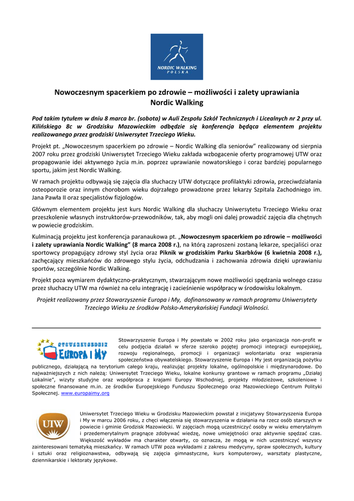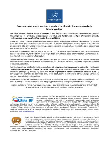 Nowoczesnym spacerkiem po zdrowie – możliwości i zalety uprawiania Nordic Walking Pod takim tytułem w dniu 8 marca br. (sobota) w Auli Zespołu Szkół Technicznych i Licealnych nr 2 przy ul. Kilińskiego 8c w Grodzisku Mazowieckim odbędzie się konferencja będąca elementem projektu realizowanego przez grodziski Uniwersytet Trzeciego Wieku. Projekt pt. „Nowoczesnym spacerkiem po zdrowie – Nordic Walking dla seniorów” realizowany od sierpnia 2007 roku przez grodziski Uniwersytet Trzeciego Wieku zakłada wzbogacenie oferty programowej UTW oraz propagowanie idei aktywnego życia m.in. poprzez uprawianie nowatorskiego i coraz bardziej popularnego sportu, jakim jest Nordic Walking. W ramach projektu odbywają się zajęcia dla słuchaczy UTW dotyczące profilaktyki zdrowia, przeciwdziałania osteoporozie oraz innym chorobom wieku dojrzałego prowadzone przez lekarzy Szpitala Zachodniego im. Jana Pawła II oraz specjalistów fizjologów. Głównym elementem projektu jest kurs Nordic Walking dla słuchaczy Uniwersytetu Trzeciego Wieku oraz przeszkolenie własnych instruktorów‐przewodników, tak, aby mogli oni dalej prowadzić zajęcia dla chętnych w powiecie grodziskim. Kulminacją projektu jest konferencja paranaukowa pt. „Nowoczesnym spacerkiem po zdrowie – możliwości i zalety uprawiania Nordic Walking” (8 marca 2008 r.), na którą zaproszeni zostaną lekarze, specjaliści oraz sportowcy propagujący zdrowy styl życia oraz Piknik w grodziskim Parku Skarbków (6 kwietnia 2008 r.), zachęcający mieszkańców do zdrowego stylu życia, odchudzania i zachowania zdrowia dzięki uprawianiu sportów, szczególnie Nordic Walking. Projekt poza wymiarem dydaktyczno‐praktycznym, stwarzającym nowe możliwości spędzania wolnego czasu przez słuchaczy UTW ma również na celu integrację i zacieśnienie współpracy w środowisku lokalnym. Projekt realizowany przez Stowarzyszenie Europa i My, dofinansowany w ramach programu Uniwersytety Trzeciego Wieku ze środków Polsko‐Amerykańskiej Fundacji Wolności. Stowarzyszenie Europa i My powstało w 2002 roku jako organizacja non-profit w celu podjęcia działań w sferze szeroko pojętej promocji integracji europejskiej, rozwoju regionalnego, promocji i organizacji wolontariatu oraz wspierania społeczeństwa obywatelskiego. Stowarzyszenie Europa i My jest organizacją pożytku publicznego, działającą na terytorium całego kraju, realizując projekty lokalne, ogólnopolskie i międzynarodowe. Do najważniejszych z nich należą: Uniwersytet Trzeciego Wieku, lokalne konkursy grantowe w ramach programu „Działaj Lokalnie”, wizyty studyjne oraz współpraca z krajami Europy Wschodniej, projekty młodzieżowe, szkoleniowe i społeczne finansowane m.in. ze środków Europejskiego Funduszu Społecznego oraz Mazowieckiego Centrum Polityki Społecznej. www.europaimy.org Uniwersytet Trzeciego Wieku w Grodzisku Mazowieckim powstał z inicjatywy Stowarzyszenia Europa i My w marcu 2006 roku, z chęci włączenia się stowarzyszenia w działania na rzecz osób starszych w powiecie i gminie Grodzisk Mazowiecki. W zajęciach mogą uczestniczyć osoby w wieku emerytalnym i przedemerytalnym pragnące zdobywać wiedzę, nowe umiejętności oraz aktywnie spędzać czas. Większość wykładów ma charakter otwarty, co oznacza, że mogą w nich uczestniczyć wszyscy zainteresowani tematyką mieszkańcy. W ramach UTW poza wykładami z zakresu medycyny, spraw społecznych, kultury i sztuki oraz religioznawstwa, odbywają się zajęcia gimnastyczne, kurs komputerowy, warsztaty plastyczne, dziennikarskie i lektoraty językowe. CO TO JEST NORDIC WALKING ? NORDIC WALKING (NW) jest to spacer z kijami, dzięki którym marsz jest intensywniejszy i angażuje ok. 90% naszego układu mięśniowego (ok.600 mięśni). Powoduje mniejsze zmęczenie niż zwykły marsz w takim tempie, za to spalamy dwukrotnie więcej kalorii niż podczas zwyczajnego spaceru. Powstał w Finlandii ale w ostatnich latach stał się bardzo popularny także w Polsce. • Podczas godzinnego treningu NW spalimy ok. 400‐500 kcal. Dla porównania, tradycyjny marsz pozwala spalić tylko 280 kalorii. • W spacer z kijami zaangażowanych jest aż 90 proc. mięśni! To niewątpliwie jedyna forma aktywności, która mobilizuje tyle mięśni naraz. • Podczas godzinnego spaceru z kijkami mamy szansę przejść 7–10 kilometrów, bez nich tylko 3–4. DLA KOGO NORDIC WALKING ? • • • • • • dla osób pragnących poprawić swoją sylwetkę oraz pozbyć się nadwagi – redukuje zbędne kilogramy i tkankę tłuszczową. W połączeniu ze zdrową dietą doskonale modeluje ciało; dla osób z problemami zdrowotnymi – jest pomocny w łagodzeniu m.in. dolegliwości stawowych; dla osób narażonych na stres – likwiduje napięcie w obrębie ramion i karku; dla kobiet w ciąży – zapewnia sprawność poprzez wzmocnienie muskulatury ciała; dla osób starszych – jest bezpieczną formą aktywności, połączonej ze spędzaniem czasu na świeżym powietrzu ; dla młodzieży – pozwala na poprawienie kondycji fizycznej oraz koordynacji ruchowej, jest doskonałym treningiem ogólnorozwojowym Ogromną zaletą tej formy ruchu jest brak przeciwwskazań do treningu. Bez obaw mogą go uprawiać , mężczyźni, kobiety, osoby starsze, osoby wymagające uaktywnienia aparatu ruchowego, młode, wysportowane oraz nie mające czasu na żadną aktywność fizyczną. ZAPRASZAMY NA KONFERENCJĘ, PIKNIK I ZAJĘCIA WSZYSTKIE OSOBY, KTÓRE PRAGNĄ SCHUDNĄĆ, ZRELAKSOWAĆ SIĘ, WZMOCNIĆ MIĘŚNIE, SERCE, POPRAWIĆ KONDYCJĘ FIZYCZNĄ, KTÓRE CHCĄ WYJŚĆ Z DOMU I ZROBIĆ COŚ DLA SIEBIE!!! Grodziscy seniorzy z Uniwersytetu Trzeciego Wieku podczas treningu… Jeśli chcesz wspierać wymienione wyżej i podobne działania na terenie powiatu grodziskiego przekaż 1% dla Stowarzyszenia Europa i My. NR KRS 000119073.