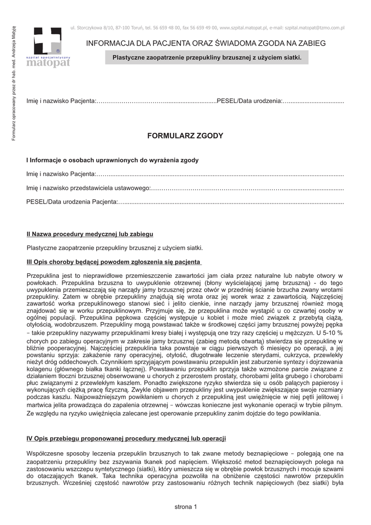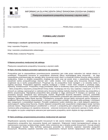 Formularz opracowany przez dr hab. med. Andrzeja Matyjê ul. Storczykowa 8/10, 87-100 Toruñ, tel. 56 659 48 00, fax 56 659 49 00, www.szpital.matopat.pl, e-mail: [email protected] INFORMACJA DLA PACJENTA ORAZ ŒWIADOMA ZGODA NA ZABIEG R Plastyczne zaopatrzenie przepukliny brzusznej z u¿yciem siatki. Imiê i nazwisko Pacjenta:……………………………..............................PESEL/Data urodzenia:…................................ FORMULARZ ZGODY I Informacje o osobach uprawnionych do wyra¿enia zgody Imiê i nazwisko Pacjenta:……........................................................................................................................................ Imiê i nazwisko przedstawiciela ustawowego:……………………………………………………….................................... PESEL/Data urodzenia Pacjenta:…............................................................................................................................... II Nazwa procedury medycznej lub zabiegu . Plastyczne zaopatrzenie przepukliny brzusznej z u¿yciem siatki. . III Opis choroby bêd¹cej powodem zg³oszenia siê pacjenta . Przepuklina jest to nieprawid³owe przemieszczenie zawartoœci jam cia³a przez naturalne lub nabyte otwory w pow³okach. Przepuklina brzuszna to uwypuklenie otrzewnej (b³ony wyœcielaj¹cej jamê brzuszn¹) - do tego uwypuklenia przemieszczaj¹ siê narz¹dy jamy brzusznej przez otwór w przedniej œcianie brzucha zwany wrotami przepukliny. Zatem w obrêbie przepukliny znajduj¹ siê wrota oraz jej worek wraz z zawartoœci¹. Najczêœciej zawartoœæ worka przepuklinowego stanowi sieæ i jelito cienkie, inne narz¹dy jamy brzusznej równie¿ mog¹ znajdowaæ siê w worku przepuklinowym. Przyjmuje siê, ¿e przepuklina mo¿e wyst¹piæ u co czwartej osoby w ogólnej populacji. Przepuklina pêpkowa czêœciej wystêpuje u kobiet i mo¿e mieæ zwi¹zek z przebyt¹ ci¹¿¹, oty³oœci¹, wodobrzuszem. Przepukliny mog¹ powstawaæ tak¿e w œrodkowej czêœci jamy brzusznej powy¿ej pêpka – takie przepukliny nazywamy przepuklinami kresy bia³ej i wystêpuj¹ one trzy razy czêœciej u mê¿czyzn. U 5-10 % chorych po zabiegu operacyjnym w zakresie jamy brzusznej (zabieg metod¹ otwart¹) stwierdza siê przepuklinê w bliŸnie pooperacyjnej. Najczêœciej przepuklina taka powstaje w ci¹gu pierwszych 6 miesiêcy po operacji, a jej powstaniu sprzyja: zaka¿enie rany operacyjnej, oty³oœæ, d³ugotrwa³e leczenie sterydami, cukrzyca, przewlek³y nie¿yt dróg oddechowych. Czynnikiem sprzyjaj¹cym powstawaniu przepuklin jest zaburzenie syntezy i dojrzewania kolagenu (g³ównego bia³ka tkanki ³¹cznej). Powstawaniu przepuklin sprzyja tak¿e wzmo¿one parcie zwi¹zane z dzia³aniem t³oczni brzusznej obserwowane u chorych z przerostem prostaty, chorobami jelita grubego i chorobami p³uc zwi¹zanymi z przewlek³ym kaszlem. Ponadto zwiêkszone ryzyko stwierdza siê u osób pal¹cych papierosy i wykonuj¹cych ciê¿k¹ pracê fizyczn¹. Zwykle objawem przepukliny jest uwypuklenie zwiêkszaj¹ce swoje rozmiary podczas kaszlu. Najpowa¿niejszym powik³aniem u chorych z przepuklin¹ jest uwiêŸniêcie w niej pêtli jelitowej i martwica jelita prowadz¹ca do zapalenia otrzewnej – wówczas konieczne jest wykonanie operacji w trybie pilnym. Ze wzglêdu na ryzyko uwiêŸniêcia zalecane jest operowanie przepukliny zanim dojdzie do tego powik³ania. IV Opis przebiegu proponowanej procedury medycznej lub operacji . Wspó³czesne sposoby leczenia przepuklin brzusznych to tak zwane metody beznapiêciowe – polegaj¹ one na zaopatrzeniu przepukliny bez zszywania tkanek pod napiêciem. Wiêkszoœæ metod beznapiêciowych polega na zastosowaniu wszczepu syntetycznego (siatki), który umieszcza siê w obrêbie pow³ok brzusznych i mocuje szwami do otaczaj¹cych tkanek. Taka technika operacyjna pozwoli³a na obni¿enie czêstoœci nawrotów przepuklin brzusznych. Wczeœniej czêstoœæ nawrotów przy zastosowaniu ró¿nych technik napiêciowych (bez siatki) by³a strona 1 Formularz opracowany przez dr hab. med. Andrzeja Matyjê Imiê i nazwisko Pacjenta:……………………………..............................PESEL/Data urodzenia:…................................ wiêksza. Sposób leczenia, który pragniemy Pañstwu zaproponowaæ to beznapiêciowe zaopatrzenie przepukliny brzusznej z zastosowaniem siatki. Metoda ta polega na odprowadzeniu zawartoœci przepukliny do jamy otrzewnej a nastêpnie umieszczeniu prostok¹tnej siatki w pow³okach brzusznych (na ró¿nej g³êbokoœci w zale¿noœci od rodzaju zabiegu) i przyszyciu jej do otaczaj¹cych tkanek (to znaczy do rozciêgien miêœni brzucha). Stosowana siatka mo¿e byæ wykonana z materia³u niewch³anialnego (polipropylenu) lub mo¿e byæ czêœciowo wch³anialna. Wybór rodzaju i wielkoœci siatki zostanie dokonany przez chirurga na podstawie oceny wielkoœci ubytku pow³ok stanowi¹cego wrota przepukliny. Celem wykonania opisanej powy¿ej operacji konieczne jest wykonanie pod³u¿nego ciêcia w zakresie pow³ok brzusznych lub kilku krótszych naciêæ pow³ok brzusznych w przypadku operacji metod¹ laparoskopow¹. D³ugoœæ naciêcia skóry zale¿y od wielkoœci przepukliny w przypadku operowania technik¹ otwart¹, w przypadku techniki laparoskopowej d³ugoœæ naciêæ skóry nie zale¿y od wielkoœci przepukliny. W metodzie laparoskopowej stosuje siê zwykle siatki podwójne, których jedna warstwa – ta, która przylega do jelit, wykonana jest z materia³u zapobiegaj¹cemu powstawaniu zrostów miêdzy jelitami a siatk¹. Opisywane zabiegi zwykle wymagaj¹ zastosowania znieczulenia ogólnego i intubacji. Po otwartym zaopatrzeniu przepukliny brzusznej mo¿e byæ konieczne umieszczenie w pow³okach brzusznych kilku drenów, które zostan¹ usuniête w ci¹gu kilku dni po zabiegu. Pacjenci po zaopatrzeniu przepuklin pow³ok brzusznych wymagaj¹ kilkudniowej hospitalizacji przed wypisaniem ze sz