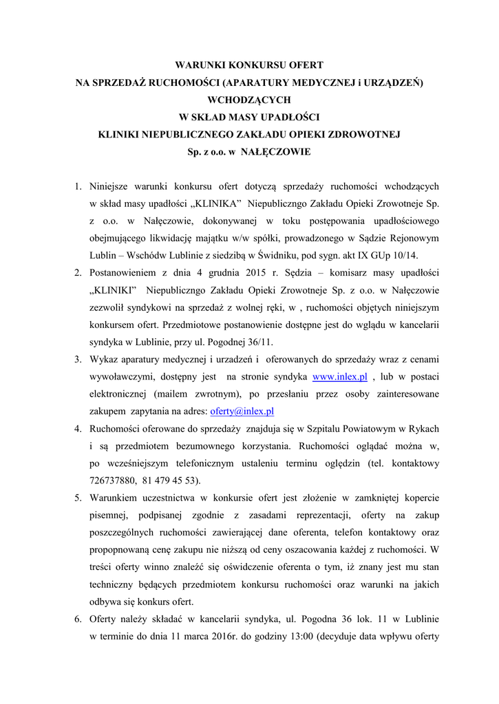 WARUNKI KONKURSU OFERT NA SPRZEDAŻ RUCHOMOŚCI (APARATURY MEDYCZNEJ i URZĄDZEŃ) WCHODZĄCYCH W SKŁAD MASY UPADŁOŚCI KLINIKI NIEPUBLICZNEGO ZAKŁADU OPIEKI ZDROWOTNEJ Sp. z o.o. w NAŁĘCZOWIE 1. Niniejsze warunki konkursu ofert dotyczą sprzedaży ruchomości wchodzących w skład masy upadłości „KLINIKA” Niepubliczngo Zakładu Opieki Zrowotneje Sp. z o.o. w Nałęczowie, dokonywanej w toku postępowania upadłościowego obejmującego likwidację majątku w/w spółki, prowadzonego w Sądzie Rejonowym Lublin – Wschódw Lublinie z siedzibą w Świdniku, pod sygn. akt IX GUp 10/14. 2. Postanowieniem z dnia 4 grudnia 2015 r. Sędzia – komisarz masy upadłości „KLINIKI” Niepubliczngo Zakładu Opieki Zrowotneje Sp. z o.o. w Nałęczowie zezwolił syndykowi na sprzedaż z wolnej ręki, w , ruchomości objętych niniejszym konkursem ofert. Przedmiotowe postanowienie dostępne jest do wglądu w kancelarii syndyka w Lublinie, przy ul. Pogodnej 36/11. 3. Wykaz aparatury medycznej i urzadzeń i oferowanych do sprzedaży wraz z cenami wywoławczymi, dostępny jest na stronie syndyka www.inlex.pl , lub w postaci elektronicznej (mailem zwrotnym), po przesłaniu przez osoby zainteresowane zakupem zapytania na adres: [email protected] 4. Ruchomości oferowane do sprzedaży znajduja się w Szpitalu Powiatowym w Rykach i są przedmiotem bezumownego korzystania. Ruchomości oglądać można w, po wcześniejszym telefonicznym ustaleniu terminu oględzin (tel. kontaktowy 726737880, 81 479 45 53). 5. Warunkiem uczestnictwa w konkursie ofert jest złożenie w zamkniętej kopercie pisemnej, podpisanej zgodnie z zasadami reprezentacji, oferty na zakup poszczególnych ruchomości zawierającej dane oferenta, telefon kontaktowy oraz propopnowaną cenę zakupu nie niższą od ceny oszacowania każdej z ruchomości. W treści oferty winno znaleźć się oświdczenie oferenta o tym, iż znany jest mu stan techniczny będących przedmiotem konkursu ruchomości oraz warunki na jakich odbywa się konkurs ofert. 6. Oferty należy składać w kancelarii syndyka, ul. Pogodna 36 lok. 11 w Lublinie w terminie do dnia 11 marca 2016r. do godziny 13:00 (decyduje data wpływu oferty do kancelarii syndyka lub potwierdzenia przez kancelarię odbioru poczty elektronicznej). 7. Poprzez złożenie oferty na zakup ruchomości, oferent potwierdza, iż zapoznał się ze stanem technicznym i prawnym ruchomości oraz warunkami konkursu ofert oraz że je akceptuje. 8. Ogłoszenie prasowe z ofertą sprzedaży ruchomości ukaże się w dzienniku „Gazeta Wyborcza” w dniu 23 stycznia 2016 r, oraz na portalach gratka, allegro i OLX. 9. Otwarcie ofert nastąpi w kancelarii syndyka w Lublinie, przy ul. Pogodnej 36 lok. 11, w dniu 11 marca 2016 r., o godzinie 13.05. 10. W przypadku złożenia więcej niż jednej oferty na zakup poszczególnych ruchomości, syndyk zastrzega możliwość przeprowadzenia uzupełniającej licytacji, w której wziąć mogą udział podmioty, które złożyły ważne oferty na zakup ruchomości, przy czym ceną wywoławczą będzie najwyższa zaproponowana w złożonych ofertach cena, a kwota postąpienia zostanie samodzielnie ustalona przez syndyka. W takim przypadku podmioty przystępujące do licytacji winny być obecne przy otwarciu lub winny być dostępne pod numerem wcześniej podanego telefonu. 11. Warunkiem zawarcia umowy sprzedaży ruchomości z podmiotem, który wygrał konkurs ofert, jest wpłata na konto masy upadłości całości ceny (tj. przed dniem zawarcia umowy sprzedaży). Kupujący zobowiązany jest do poniesienia wszelkich kosztów związanych z zawarciem umowy sprzedaży. 12. Dodatkowe informacje na temat konkursu ofert i oferowanych do sprzedaży ruchomości dostępne są pod nr. tel. 81 479-45-53, 600 418 844.
