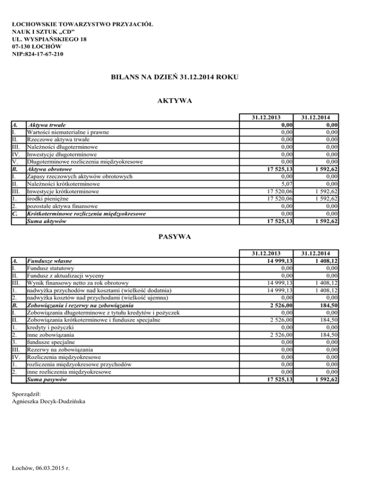 ŁOCHOWSKIE TOWARZYSTWO PRZYJACIÓŁ NAUK I SZTUK „CD” UL. WYSPIAŃSKIEGO 18 07-130 ŁOCHÓW NIP:824-17-67-210 BILANS NA DZIEŃ 31.12.2014 ROKU AKTYWA 31.12.2013 A. I. II. III. IV. V. B. I. II. III. 1. 2. C. Aktywa trwałe Wartości niematerialne i prawne Rzeczowe aktywa trwałe Należności długoterminowe Inwestycje długoterminowe Długoterminowe rozliczenia międzyokresowe Aktywa obrotowe Zapasy rzeczowych aktywów obrotowych Należności krótkoterminowe Inwestycje krótkoterminowe środki pieniężne pozostałe aktywa finansowe Krótkoterminowe rozliczenia międzyokresowe Suma aktywów 0,00 0,00 0,00 0,00 0,00 0,00 17 525,13 0,00 5,07 17 520,06 17 520,06 0,00 0,00 17 525,13 31.12.2014 0,00 0,00 0,00 0,00 0,00 0,00 1 592,62 0,00 0,00 1 592,62 1 592,62 0,00 0,00 1 592,62 31.12.2013 14 999,13 0,00 0,00 14 999,13 14 999,13 0,00 2 526,00 0,00 2 526,00 0,00 2 526,00 0,00 0,00 0,00 0,00 0,00 17 525,13 31.12.2014 1 408,12 0,00 0,00 1 408,12 1 408,12 0,00 184,50 0,00 184,50 0,00 184,50 0,00 0,00 0,00 0,00 0,00 1 592,62 PASYWA A. I. II. III. 1. 2. B. I. II. 1. 2. 3. III. IV. 1. 2. Fundusze własne Fundusz statutowy Fundusz z aktualizacji wyceny Wynik finansowy netto za rok obrotowy nadwyżka przychodów nad kosztami (wielkość dodatnia) nadwyżka kosztów nad przychodami (wielkość ujemna) Zobowiązania i rezerwy na zobowiązania Zobowiązania długoterminowe z tytułu kredytów i pożyczek Zobowiązania krótkoterminowe i fundusze specjalne kredyty i pożyczki inne zobowiązania fundusze specjalne Rezerwy na zobowiązania Rozliczenia międzyokresowe rozliczenia międzyokresowe przychodów inne rozliczenia międzyokresowe Suma pasywów Sporządził: Agnieszka Decyk-Dudzińska Łochów, 06.03.2015 r. ŁOCHOWSKIE TOWARZYSTWO PRZYJACIÓŁ NAUK I SZTUK „CD” UL. WYSPIAŃSKIEGO 18 07-130 ŁOCHÓW NIP:824-17-67-210 RACHUNEK ZYSKÓW I STRAT ZA OKRES 01.01.2014 – 31.12.2014 ROKU A. I. II. B. C. D. 1. 2. 3. 4. 5. 6. E. F. G. H. I. J. I. II. K. I. II. Przychody z działalności statutowej Składki brutto określone statutem Inne przychody określone statutem Koszty realizacji zadań statutowych Wynik finansowy na działalności statutowej (A-B) Koszty administracyjne zużycie materiałów i energii usługi obce podatki i opłaty wynagrodzenia oraz ubezpieczenia społeczne i inne świadczenia amortyzacja pozostałe Pozostałe przychody (nie wymienione w poz. A i G) Pozostałe koszty (nie wymienione w poz. B, D i H) Przychody finansowe Koszty finansowe Wynik finansowy brutto na całokształcie działalności (C-D+E-F+G-H) Zyski i straty nadzwyczajne Zyski nadzwyczajne Straty nadzwyczajne Wynik finansowy ogółem (I+J) Różnica zwiększająca koszty roku nastepnego Różnica zwiększająca przychody roku następnego Sporządził: Agnieszka Decyk-Dudzińska Łochów, 06.03.2015 r. 31.12.2013 42 282,80 1 860,00 40 422,80 25 277,94 17 004,86 2 040,51 0,00 2 040,51 0,00 0,00 0,00 0,00 0,00 0,49 35,27 0,00 14 999,13 0,00 0,00 0,00 14 999,13 0,00 14 999,13 31.12.2014 125 460,64 720,00 124 740,64 121 696,91 3 763,73 2 376,01 19,70 2 355,42 0,00 0,89 0,00 0,00 0,00 0,00 20,41 0,01 1 408,12 0,00 0,00 0,00 1 408,12 0,00 1 408,12 ŁOCHOWSKIE TOWARZYSTWO PRZYJACIÓŁ NAUK I SZTUK „CD” SPRAWOZDANIE FINANSOWE ZA OKRES OD 01. STYCZNIA DO 31. GRUDNIA 2014 ROKU MARZEC 2015 INFORMACJA DODATKOWA 1. Sprawozdanie finansowe Łochowskiego Towarzystwa Przyjaciół Nauk i Sztuk „CD” z siedzibą w Łochowie, ul. Wyspiańskiego 18 zostało sporządzone zgodnie z Ustawą z dnia 29 września 1994 roku o rachunkowości oraz Rozporządzeniem Ministra Finansów z dnia 15 listopada 2001 roku w sprawie szczególnych zasad rachunkowości dla niektórych jednostek niebędących spółkami handlowymi, nie prowadzących działalności gospodarczej (zwane w dalszej treści Rozporządzeniem). 2. Celem działalności Stowarzyszenia jest: • podnoszenie szans edukacyjnych dzieci, młodzieży oraz osób zainteresowanych nauką i sztuką, • wspieranie działalności naukowej i twórczości, • popularyzacja nauki i sztuki, • umacnianie więzi obywatelskich między mieszkańcami, • wspieranie zrównoważonego rozwoju Łochowa i okolic, • działania na rzecz intergracji europejskiej, • upowszechnianie i ochrona praw człowieka i swobód obywatelskich. 3. Stowarzyszenie dokonało wpisu do Krajowego Rejestru Sądowego w Rejestrze Stowarzyszeń, Innych Organizacji Społecznych i Zawodowych, Fundacji i Publicznych Zakładów Opieki Zdrowotnej w dniu 17.03.2008 roku pod numerem KRS 0000301207. 4. Stowarzyszenie prezentuje sprawozdanie finansowe za rok obrotowy rozpoczynający się 01.01.2014 roku i kończący się 31.12.2014 roku. 5. Sprawozdanie finansowe zostało sporządzone przy założeniu kontynuowania działalności przez Stowarzyszenie w dającej się przewidzieć przyszłości, obejmującej okres nie krótszy niż jeden rok od dnia bilansowego, w nie zmniejszonym istotnie zakresie. Nie istnieją również okoliczności wskazujące na zagrożenie kontynuowania działalności. 6. Sprawozdanie finansowe zawiera dane finansowe za rok obrotowy 2014 oraz porównywalne dane finansowe za rok obrotowy 2013. 7. Sprawozdanie finansowe zostało sporządzone z uwzględnieniem nadrzędnych zasad rachunkowości określonych ustawą o rachunkowości oraz odrębnych przepisów regulujących zasady gospodarki finansowej Stowarzyszenia. 8. Stowarzyszenie sporządza sprawozdanie w formie uproszczonej określonej przepisami Rozporządzenia Ministra Finansów dla jednostek nie prowadzących działalności gospodarczej. 9. Wynik finansowy Stowarzyszenia za dany rok obrotowy obejmuje wszystkie osiągnięte i przypadające na jej rzecz przychody oraz związane z tymi przychodami koszty zgodnie z zasadami memoriału oraz współmierności przychodów i kosztów. 10. Stowarzyszenie w roku 2014 nie dokonało zmian zasad rachunkowości. 11. Stowarzyszenie na dzień 31. grudnia 2014 roku nie posiadało wartości niematerialnych i prawnych. 12.