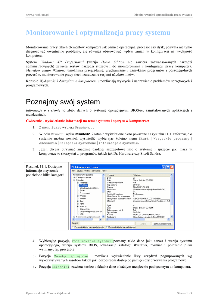 www.graphium.pl Monitorowanie i optymalizacja pracy systemu Monitorowanie i optymalizacja pracy systemu Monitorowanie pracy takich elementów komputera jak pamięć operacyjna, procesor czy dysk, pozwala nie tylko diagnozować ewentualne problemy, ale równieŜ obserwować wpływ zmian w konfiguracji na wydajność komputera. System Windows XP Professional (wersja Home Edition nie zawiera zaawansowanych narzędzi administracyjnych) zawiera zestaw narzędzi słuŜących do monitorowania i konfiguracji pracy komputera. MenedŜer zadań Windows umoŜliwia przeglądanie, uruchamianie i zamykanie programów i poszczególnych procesów, monitorowanie pracy sieci i zaradzanie sesjami uŜytkowników. Konsole Wydajność i Zarządzanie komputerem umoŜliwiają wykrycie i naprawienie problemów sprzętowych i programowych. Poznajmy swój system Informacje o systemie to zbiór danych o systemie operacyjnym, BIOS-ie, zainstalowanych aplikacjach i urządzeniach. Ćwiczenie - wyświetlanie informacji na temat systemu i sprzętu w komputerze: 1. Z menu Start wybierz Uruchom... 2. W polu Otwórz: wpisz msinfo32. Zostanie wyświetlone okno pokazane na rysunku 11.1. Informacje o systemie moŜna równieŜ wyświetlić wybierając kolejno menu Start | Wszystkie programy | Akcesoria | Narzędzia systemowe | Informacje o systemie. 3. JeŜeli chcesz otrzymać znacznie bardziej szczegółowe info o systemie i sprzęcie jaki masz w komputerze to skorzystaj z programów takich jak Dr. Hardware czy Sisoft Sandra. Rysunek 11.1. Dostępne informacje o systemie podzielono kilka kategorii 4. Wybierając pozycję Podsumowanie systemu poznany takie dane jak: nazwa i wersja systemu operacyjnego, wersja systemu BIOS, lokalizacje katalogu Windows, rozmiar i połoŜenie pliku wymiany, typ procesora. 5. Pozycja Zasoby sprzętowe umoŜliwia wyświetlenie listy urządzeń pogrupowanych wg wykorzystywanych zasobów takich jak: bezpośredni dostęp do pamięci czy przerwania programowe. 6. Pozycja Składniki zawiera bardzo dokładne dane o kaŜdym urządzeniu podłączonym do komputera. Opracował: inŜ. Marcin Zajdowski Strona 1 z 9 www.graphium.pl Monitorowanie i optymalizacja pracy systemu 7. Pozycja Środowisko oprogramowania zawiera dane o konfiguracji systemu Windows, w tym dane o środowisku systemowym, sterownikach, usługach oraz o zarejestrowanych błędach w działaniu programów. 8. Wybierając pozycję Ustawienia internetowej i jej konfiguracji. internetowe poznamy dane o środowisku przeglądarki 9. Pozycja Aplikacje jest tworzona przez programy firmy Microsoft, takie jak pakiet Office. W poszczególnych podfolderach znajdziemy dane o najdrobniejszych aspektach środowiska pracy aplikacji wchodzących w skład pakietu. Rysunek 11.2. Przeglądając informacje o systemie moŜemy poznać takie szczegóły jak lista stylów dostępnych w programie Word Ćwiczenie - wyświetlanie informacji na temat sprzętu w komputerze za pomocą Pomocy systemowej : 1. Otwórz Pomoc Windows (przejdź na Pulpit i wciśnij F1 albo otwórz Pomoc za pomocą Start) 2. Wybierz -> UŜyj narzędzi aby wyświetlić informacje o komputerze i przeanalizować problemy 3. Wybierz -> Mój komputer - informacje -> Wyświetl informacje o sprzęcie zainstalowanym na tym komputerze Opracował: inŜ. Marcin Zajdowski Strona 2 z 9 www.graphium.pl Monitorowanie i optymalizacja pracy systemu Ćwiczenie - wyświetlanie dokładniejszych informacji na temat sprzętu w komputerze : 4. Otwórz Pomoc Windows (przejdź na Pulpit i wciśnij F1 albo otwórz Pomoc za pomocą Start) 5. Wybierz -> UŜyj narzędzi aby wyświetlić informacje o komputerze i przeanalizować problemy 6. Wybierz -> Mój komputer - informacje -> Znajdź informacje o sprzęcie zainstalowanym na tym komputerze : Wydajność i konserwacja JeŜeli chcemy, aby system Windows XP pracował na naszym komputerze długo, wydajnie i stabilnie, powinniśmy okresowo uruchamiać zadania z kategorii Wydajność i konserwacja. Po uruchomieniu Panelu sterowania i wybraniu kategorii Wydajność i konserwacja będziemy mieli dostęp do trzech zadań związanych z wydajnością systemu: Dostosuj efekty wizualne Po wybraniu zadania Dostosuj efekty wizualne na ekranie wyświetlone zostanie okno Opcje wydajności (rysunek 11.9). Zakładka Efekty wizualne pozwala na dostosowanie liczby wyświetlanych przez system efektów wizualnych do wydajności naszego komputera. Wybierając opcję Niestandardowe będziemy mogli włączyć lub wyłączyć wybrane efekty. Pozostawienie wybranej domyślnie opcji Niech system Windows wybierze optymalne ustawienia spowoduje automatyczne wybranie, na podstawie parametrów komputera, optymalnej liczby włączonych efektów. Wybór jednej z dwóch kolejnych opcji spowoduje odpowiednio włączenie albo wyłączenie wszystkich efektów wizualnych. Za pomocą tej zakładki moŜna wyłączyć funkcje, które obciąŜają pracę starszych komputerów z niewielką ilością pamięci RAM i słabym procesorem. Im więcej dodatkowych efektów poprawiających wygląd elementów systemu tym komputer musi wykonać więcej operacji a to właśnie spowalnia stare modele. Opracował: inŜ. Marcin Zajdowski Strona 3 z 9 www.graphium.pl Monitorowanie i optymalizacja pracy systemu Rysunek 11.9. UŜytkownicy mniej wydajnych komputerów mogą zrezygnować z dodatkowych efektów wizualnych zyskując w zamian poprawę wydajności systemu Wybierając zakładkę Zaawansowane, będziemy mogli skonfigurować uŜycie procesora, pamięci oraz pamięć wirtualną. UŜytkownicy stacji roboczych lub komputerów wolnostojących powinni zaznaczyć opcję Programy. W ten sposób uruchomiona aplikacja pierwszoplanowa będzie miała wyŜszy priorytet niŜ usługi uruchomione w tle, a system Windows dobierze rozmiar pamięci podręcznej tak, aby program działał z maksymalną szybkością. Po naciśnięciu przycisku Zmień wyświetlone zostanie okno dialogowe Pamięć wirtualna. W ramach powtórzenia materiału : Pamię