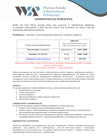 ADMINISTRACJA PUBLICZNA Studia dla tych, którzy pracują, bądź chcą pracować w administracji publicznej, w urzędach, samorządach, a także dla tych, którzy chcą dowiedzieć się więcej o tym jak funkcjonuje administracja publiczna. Wykładowcy – prawnicy, autorzy komentarzy prawnych, urzędnicy, praktycy OPŁATY Ceny w tabeli przedstawiają kwoty po Forma: studia podyplomowe odjęciu wszystkich promocji i zniżek. Czas trwania: 2 semestry jednorazowa 4600 / 4000 Kontakt: 796 308 468 II raty 2400 / 2100 [email protected] 10 rat 500/ 440 Dofinansowanie do studiów. Nawet do 100 % kosztów. Skorzystaj z dofinansowania studiów z Krajowego Funduszu Szkoleniowego. Więcej w zakładce „kandydaci -> studia podyplomowe Studia przeznaczone są dla przyszłych i obecnych pracowników organów administracji rządowej i samorządowej, państwowych i samorządowych jednostek organizacyjnych, dla których ta forma kształcenia stwarza możliwość podniesienia kwalifikacji zawodowych i uzyskania uprawnień wymaganych przez obowiązujące prawo. Studia adresowane są również do pracowników instytucji prywatnych zainteresowanych zasadami funkcjonowania współczesnej administracji. WIEDZA: W ramach specjalności student zdobędzie wiedzę z zakresu takich przedmiotów, jak: 1. Elementy prawa cywilnego 2. Prawo samorządowe 3. System podatkowy 4. Informacja publiczna i ochrona danych osobowych 5. Zamówienia publiczne UMIEJĘTNOŚCI i KOMPETENCJE: W ramach tej specjalności studenci zdobędą umiejętności i wiedzę dotyczącą: 1. Ustroju i zasad funkcjonowania administracji publicznej 2. Zakresu ustroju i zadań administracji rządowej centralnej i terenowej oraz samorządowej, prawa publicznego gospodarczego czy finansów publicznych, 3. W ramach ćwiczeń w pracowni komputerowej słuchacz zdobędzie kwalifikacje z zastosowań technologii informatycznych w administracji publicznej, czy techniki prawodawczej PERSPEKTYWY ZAWODOWE: Absolwent specjalności jest przygotowany do pracy urzędniczej w różnych rodzajach administracji publicznej – tak rządowej, jak i samorządowej – oraz do stosowania prawa w instytucjach niepublicznych, jest przygotowany do pełnienia kierowniczych funkcji w służbie cywilnej oraz samodzielnego wykonywania pracy w administracji. PROGRAM STUDIÓW L.p. PROGRAM STUDIÓW L. godz. ogółem Moduł I – Prawne regulacje działalności administracji publicznej 1. Wstęp do prawoznawstwa 6 2. Ustrój RP 6 3. Elementy prawa cywilnego 10 4. Prawo administracyjne 20 5. Postępowanie administracyjne 20 6. Prawo samorządowe 12 7. Prawo pracy i ubezpieczeń społecznych oraz elementy prawa urzędniczego 8 8. Zamówienia publiczne 10 9. Finanse publiczne 10 10. System podatkowy 4 11. Prawo gospodarcze 12 Moduł II – Organizacyjne i ekonomiczne aspekty działalności administracji publicznej 12. Organizacja i zarządzanie w administracji 12 13. Elementy statystyki w administracji publicznej 12 14. Informacja publiczna i ochrona danych osobowych 6 15. Praktyka kierowania urzędem 8 16. Informatyka w administracji 6 Razem E – egzamin, ZZO – zaliczenie z oceną; Z- zaliczenie Wszystkie opłaty za studia, w tym za egzaminy poprawkowe, powtarzanie roku i inne określa Regulamin Opłat WSAP. Program studiów może ulec zmianie. 162