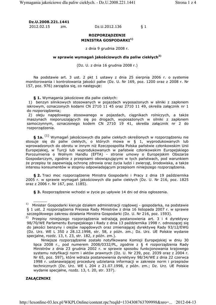 rozporzadzenie MG w sprawie wymagan jakosciowych dla paliw