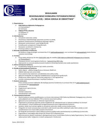 REGULAMIN REGIONALNEGO KONKURSU FOTOGRAFICZNEGO „TU SIĘ UCZĘ – MOJA SZKOŁA W OBIEKTYWIE” 1. Organizatorzy: CDN Publiczna Biblioteka Pedagogiczna ul. Przemysłowa 7 62-510 Konin Oddział PTTK w Koninie ul. Kolejowa 11 62-510 Konin 2. Cele konkursu: Utrwalenie wizerunku szkoły. Prezentacja indywidualnego spojrzenia uczniów na szkołę. Budzenie zainteresowań architekturą własnego regionu. Rozwijanie zainteresowań i pasji fotograficznej. Kształtowanie umiejętności fotograficznych. Rozwijanie wrażliwości artystycznej. Promocja szkoły w regionie. 3. Warunki uczestnictwa w konkursie: Do konkursu mogą przystąpić uczniowie klas IV-VI szkół podstawowych oraz uczniowie klas gimnazjalnych miasta Konina i powiatu konińskiego. 4. Terminy: Pracę należy dostarczyć do dnia 30.03.2015 roku do siedziby CDN Publicznej Biblioteki Pedagogicznej w Koninie. ul. Przemysłowa 7. Planowany termin rozstrzygnięcia konkursu - kwiecień/maj 2015 roku. Zaproszenie na uroczyste podsumowanie konkursu otrzymają laureaci oraz osoby wyróżnione. 5. Zakres tematyczny konkursu: Przedmiotem fotografii powinna być szkoła uczestnika. 6. Zasady przeprowadzania konkursu: Jedno zdjęcie - odbitka fotograficzna w formacie 20x30 cm. Odbitki kolorowe lub czarno-białe. Praca powinna być wykonana samodzielnie przez jedną osobę. Zgłaszane fotografie nie mogą być modyfikowane w programach graficznych. Każdą pracę należy opatrzyć metryczką (załącznik nr 1 do regulaminu). Laureaci zostaną poinformowani o wynikach konkursu. 7. Kryteria oceny prac: Prace zostaną ocenione oddzielnie dla każdego poziomu kształcenia (I-uczniowie klas IV-VI szkół podstawowych ; II-uczniowie klas gimnazjalnych). Pomysłowość. Oryginalność ujęcia tematu. Rzetelność. Estetyka wykonania. Samodzielność wykonania. 8. Postanowienia końcowe: Wyniki konkursu zostaną opublikowane na stronie internetowej CDN Publicznej Biblioteki Pedagogicznej w Koninie: www.pbpkonin.pl oraz Oddziału PTTK w Koninie www.konin.pttk.pl Zgłoszone prace przechodzą na własność organizatorów. Organizatorzy przejmują autorskie prawa majątkowe do nadesłanych prac w zakresie publikacji na stronach internetowych i innych publikacjach przygotowywanych przez Organizatorów Konkursu. Dyrektor szkoły musi wyrazić zgodę na utrwalenie wizerunku szkoły w pracy konkursowej. Fotografia nie może naruszać praw autorskich osób trzecich oraz dóbr osobistych osób, które zostały na nich przedstawione oraz innych dóbr prawnie chronionych. Do fotografii portretowych należy dołączyć pisemną zgodę osoby sportretowanej na publikację jej wizerunku. Organizatorzy zastrzegają sobie prawo do różnych form ekspozycji prac. Administratorem danych osobowych udostępnianych przez Uczestników Konkursu będą Organizatorzy. Dane te mogą być wykorzystane tylko i wyłącznie w celach zawiązanych z Konkursem. Konin, 2015-02-03
