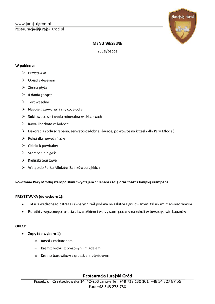 www.jurajskigrod.pl [email protected] MENU WESELNE 230zł/osoba W pakiecie: Przystawka Obiad z deserem Zimna płyta 4 dania gorące Tort weselny Napoje gazowane firmy coca-cola Soki owocowe i woda mineralna w dzbankach Kawa i herbata w bufecie Dekoracja stołu (draperia, serwetki ozdobne, świece, pokrowce na krzesła dla Pary Młodej) Pokój dla nowożeńców Chlebek powitalny Szampan dla gości Kieliszki toastowe Wstęp do Parku Miniatur Zamków Jurajskich Powitanie Pary Młodej staropolskim zwyczajem chlebem i solą oraz toast z lampką szampana. PRZYSTAWKA (do wyboru 1): Tatar z wędzonego pstrąga i świeżych ziół podany na sałatce z grillowanymi talarkami ziemniaczanymi Roladki z wędzonego łososia z twarożkiem i warzywami podany na rukoli w towarzystwie kaparów OBIAD Zupy (do wyboru 1): o Rosół z makaronem o Krem z brokuł z prażonymi migdałami o Krem z borowików z groszkiem ptysiowym Restauracja Jurajski Gród Piasek, ul. Częstochowska 14, 42-253 Janów Tel. +48 722 130 101, +48 34 327 87 56 Fax: +48 343 278 738 www.jurajskigrod.pl [email protected] Danie główne: o Patery mięs (rolada śląska, pieczeń cielęca, devolay, kaczka pieczona) o Ziemniaki gotowane z koperkiem o Kluski śląskie o Kapusta biała zasmażana o Buraczki o Surówka z czerwonej kapusty z jabłkiem o Surówka z marchewki i jabłka DESER (do wyboru 1): Lody waniliowe z musem z owoców leśnych i bitą śmietaną Lody z owocami i bitą śmietaną ZIMNA PŁYTA: Deski mięs pieczonych i wędlin: karczek pieczony, schab pieczony, rolada z boczku, pasztet domowy, wędliny tradycyjne Tymbalik drobiowy Schab po warszawsku w galarecie Rożki szynkowe z musem chrzanowym w galarecie Pstrąg w galarecie Śledź w oleju Śledź w śmietanie Ryba po grecku Deski serów Sałatka Floryda z szynką, serem i ananasem Sałatka jarzynowa Sałatka grecka Jaja faszerowane Pikle, marynaty Pieczywo, masło Restauracja Jurajski Gród Piasek, ul. Częstochowska 14, 42-253 Janów Tel. +48 722 130 101, +48 34 327 87 56 Fax: +48 343 278 738 www.jurajskigrod.pl [email protected] I DANIE GORĄCE (do wyboru 1): Medalion z polędwicy wieprzowej w sosie z borowików, ziemniaki piure, bukiet warzyw gotowanych Łosoś z rusztu z ryżem i warzywami gotowanymi Kieszonka drobiowa z mozarellą i suszonym pomidorem, ziemniaki opiekane, sałatka z kapusty pekińskiej II DANIE GORĄCE (do wyboru 1): Bogracz Jurajska zupa gulaszowa Strogonow III DANIE GORĄCE (do wyboru 1): Potrawka z kurczaka, z pieczarkami i warzywami podana na ryżu Gulasz zbójecki z grzybami leśnymi podany w chlebie IV DANIE GORĄCE (do wyboru 1): Barszczyk czerwony z krokietem Żurek śląski w chlebie Flaczki wołowe NAPOJE (bez ograniczeń): Napoje gazowane firmy coca-cola Bufet z kawą i herbatą Soki owocowe i woda mineralna w dzbankach CIASTO I OWOCE (na stołach lub w bufecie kawowym) 3-4 rodzaje ciasta Tort weselny (ok. 100g/osoba) na bazie biszkopta i bitej śmietany. Restauracja Jurajski Gród Piasek, ul. Częstochowska 14, 42-253 Janów Tel. +48 722 130 101, +48 34 327 87 56 Fax: +48 343 278 738 www.jurajskigrod.pl [email protected] DODATKOWA OFERTA: Stół wiejski- 25zł/osoba Ciasto na wynos dla gości- 17zł/sztuka Udziec staropolski z sosem chrzanowym, z ziemniakami podsmażanymi i ćwikłą serwowane przez Szefa Kuchni Jurajskiego Grodu- 30zł/osoba Barek alkoholowy- 500zł usługa barmańska + alkohol Fontanna czekoladowa- ok. 1000zł Alkohol- do uzgodnienia (może być we własnym zakresie, bez dodatkowych opłat) Dodatkowe atrakcje (np. pokaz rycerski, pokaz kuglarski, sztuczne ognie) do uzgodnienia Dzieci do lat 3- gratis Dzieci do lat 10- 30% zniżki Restauracja Jurajski Gród Piasek, ul. Częstochowska 14, 42-253 Janów Tel. +48 722 130 101, +48 34 327 87 56 Fax: +48 343 278 738