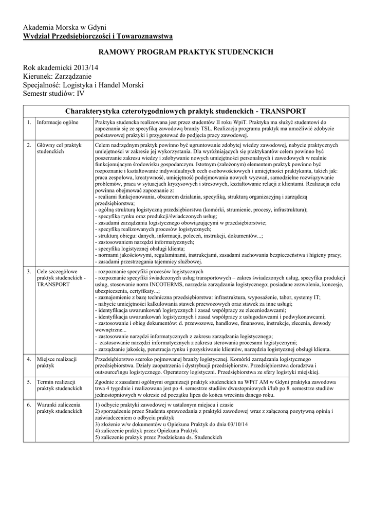 Akademia Morska w Gdyni Wydział Przedsiębiorczości i Towaroznawstwa RAMOWY PROGRAM PRAKTYK STUDENCKICH Rok akademicki 2013/14 Kierunek: Zarządzanie Specjalność: Logistyka i Handel Morski Semestr studiów: IV Charakterystyka czterotygodniowych praktyk studenckich - TRANSPORT 1. Informacje ogólne Praktyka studencka realizowana jest przez studentów II roku WpiT. Praktyka ma służyć studentowi do zapoznania się ze specyfiką zawodową branży TSL. Realizacja programu praktyk ma umożliwić zdobycie podstawowej praktyki i przygotować do podjęcia pracy zawodowej. 2. Główny cel praktyk studenckich Celem nadrzędnym praktyk powinno być ugruntowanie zdobytej wiedzy zawodowej, nabycie praktycznych umiejętności w zakresie jej wykorzystania. Dla wyróżniających się praktykantów celem powinno być poszerzanie zakresu wiedzy i zdobywanie nowych umiejętności personalnych i zawodowych w realnie funkcjonującym środowisku gospodarczym. Istotnym (założonym) elementem praktyk powinno być rozpoznanie i kształtowanie indywidualnych cech osobowościowych i umiejętności praktykanta, takich jak: praca zespołowa, kreatywność, umiejętność podejmowania nowych wyzwań, samodzielne rozwiązywanie problemów, praca w sytuacjach kryzysowych i stresowych, kształtowanie relacji z klientami. Realizacja celu powinna obejmować zapoznanie z: - realiami funkcjonowania, obszarem działania, specyfiką, strukturą organizacyjną i zarządczą przedsiębiorstwa; - ogólną strukturą logistyczną przedsiębiorstwa (komórki, strumienie, procesy, infrastruktura); - specyfiką rynku oraz produkcji/świadczonych usług; - zasadami zarządzania logistycznego obowiązującymi w przedsiębiorstwie; - specyfiką realizowanych procesów logistycznych; - strukturą obiegu: danych, informacji, poleceń, instrukcji, dokumentów...; - zastosowaniem narzędzi informatycznych; - specyfika logistycznej obsługi klienta; - normami jakościowymi, regulaminami, instrukcjami, zasadami zachowania bezpieczeństwa i higieny pracy; - zasadami przestrzegania tajemnicy służbowej. 3. Cele szczegółowe praktyk studenckich TRANSPORT - rozpoznanie specyfiki procesów logistycznych - rozpoznanie specyfiki świadczonych usług transportowych – zakres świadczonych usług, specyfika produkcji usług, stosowanie norm INCOTERMS, narzędzia zarządzania logistycznego; posiadane zezwolenia, koncesje, ubezpieczenia, certyfikaty...; - zaznajomienie z bazę techniczna przedsiębiorstwa: infrastruktura, wyposażenie, tabor, systemy IT; - nabycie umiejętności kalkulowania stawek przewozowych oraz stawek za inne usługi; - identyfikacja uwarunkowań logistycznych i zasad współpracy ze zleceniodawcami; - identyfikacja uwarunkowań logistycznych i zasad współpracy z usługodawcami i podwykonawcami; - zastosowanie i obieg dokumentów: d. przewozowe, handlowe, finansowe, instrukcje, zlecenia, dowody wewnętrzne... - zastosowanie narzędzi informatycznych z zakresu zarządzania logistycznego; - zastosowanie narzędzi informatycznych z zakresu sterowania procesami logistycznymi; - zarządzanie jakością, penetracja rynku i pozyskiwanie klientów, narzędzia logistycznej obsługi klienta. 4. Miejsce realizacji praktyk Przedsiębiorstwo szeroko pojmowanej branży logistycznej. Komórki zarządzania logistycznego przedsiębiorstwa. Działy zaopatrzenia i dystrybucji przedsiębiorstw. Przedsiębiorstwa doradztwa i outsource'ingu logistycznego. Operatorzy logistyczni. Przedsiębiorstwa ze sfery logistyki miejskiej. 5. Termin realizacji praktyk studenckich Zgodnie z zasadami ogólnymi organizacji praktyk studenckich na WPiT AM w Gdyni praktyka zawodowa trwa 4 tygodnie i realizowana jest po 4. semestrze studiów dwustopniowych i/lub po 8. semestrze studiów jednostopniowych w okresie od początku lipca do końca września danego roku. 6. Warunki zaliczenia praktyk studenckich 1) odbycie praktyki zawodowej w ustalonym miejscu i czasie 2) sporządzenie przez Studenta sprawozdania z praktyki zawodowej wraz z załączoną pozytywną opinią i zaświadczeniem o odbyciu praktyk 3) złożenie w/w dokumentów u Opiekuna Praktyk do dnia 03/10/14 4) zaliczenie praktyk przez Opiekuna Praktyk 5) zaliczenie praktyk przez Prodziekana ds. Studenckich