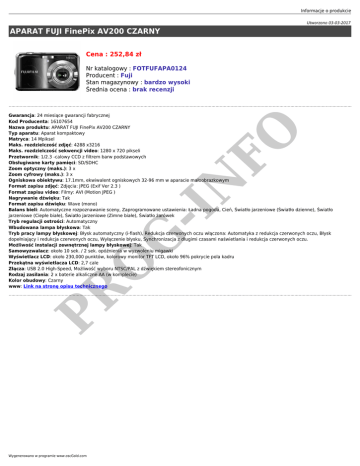 Informacje o produkcie Utworzono 03-03-2017 APARAT FUJI FinePix AV200 CZARNY Cena : 252,84 zł Nr katalogowy : FOTFUFAPA0124 Producent : Fuji Stan magazynowy : bardzo wysoki Średnia ocena : brak recenzji PR O G -I N FO Gwarancja: 24 miesiące gwarancji fabrycznej Kod Producenta: 16107654 Nazwa produktu: APARAT FUJI FinePix AV200 CZARNY Typ aparatu: Aparat kompaktowy Matryca: 14 Mpiksel Maks. rozdzielczość zdjęć: 4288 x3216 Maks. rozdzielczość sekwencji video: 1280 x 720 pikseli Przetwornik: 1/2.3 -calowy CCD z filtrem barw podstawowych Obsługiwane karty pamięci: SD/SDHC Zoom optyczny (maks.): 3 x Zoom cyfrowy (maks.): 3 x Ogniskowa obiektywu: 17.1mm, ekwiwalent ogniskowych 32-96 mm w aparacie małoobrazkowym Format zapisu zdjęć: Zdjęcia: JPEG (Exif Ver 2.3 ) Format zapisu video: Filmy: AVI (Motion JPEG ) Nagrywanie dźwięku: Tak Format zapisu dźwięku: Wave (mono) Balans bieli: Automatyczne rozpoznawanie sceny, Zaprogramowane ustawienia: Ładna pogoda, Cień, Światło jarzeniowe (Światło dzienne), Światło jarzeniowe (Ciepłe białe), Światło jarzeniowe (Zimne białe), Światło żarówek Tryb regulacji ostrości: Automatyczny Wbudowana lampa błyskowa: Tak Tryb pracy lampy błyskowej: Błysk automatyczny (i-flash), Redukcja czerwonych oczu włączona: Automatyka z redukcja czerwonych oczu, Błysk dopełniający i redukcja czerwonych oczu, Wyłączenie błysku, Synchronizacja z długimi czasami naświetlania i redukcja czerwonych oczu. Możliwość instalacji zewnętrznej lampy błyskowej: Tak Samowyzwalacz: około 10 sek. / 2 sek. opóźnienia w wyzwoleniu migawki Wyświetlacz LCD: około 230,000 punktów, kolorowy monitor TFT LCD, około 96% pokrycie pola kadru Przekątna wyświetlacza LCD: 2,7 cale Złącza: USB 2.0 High-Speed, Możliwość wyboru NTSC/PAL z dźwiękiem stereofonicznym Rodzaj zasilania: 2 x baterie alkaliczne AA (w komplecie) Kolor obudowy: Czarny www: Link na stronę opisu technicznego Wygenerowano w programie www.oscGold.com