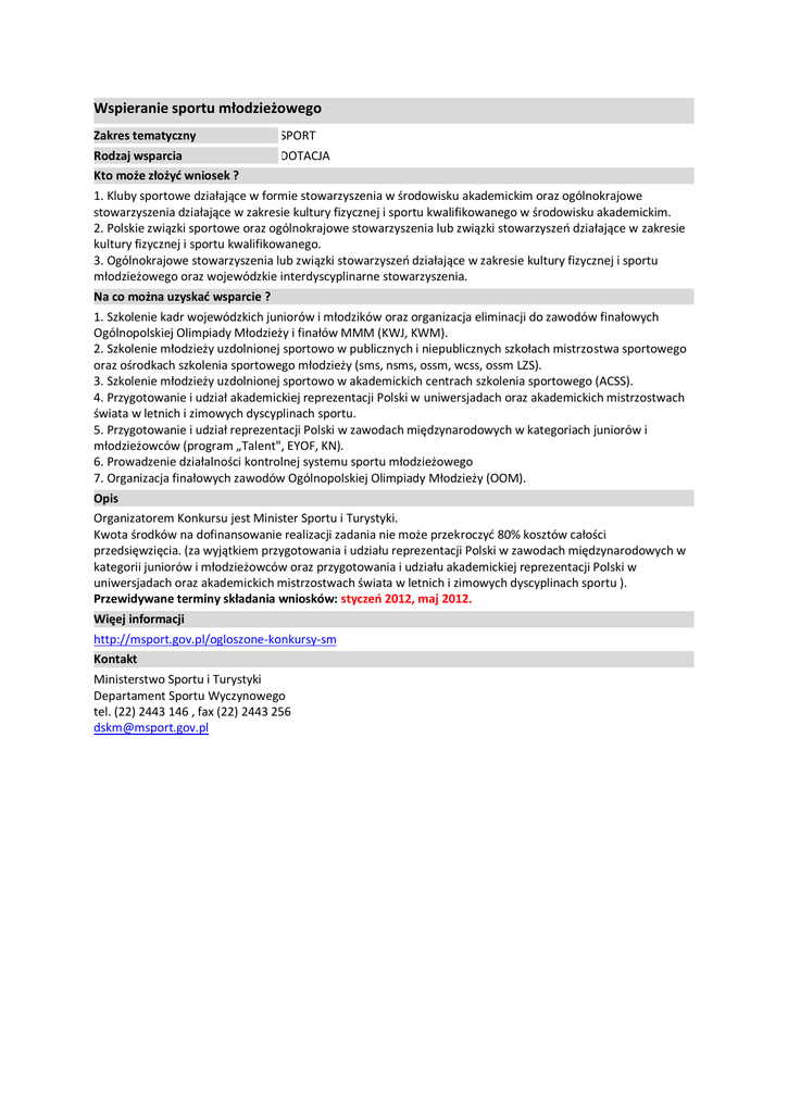 Wspieranie sportu młodzieżowego Zakres tematyczny Rodzaj wsparcia SPORT DOTACJA Kto może złożyć wniosek ? 1. Kluby sportowe działające w formie stowarzyszenia w środowisku akademickim oraz ogólnokrajowe stowarzyszenia działające w zakresie kultury fizycznej i sportu kwalifikowanego w środowisku akademickim. 2. Polskie związki sportowe oraz ogólnokrajowe stowarzyszenia lub związki stowarzyszeo działające w zakresie kultury fizycznej i sportu kwalifikowanego. 3. Ogólnokrajowe stowarzyszenia lub związki stowarzyszeo działające w zakresie kultury fizycznej i sportu młodzieżowego oraz wojewódzkie interdyscyplinarne stowarzyszenia. Na co można uzyskać wsparcie ? 1. Szkolenie kadr wojewódzkich juniorów i młodzików oraz organizacja eliminacji do zawodów finałowych Ogólnopolskiej Olimpiady Młodzieży i finałów MMM (KWJ, KWM). 2. Szkolenie młodzieży uzdolnionej sportowo w publicznych i niepublicznych szkołach mistrzostwa sportowego oraz ośrodkach szkolenia sportowego młodzieży (sms, nsms, ossm, wcss, ossm LZS). 3. Szkolenie młodzieży uzdolnionej sportowo w akademickich centrach szkolenia sportowego (ACSS). 4. Przygotowanie i udział akademickiej reprezentacji Polski w uniwersjadach oraz akademickich mistrzostwach świata w letnich i zimowych dyscyplinach sportu. 5. Przygotowanie i udział reprezentacji Polski w zawodach międzynarodowych w kategoriach juniorów i młodzieżowców (program „Talent", EYOF, KN). 6. Prowadzenie działalności kontrolnej systemu sportu młodzieżowego 7. Organizacja finałowych zawodów Ogólnopolskiej Olimpiady Młodzieży (OOM). Opis Organizatorem Konkursu jest Minister Sportu i Turystyki. Kwota środków na dofinansowanie realizacji zadania nie może przekroczyd 80% kosztów całości przedsięwzięcia. (za wyjątkiem przygotowania i udziału reprezentacji Polski w zawodach międzynarodowych w kategorii juniorów i młodzieżowców oraz przygotowania i udziału akademickiej reprezentacji Polski w uniwersjadach oraz akademickich mistrzostwach świata w letnich i zimowych dyscyplinach sportu ). Przewidywane terminy składania wniosków: styczeo 2012, maj 2012. Więej informacji http://msport.gov.pl/ogloszone-konkursy-sm Kontakt Ministerstwo Sportu i Turystyki Departament Sportu Wyczynowego tel. (22) 2443 146 , fax (22) 2443 256 [email protected]
