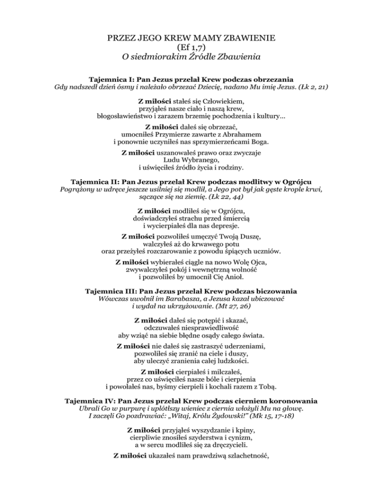 PRZEZ JEGO KREW MAMY ZBAWIENIE (Ef 1,7) O siedmiorakim Źródle Zbawienia Tajemnica I: Pan Jezus przelał Krew podczas obrzezania Gdy nadszedł dzień ósmy i należało obrzezać Dziecię, nadano Mu imię Jezus. (Łk 2, 21) Z miłości stałeś się Człowiekiem, przyjąłeś nasze ciało i naszą krew, błogosławieństwo i zarazem brzemię pochodzenia i kultury... Z miłości dałeś się obrzezać, umocniłeś Przymierze zawarte z Abrahamem i ponownie uczyniłeś nas sprzymierzeńcami Boga. Z miłości uszanowałeś prawo oraz zwyczaje Ludu Wybranego, i uświęciłeś źródło życia i rodziny. Tajemnica II: Pan Jezus przelał Krew podczas modlitwy w Ogrójcu Pogrążony w udręce jeszcze usilniej się modlił, a Jego pot był jak gęste krople krwi, sączące się na ziemię. (Łk 22, 44) Z miłości modliłeś się w Ogrójcu, doświadczyłeś strachu przed śmiercią i wycierpiałeś dla nas depresje. Z miłości pozwoliłeś umęczyć Twoją Duszę, walczyłeś aż do krwawego potu oraz przeżyłeś rozczarowanie z powodu śpiących uczniów. Z miłości wybierałeś ciągle na nowo Wolę Ojca, 2wywalczyłeś pokój i wewnętrzną wolność i pozwoliłeś by umocnił Cię Anioł. Tajemnica III: Pan Jezus przelał Krew podczas biczowania Wówczas uwolnił im Barabasza, a Jezusa kazał ubiczować i wydał na ukrzyżowanie. (Mt 27, 26) Z miłości dałeś się potępić i skazać, odczuwałeś niesprawiedliwość aby wziąć na siebie błędne osądy całego świata. Z miłości nie dałeś się zastraszyć uderzeniami, pozwoliłeś się zranić na ciele i duszy, aby uleczyć zranienia całej ludzkości. Z miłości cierpiałeś i milczałeś, przez co uświęciłeś nasze bóle i cierpienia i powołałeś nas, byśmy cierpieli i kochali razem z Tobą. Tajemnica IV: Pan Jezus przelał Krew podczas cierniem koronowania Ubrali Go w purpurę i uplótłszy wieniec z ciernia włożyli Mu na głowę. I zaczęli Go pozdrawiać: „Witaj, Królu Żydowski!” (Mk 15, 17-18) Z miłości przyjąłeś wyszydzanie i kpiny, cierpliwie znosiłeś szyderstwa i cynizm, a w sercu modliłeś się za dręczycieli. Z miłości ukazałeś nam prawdziwą szlachetność, miłosierdzie wielkodusznego serca, królewskość Twojego Panowania. Z miłości zachowałeś pokój, Twoim milczeniem pokonałeś pychę i pokazałeś, czym jest prawdziwa wielkość. Tajemnica V: Pan Jezus przelał Krew na Drodze Krzyżowej A On sam dźwigając krzyż wszedł na miejsce zwane Miejscem Czaszki, które po hebrajsku nazywa się Golgota. (J 19, 17) Z miłości dźwigałeś Krzyż, upadałeś pod jego zbyt wielkim ciężarem i naznaczyłeś Krwią drogę na Golgotę. Z miłości dałeś się pocieszać, podarowałeś Weronice Twój obraz „namalowany” krwią i potem, abyśmy Twoje Oblicze nosili w sercu. Z miłości pozwoliłeś się odrzeć z szat, zniosłeś poniżenie i upokarzanie, ażeby zadośćuczynić za nasz bezwstyd. Tajemnica VI: Pan Jezus przelał Krew przy ukrzyżowaniu Lecz Jezus mówił: „Ojcze, przebacz im, bo nie wiedzą, co czynią”. (Łk 23, 33-34) Z miłości dałeś się przybić do Krzyża, myślałeś bardziej o nas niż o Swoim bólu i dałeś nam wzór prawdziwej wolności. Z miłości modliłeś się za Twoich dręczycieli, troszczyłeś się o zbawienie ich dusz, o ratunek dla nas wszystkich. Z miłości „przelałeś” Twoje życie, wykrwawiony zanurzyłeś się w najgłębszą ciemność i przez zaufanie i oddanie wywalczyłeś zwycięstwo. Tajemnica VII: Pan Jezus przelał Krew i wodę przy otwarciu boku włócznią Lecz gdy podeszli do Jezusa i zobaczyli, że już umarł, nie łamali Mu goleni, tylko jeden z żołnierzy włócznią przebił Mu bok i natychmiast wypłynęła krew i woda. (J 19, 33-34) Z miłości dałeś przebić swoje Serce, otwarłeś je szeroko dla nas ludzi, ażeby wszyscy mogli znaleźć drogę do Serca Ojca. Z miłości założyłeś Kościół, podarowałeś nam sakramenty, żywisz nas Twoim Ciałem, Twoją Krwią, Twoją Miłością. Z miłości pozwalasz nam żyć przy Źródle Zbawienia, byśmy uczestniczyli w Twoim Miłosierdziu i mogli razem z Tobą przelewać naszą krew. Amen. (wi 09.01.09)