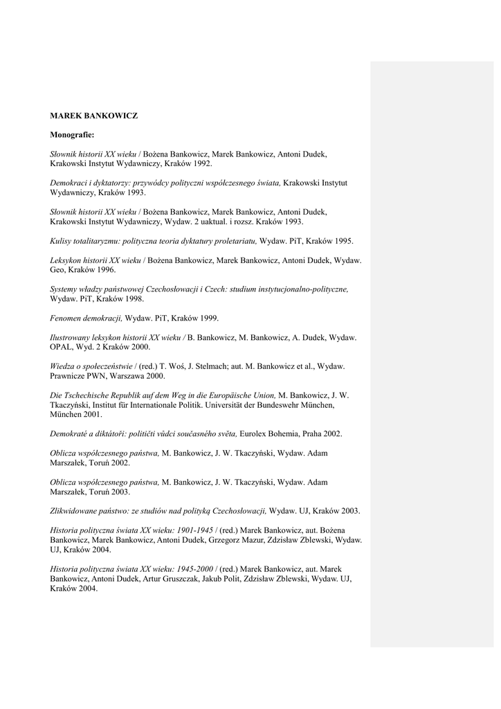 MAREK BANKOWICZ Monografie: Słownik historii XX wieku / Bożena Bankowicz, Marek Bankowicz, Antoni Dudek, Krakowski Instytut Wydawniczy, Kraków 1992. Demokraci i dyktatorzy: przywódcy polityczni współczesnego świata, Krakowski Instytut Wydawniczy, Kraków 1993. Słownik historii XX wieku / Bożena Bankowicz, Marek Bankowicz, Antoni Dudek, Krakowski Instytut Wydawniczy, Wydaw. 2 uaktual. i rozsz. Kraków 1993. Kulisy totalitaryzmu: polityczna teoria dyktatury proletariatu, Wydaw. PiT, Kraków 1995. Leksykon historii XX wieku / Bożena Bankowicz, Marek Bankowicz, Antoni Dudek, Wydaw. Geo, Kraków 1996. Systemy władzy państwowej Czechosłowacji i Czech: studium instytucjonalno-polityczne, Wydaw. PiT, Kraków 1998. Fenomen demokracji, Wydaw. PiT, Kraków 1999. Ilustrowany leksykon historii XX wieku / B. Bankowicz, M. Bankowicz, A. Dudek, Wydaw. OPAL, Wyd. 2 Kraków 2000. Wiedza o społeczeństwie / (red.) T. Woś, J. Stelmach; aut. M. Bankowicz et al., Wydaw. Prawnicze PWN, Warszawa 2000. Die Tschechische Republik auf dem Weg in die Europäische Union, M. Bankowicz, J. W. Tkaczyński, Institut für Internationale Politik. Universität der Bundeswehr München, München 2001. Demokraté a diktátoři: političti vůdci současného svĕta, Eurolex Bohemia, Praha 2002. Oblicza współczesnego państwa, M. Bankowicz, J. W. Tkaczyński, Wydaw. Adam Marszałek, Toruń 2002. Oblicza współczesnego państwa, M. Bankowicz, J. W. Tkaczyński, Wydaw. Adam Marszałek, Toruń 2003. Zlikwidowane państwo: ze studiów nad polityką Czechosłowacji, Wydaw. UJ, Kraków 2003. Historia polityczna świata XX wieku: 1901-1945 / (red.) Marek Bankowicz, aut. Bożena Bankowicz, Marek Bankowicz, Antoni Dudek, Grzegorz Mazur, Zdzisław Zblewski, Wydaw. UJ, Kraków 2004. Historia polityczna świata XX wieku: 1945-2000 / (red.) Marek Bankowicz, aut. Marek Bankowicz, Antoni Dudek, Artur Gruszczak, Jakub Polit, Zdzisław Zblewski, Wydaw. UJ, Kraków 2004. System polityczny Singapuru: ewolucja historyczna i teraźniejszość, Wydaw. UJ, Kraków 2005. Demokracja. Zasady, procedury, instytucje, Wydaw. UJ, Kraków 2006. Słownik historii politycznej świata 1901-2005 / Bożena Bankowicz, Marek Bankowicz, Antoni Dudek, Wydaw. UJ, Kraków 2006. Dyktatury i tyranie: szkice o niedemokratycznej władzy / Marek Bankowicz, Wiesław KozubCiembroniewicz, Wydaw. UJ, Kraków 2007. Przywódcy polityczni współczesnego świata: mężowie stanu, demokraci i tyrani, Wydaw. UJ, Kraków 2007, s. 397. Dzieje powszechne ilustrowane, Tom I, Lata 1900-1929 / Marek Bankowicz, Bożena Bankowicz, Antoni Dudek, Wydaw. com Sp Oxford Educational, Słupsk 2009. Dzieje powszechne ilustrowane, Tom II, Lata 1929-1945 / Marek Bankowicz, Bożena Bankowicz, Grzegorz Mazur, Zdzisław Zblewski, Wydaw. com Sp Oxford Educational, Słupsk 2009. Dzieje powszechne ilustrowane, Tom III, Lata 1945-1963 / Marek Bankowicz, Jakub Polit, Wydaw. com Sp Oxford Educational, Słupsk 2009. Dzieje powszechne ilustrowane, Tom IV, Lata 1963-1985 / Marek Bankowicz, Bożena Bankowicz, Antoni Dudek, Wydaw. com Sp Oxford Educational, Słupsk 2009. Dzieje powszechne ilustrowane, Tom V, Lata 1986-1998 / Marek Bankowicz, Artur Gruszczak, Wydaw. com Sp Oxford Educational, Słupsk 2009. Zamach stanu: studium teoretyczne, Wydaw. UJ, Kraków 2009. Státní převrat, Dokořán, Praha 2010. Transformacje konstytucyjnych systemów władzy państwowej w Europie Środkowej, Wydaw. UJ, Kraków 2010. Niedemokratyzmy / M. Bankowicz, Wydaw. UJ, Kraków 2011. Redakcje naukowe: „ W stronę nowego partnerstwa”: polsko-rosyjska konferencja, Kraków, 23-25 lutego 1994, [red. M. Bankowicz, L. Parczewska, D. Styrna], Wydaw. Oficyna Cracovia, Kraków 1993. Słownik polityki, Wiedza Powszechna, Warszawa 1996. Słownik polityki, Wyd. 2, Wiedza Powszechna, Warszawa 1997. Słownik polityki, Wyd. 3 nowe, Wiedza Powszechna, Warszawa 1999. Europa 25: opinia środowiska akademickiego Krakowa na temat politycznych wyzwań poszerzonej Unii Europejskiej / (red.) M. Bankowicz, K. Szczerski, SWBJ Wydział Zamiejscowy, Kraków 2004. Historia polityczna świata XX wieku: 1901-1945, Wydaw. UJ, Kraków 2004. Historia polityczna świata XX wieku: 1945-2000, Wydaw. UJ, Kraków 2004. Rozdziały w pracach zbiorowych: Ostatnie cesarstwo: system polityczny Japonii [w:] Ciągłość a zmiana w ewolucji systemów politycznych / (red.) M. Grzybowski, Krakowska Oficyna Wydawnicza, Kraków 1991, s. 166198. System partyjny Republiki Włoskiej [w:] Współczesne systemy partyjne wybranych państw europejskich / (red.) M. Grzybowski, A. Zięba, Wydaw. UJ, Kraków 1996, s. 147-205. Ewolucja systemu politycznego III Rzeczypospolitej [w:] Od komunizmu do…?: dokąd zmierza III Rzeczpospolita? / (red.) J. Kloczkowskiego, Ośrodek Myśli Politycznej; Księgarnia Akademicka, Kraków 1999, s. 59-80. Opozycja polityczna w systemie partii dominującej [w:] Opozycja w systemach demokratycznych i niedemokratycznych / (red.) K. Łabędź, M. Mikołajczyk, Wydaw. INS Akademii Pedagogicznej, Kraków 2001, s. 179-186. Ústava v demokracii [w:] Zákon v kontinentálnim právu, / (red.) A. Gerloch, P. Maršálek, Eurolex Bohemia, Praha 2005. Politiczeskije partie i partijnyje sistemy, [w:] Obszcziestwoznanie w szkole. Posobie dla uczitiela / (red.) B. Tabacznikow, Woroneż 2006. Krize demokracie w postmoderni dobe [w:] Chaos a rad ve spolecnosti a v sociologii. Sbornik textu k zivotnimu jubileu prof. Miloslava Petruska / (ed.) J. Balon, M. Tucek, Praha 2006, s. 33-39. System polityczny Izraela: parlamentaryzm, proporcjonalność, wielopartyjność [w:] Ustroje, doktryny, instytucje polityczne: księga jubileuszowa Profesora zw. dra hab. Mariana Grzybowskiego, Wydaw. UJ, Kraków 2007, s. 49-59. Włoska tożsamość narodowa a kontekst europejski [w:] Niemcy, Europa, Świat: studia międzynarodowe: księga pamiątkowa poświęcona Profesorowi Erhardowi Cziomerowi / (red.) I. Stawowy-Kawka, Wydaw. UJ, Kraków 2007, s. 235-242. Muammar Kaddaf