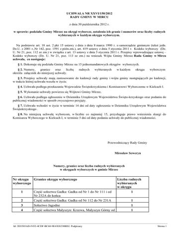 UCHWAŁA NR XXVI/150/2012 RADY GMINY W MIRCU z dnia 30 października 2012 r. w sprawie: podziału Gminy Mirzec na okręgi wyborcze, ustalenia ich granic i numerów oraz liczby radnych wybieranych w każdym okręgu wyborczym. Na podstawie art. 18 ust. 2 pkt 15 ustawy z dnia z dnia 8 marca 1990 r. o samorządzie gminnym (tekst jedn. Dz.U. z 2001 r.,Nr 142, poz. 1591 z późn.zm.), art. 419 ustawy z dnia 5 stycznia 2011 r. Kodeks wyborczy (Dz. U. Nr 21, poz. 112 ze zm.) w związku z art. 13 ustawy z dnia 5 stycznia 2011 r. Przepisy wprowadzające ustawę – Kodeks wyborczy (Dz. U. Nr 21, poz. 113 ze zm.) na wniosek Wójta Gminy Mirzec Rada Gminy w Mircu uchwala, co następuje: § 1. Dokonuje się podziału Gminy Mirzec na 15 jednomandatowych okręgów wyborczych. § 2. Numery, granice oraz liczbę określa załącznik do niniejszej uchwały. radnych wybieranych w każdym okręgu wyborczym § 3. Przepisy uchwały mają zastosowanie do kadencji rady gminy i wójta gminy następujących po kadencji, w trakcie której uchwała weszła w życie. § 4. Uchwała podlega przekazaniu Wojewodzie Świętokrzyskiemu i Komisarzowi Wyborczemu w Kielcach I. § 5. Wykonanie uchwały powierza się Wójtowi Gminy Mirzec. § 6. Uchwała podlega ogłoszeniu w Dzienniku Urzędowym Województwa Święto-krzyskiego oraz podaniu do publicznej wiadomości w sposób zwyczajowo przyjęty. § 7. Uchwała wchodzi w życie w terminie 14 dni od daty ogłoszenia w Dzienniku Urzędowym Województwa Świętokrzyskiego . § 8. Na niniejszą uchwałę wyborcom, w liczbie co najmniej 15, przysługuje prawo wniesienia skargi do Komisarza Wyborczego w Kielcach I, w terminie 5 dni od daty podania uchwały do publicznej wiadomości. Przewodniczący Rady Gminy Mirosław Seweryn Numery, granice oraz liczba radnych wybieranych w okręgach wyborczych w gminie Mirzec Nr okręgu Granice okręgu wyborczego wyborczego 1 2 3 4 Część sołectwa Gadka: Gadka od Nr 1 do Nr 111 i od Nr 232A do końca Część sołectwa Gadka: Gadka od Nr 112 do Nr 231A Sołectwo Jagodne Część sołectwa Małyszyn: Krzewa, Małyszyn Górny od Liczba radnych wybieranych w okręgu 1 1 1 1 ————————————————————————————————————————————————————————— Id: 2D3585AD-F452-4CDF-BC60-9E43E8238BD2. Podpisany Strona 1 5 6 7 8 9 10 11 12 13 14 15 Nr 1 do Nr 86 Część sołectwa Małyszyn: Małyszyn Dolny, Małyszyn Górny od Nr 87 do końca Część sołectwa Mirzec I: Mirzec – Malcówki, Mirzec – Majorat Część sołectwa Mirzec I: Mirzec – Poddąbrowa, Mirzec ul. Langiewicza Część sołectwa Mirzec II: Mirzec – Podborki, MirzecCzerwona, Mirzec u. Modrzewiowa, MirzecPodkowalów Część sołectwa Mirzec II: Mirzec Stary, Mirzec – Poduchowne, Mirzec – Korzonek, Mirzec – Ogrody, Mirzec ul.Prendowskiej Część sołectwa Osiny: Osiny Majorat, Osiny od Nr 1 do Nr 75A Część sołectwa Osiny: Osiny - Mokra Niwa, Osiny od Nr 76 do końca Sołectwo Trębowiec Sołectwo Tychów Nowy Sołectwo Tychów Stary Sołectwo Ostrożanka 1 1 1 1 1 1 1 1 1 1 1 ————————————————————————————————————————————————————————— Id: 2D3585AD-F452-4CDF-BC60-9E43E8238BD2. Podpisany Strona 2 Uzasadnienie Zgodnie z przepisem art. 419 § 2 ustawy z dnia 5 stycznia 2011 r. - Kodeks wyborczy (Dz. U. Nr 21, poz. 112 ze zm.) podział na okręgi wyborcze, ich granice i numery oraz liczbę radnych wybieranych w każdym okręgu ustala, na wniosek wójta, rada gminy. Projekt podziału gminy Mirzec na okręgi wyborcze opracowany został zgodnie z zasadami zawartymi w/w ustawie a obowiązek jego opracowania wynika wprost z treści art. 13 ust. 1 ustawy z dnia 5 stycznia 2011 r. - Przepisy wprowadzające ustawę – Kodeks wyborczy (Dz. U. Nr 21, poz. 113 ze zm.). Porównując przygotowany projekt podziału gminy Mirzec na okręgi wyborcze z dotychczas obowiązującym wprowadzone zmiany dotyczą okręgów wyborczych Nr 1, 3, 4, 5, 6 i 9 , które dotychczas były okręgami dumandatowymi). Zgodnie z brzmieniem art. 418 § 1 Kodeksu wyborczego w każdym okręgu wyborczym tworzonym dla wyboru rady w gminie niebędącej miastem na prawach powiatu wybiera się 1 radnego. Z uwagi na dyspozycje w/w przepisu należy dokonać podziału sześciu dwumandatowych okręgów wyborczych i przekształcić je w dwanaście okręgów jednomandatowych. Proponowanego podziału gminy na okręgi wyborcze dokonano przy zachowaniu jednolitej normy przedstawicielstwa obliczonej przez podzielenie liczby mieszkańców gminy przez liczbę radnych wybieranych do Rady Gminy w Mircu. Liczbą mieszkańców braną pod uwagę przy przygotowywaniu projektu nowego podziału gminy na okręgi wyborcze była suma wyborców ujętych w rejestrze wyborców z urzędu, wyborców wpisanych do rejestru wyborców na wniosek oraz pozostałych osób zameldowanych w gminie na pobyt stały, za wyjątkiem osób, co do których otrzymano zawiadomienie o wpisaniu do rejestru wyborców w innej gminie. Na dzień 30 września 2012 roku liczba mieszkańców w gminie Mirzec ustalona wg powyższych zasad wynosiła 8522 osób. Otrzymana liczba przedstawicielstwa wynosi: 8522 : 15 = 568,13. Projekt podziału gminy Mirzec na okręgi wyborcze obrazuje tabela stanowiąca załącznik do projektu Uchwały Rady Gminy w Mircu. ————————————————————————————————————————————————————————— Id: 2D3585AD-F452-4CDF-BC60-9E43E8238BD2. Podpisany Strona 1