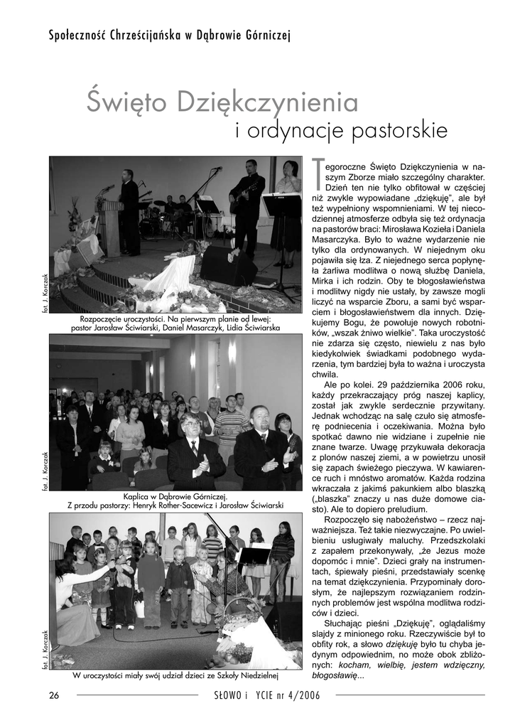 Społeczność Chrześcijańska w Dąbrowie Górniczej Święto Dziękczynienia i ordynacje pastorskie fot. J. Korczak T fot. J. Korczak Rozpoczęcie uroczystości. Na pierwszym planie od lewej: pastor Jarosław Ściwiarski, Daniel Masarczyk, Lidia Ściwiarska fot. J. Korczak Kaplica w Dąbrowie Górniczej. Z przodu pastorzy: Henryk Rother-Sacewicz i Jarosław Ściwiarski W uroczystości miały swój udział dzieci ze Szkoły Niedzielnej 26 egoroczne Święto Dziękczynienia w na szym Zborze miało szczególny charakter. Dzień ten nie tylko obfitował w częściej niż zwykle wypowiadane „dziękuję”, ale był też wypełniony wspomnieniami. W tej nieco dziennej atmosferze odbyła się też ordynacja na pastorów braci: Mirosława Kozieła i Daniela Masarczyka. Było to ważne wydarzenie nie tylko dla ordynowanych. W niejednym oku pojawiła się łza. Z niejednego serca popłynę ła żarliwa modlitwa o nową służbę Daniela, Mirka i ich rodzin. Oby te błogosławieństwa i modlitwy nigdy nie ustały, by zawsze mogli liczyć na wsparcie Zboru, a sami być wspar ciem i błogosławieństwem dla innych. Dzię kujemy Bogu, że powołuje nowych robotni ków, „wszak żniwo wielkie”. Taka uroczystość nie zdarza się często, niewielu z nas było kiedykolwiek świadkami podobnego wyda rzenia, tym bardziej była to ważna i uroczysta chwila. Ale po kolei. 29 października 2006 roku, każdy przekraczający próg naszej kaplicy, został jak zwykle serdecznie przywitany. Jednak wchodząc na salę czuło się atmosfe rę podniecenia i oczekiwania. Można było spotkać dawno nie widziane i zupełnie nie znane twarze. Uwagę przykuwała dekoracja z plonów naszej ziemi, a w powietrzu unosił się zapach świeżego pieczywa. W kawiaren ce ruch i mnóstwo aromatów. Każda rodzina wkraczała z jakimś pakunkiem albo blaszką („blaszka” znaczy u nas duże domowe cia sto). Ale to dopiero preludium. Rozpoczęło się nabożeństwo – rzecz naj ważniejsza. Też takie niezwyczajne. Po uwiel bieniu usługiwały maluchy. Przedszkolaki z zapałem przekonywały, „że Jezus może dopomóc i mnie”. Dzieci grały na instrumen tach, śpiewały pieśni, przedstawiały scenkę na temat dziękczynienia. Przypominały doro słym, że najlepszym rozwiązaniem rodzin nych problemów jest wspólna modlitwa rodzi ców i dzieci. Słuchając pieśni „Dziękuję”, oglądaliśmy slajdy z minionego roku. Rzeczywiście był to obfity rok, a słowo dziękuję było tu chyba je dynym odpowiednim, no może obok zbliżo nych: kocham, wielbię, jestem wdzięczny, błogosławię... S£OWO i ¯ YCIE nr 4/2006 Społeczność Chrześcijańska w Dąbrowie Górniczej fot. J. Korczak Głównym mówcą był pastor Henryk RotherSacewicz. Każdy z nas podpisałby się pod jego słowami: „Jesteśmy tutaj po to, by prosić Niebiań skiego Ojca, by Duch Święty prowadził br. Miro sława i br. Daniela w po wierzonej im służbie... Chciałbym, byście to szczególnie zapamiętali: Oni, a też i wcześniej ordynowany br. Jarosław, mają być zawsze w Wa szych modlitwach”. Akt ordynacji był bar dzo wzruszający. Odczy tano fragment Pisma Świętego oraz tekst ordy Ordynacja na pastorów braci: Daniela Masarczyka (4. od lewej) i Mirka Kozieła (3. od prawej) nacji. Bracia złożyli ślubo wanie po czym miała miejsce modlitwa z nałożeniem rąk pa storów: Jarosława Ściwiarskiego, Henryka Rothera-Sacewicza i Dana Hasha oraz braci z Rady Starszych naszego Zboru. Dopełnieniem uroczystości były dyplomy, życzenia i kwiaty. Ordynowani otrzymali je wraz z błogosławieństwem całego Kościoła. Uhonorowany został również br. Henryk RotherSacewicz za wkład wniesiony w podwaliny naszego Zboru (był pastorem naszego zboru w latach 1967-1994 ) oraz z okazji 65-lecia Zboru w Sosnowcu (gdzie aktualnie jest pastorem przełożonym). Brat Henryk w swoim kazaniu podkreślał, żeby śmy modlili się o naszych pastorów, nieco więc przewrotnym wydawał się prezent, jaki od nas otrzymał. Było to symboliczne drzewko genealogiczne, którego początkiem jest właśnie pa stor Henryk, potem pastor Jarosław i nowoordynowani: Daniel i Mirosław. Pozostało sporo wolnych miejsc. Stąd prezent- Modlitwa pastorów i Rady Starszych nad ordynowanymi prośba do pastora Henryka, by nie ustawał w modlitwach o tych, których zdjęcia są już tam umieszczone, i tych, którzy tam jeszcze nie ma. Na koniec pastorzy modlili się nie tylko o nasz Zbór, nie tylko o Dąbrowę Górniczą, ale o całą ziemię zagłębiowską. A po skończonym nabożeństwie nikt nie śpieszył się do domu. Wiele czasu spędziliśmy przy suto zastawionych stołach i na rozmowach. Życząc nowo powołanym pastorom, wszelkiego Bożego błogosławieństwa oczekujemy na owoce naszej wspólnej pracy. ANNA OLSZEWSKA ul. Łukasińskiego 7 41-300 Dąbrowa Górnicza tel. 0-32 262 27 66 www.spolecznosc.org.pl Nabożeństwa: niedziela 10.00, środa 18.00 fot. J. Korczak Społeczność Chrześcijańska S£OWO i ¯ YCIE nr 4/2006 Dopełnieniem uroczystości były dyplomy, życzenia i kwiaty 27