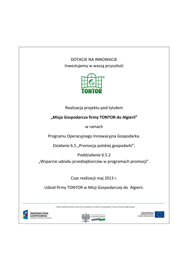 DOTACJE NA INNOWACJE Inwestujemy w waszą przyszłość Realizacja projektu pod tytułem „Misja Gospodarcza firmy TONTOR do Algierii” w ramach Programu Operacyjnego Innowacyjna Gospodarka. Działanie 6.5 „Promocja polskiej gospodarki”, Poddziałanie 6.5.2 „Wsparcie udziału przedsiębiorców w programach promocji”. Czas realizacji maj 2013 r. Udział firmy TONTOR w Misji Gospodarczej do Algierii.