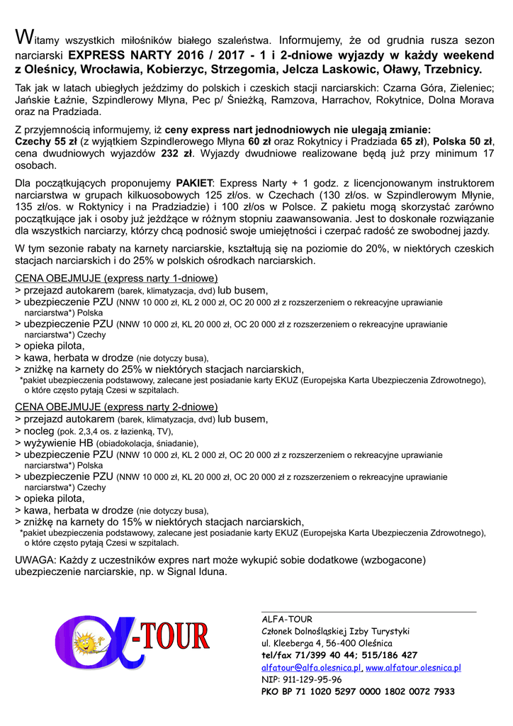 Witamy wszystkich miłośników białego szaleństwa. Informujemy, że od grudnia rusza sezon narciarski EXPRESS NARTY 2016 / 2017 - 1 i 2-dniowe wyjazdy w każdy weekend z Oleśnicy, Wrocławia, Kobierzyc, Strzegomia, Jelcza Laskowic, Oławy, Trzebnicy. Tak jak w latach ubiegłych jeździmy do polskich i czeskich stacji narciarskich: Czarna Góra, Zieleniec; Jańskie Łaźnie, Szpindlerowy Młyna, Pec p/ Śnieżką, Ramzova, Harrachov, Rokytnice, Dolna Morava oraz na Pradziada. Z przyjemnością informujemy, iż ceny express nart jednodniowych nie ulegają zmianie: Czechy 55 zł (z wyjątkiem Szpindlerowego Młyna 60 zł oraz Rokytnicy i Pradziada 65 zł), Polska 50 zł, cena dwudniowych wyjazdów 232 zł. Wyjazdy dwudniowe realizowane będą już przy minimum 17 osobach. Dla początkujących proponujemy PAKIET: Express Narty + 1 godz. z licencjonowanym instruktorem narciarstwa w grupach kilkuosobowych 125 zł/os. w Czechach (130 zł/os. w Szpindlerowym Młynie, 135 zł/os. w Roktynicy i na Pradziadzie) i 100 zł/os w Polsce. Z pakietu mogą skorzystać zarówno początkujące jak i osoby już jeżdżące w różnym stopniu zaawansowania. Jest to doskonałe rozwiązanie dla wszystkich narciarzy, którzy chcą podnosić swoje umiejętności i czerpać radość ze swobodnej jazdy. W tym sezonie rabaty na karnety narciarskie, kształtują się na poziomie do 20%, w niektórych czeskich stacjach narciarskich i do 25% w polskich ośrodkach narciarskich. CENA OBEJMUJE (express narty 1-dniowe) > przejazd autokarem (barek, klimatyzacja, dvd) lub busem, > ubezpieczenie PZU (NNW 10 000 zł, KL 2 000 zł, OC 20 000 zł z rozszerzeniem o rekreacyjne uprawianie narciarstwa*) Polska > ubezpieczenie PZU (NNW 10 000 zł, KL 20 000 zł, OC 20 000 zł z rozszerzeniem o rekreacyjne uprawianie narciarstwa*) Czechy > opieka pilota, > kawa, herbata w drodze (nie dotyczy busa), > zniżkę na karnety do 25% w niektórych stacjach narciarskich, *pakiet ubezpieczenia podstawowy, zalecane jest posiadanie karty EKUZ (Europejska Karta Ubezpieczenia Zdrowotnego), o które często pytają Czesi w szpitalach. CENA OBEJMUJE (express narty 2-dniowe) > przejazd autokarem (barek, klimatyzacja, dvd) lub busem, > nocleg (pok. 2,3,4 os. z łazienką, TV), > wyżywienie HB (obiadokolacja, śniadanie), > ubezpieczenie PZU (NNW 10 000 zł, KL 2 000 zł, OC 20 000 zł z rozszerzeniem o rekreacyjne uprawianie narciarstwa*) Polska > ubezpieczenie PZU (NNW 10 000 zł, KL 20 000 zł, OC 20 000 zł z rozszerzeniem o rekreacyjne uprawianie narciarstwa*) Czechy > opieka pilota, > kawa, herbata w drodze (nie dotyczy busa), > zniżkę na karnety do 15% w niektórych stacjach narciarskich, *pakiet ubezpieczenia podstawowy, zalecane jest posiadanie karty EKUZ (Europejska Karta Ubezpieczenia Zdrowotnego), o które często pytają Czesi w szpitalach. UWAGA: Każdy z uczestników expres nart może wykupić sobie dodatkowe (wzbogacone) ubezpieczenie narciarskie, np. w Signal Iduna. ALFA-TOUR Członek Dolnośląskiej Izby Turystyki ul. Kleeberga 4, 56-400 Oleśnica tel/fax 71/399 40 44; 515/186 427 [email protected], www.alfatour.olesnica.pl NIP: 911-129-95-96 PKO BP 71 1020 5297 0000 1802 0072 7933 Godziny odjazdów i przystanki (Jańskie Łaźnie, Pec pod Śnieżką, Harrachov): 6.00-Oleśnica Hotel Perła; 6.25-Wrocław Korona parking nad przystankiem MPK; 6.35-Wrocław Urząd Wojewódzki; 6.45-Wrocław zatoczka autobusowa za rogiem Hallera i Powstańców Śl.; 7.30-Strzegom stacja paliw Shell al. Wojska Polskiego; Godziny odjazdów i przystanki (Zieleniec, Czarna Góra, Dolna Morava): 6.00-Oleśnica Hotel Perła; 6.25-Wrocław Korona parking nad przystankiem MPK; 6.35-Wrocław Urząd Wojewódzki; 6.45-Wrocław zatoczka autobusowa za rogiem Hallera i Powstańców Śl.; 7.00-Kobierzyce stacja paliw Shell ul. Witosa; Godziny odjazdów i przystanki (Ramzova): 6.00-Oleśnica Hotel Perła; 6.25-Wrocław Korona parking nad przystankiem MPK; 6.35-Wrocław Urząd Wojewódzki; 6.55 Oława stacja paliw Shell ul. Kutrowskiego; Godziny odjazdów i przystanki (Pradziad): 5.30-Oleśnica Hotel Perła; 5.55-Wrocław Korona parking nad przystankiem MPK; 6.05-Wrocław Urząd Wojewódzki; 6.25 Oława stacja paliw Shell ul. Kutrowskiego; Godziny odjazdów i przystanki (Szpindlerowy Młyn, Harrachov-Rokytnice 2-dniowe, Rokytnice): 5.30-Oleśnica Hotel Perła; 5.55-Wrocław Korona parking nad przystankiem MPK; 6.15-Wrocław zatoczka autobusowa za rogiem Hallera i Powstańców Śl.; 7.00-Strzegom stacja paliw Shell Al. Wojska Polskiego; Promocja co czwarty wyjazd gratis pozostaje bez zmian (3 wyjazdy pełnopłatne - 4 gratis). Promocje i zniżki pakietowe, grupowe itp. nie sumują i nie nakładają się, dotyczą tylko i wyłącznie pełnopłatnych wyjazdów 1-dniowych. Z w/w promocji wyłączone są wyjazdy 2-dniowe, będą one zaliczane tylko i wyłącznie do puli wyjazdów gratisowych 1-dniowych (np. wyjazd 2-dniowy + wyjazd 1-dniowy, kolejny jednodniowy GRATIS). Gratisy nie przechodzą na przyszły sezon 2017/2018, tym samym nie przechodzą z poprzedniego sezonu na sezon obecny, a także nie można przerzucić gratisu na inną osobę. Prosimy nie czekać z wykorzystaniem gratisu do końca sezonu, ponieważ wyjazdy na express narty są wyjazdami z wolnego naboru i w przypadku braku wymaganego minimum, wyjazd zostaje odwołany, wówczas nie będzie możliwości wykorzystania gratisu, ani przeniesienie go na sezon następny. PAKIET GRUPA rezerwując 8 miejsc na wyjazd w sezonie 2016/2017 płacisz tylko za 7 osób, 8 osoba jedzie GRATIS (48 zł/ os. Czechy, 44 zł/os. Polska). Pakiet grupowy obowiązuje przy pełnej wpłacie za 7 osób, przez jedną osobę. Przy rezygnacji jednej i więcej osób obowiązuje dopłata do pełnej kwoty (7 zł Czechy, 6 zł Polska). W pakiecie grupowym nie obowiązuje promocja „czwarty wyjazd gratis”. Odwołanie wyjazdu w/w pakiecie z gwarancją zwrotu kosztów jest możliwe na 36 godzin przed wyjazdem tj. do czwartku (wyjazd w so