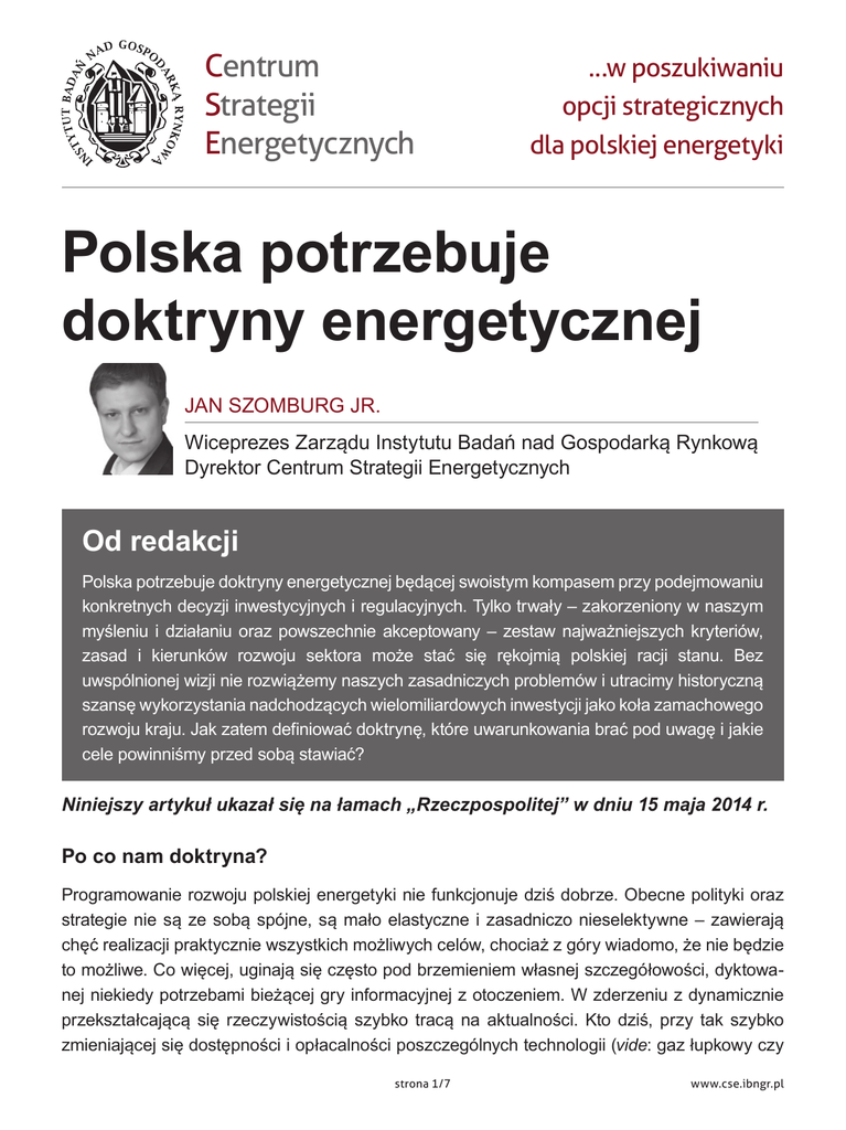 Centrum Strategii Energetycznych …w poszukiwaniu opcji strategicznych dla polskiej energetyki Polska potrzebuje doktryny energetycznej Jan Szomburg Jr. Wiceprezes Zarządu Instytutu Badań nad Gospodarką Rynkową Dyrektor Centrum Strategii Energetycznych Od redakcji Polska potrzebuje doktryny energetycznej będącej swoistym kompasem przy podejmowaniu konkretnych decyzji inwestycyjnych i regulacyjnych. Tylko trwały – zakorzeniony w naszym myśleniu i działaniu oraz powszechnie akceptowany – zestaw najważniejszych kryteriów, zasad i kierunków rozwoju sektora może stać się rękojmią polskiej racji stanu. Bez uwspólnionej wizji nie rozwiążemy naszych zasadniczych problemów i utracimy historyczną szansę wykorzystania nadchodzących wielomiliardowych inwestycji jako koła zamachowego rozwoju kraju. Jak zatem definiować doktrynę, które uwarunkowania brać pod uwagę i jakie cele powinniśmy przed sobą stawiać? Niniejszy artykuł ukazał się na łamach „Rzeczpospolitej” w dniu 15 maja 2014 r. Po co nam doktryna? Programowanie rozwoju polskiej energetyki nie funkcjonuje dziś dobrze. Obecne polityki oraz strategie nie są ze sobą spójne, są mało elastyczne i zasadniczo nieselektywne – zawierają chęć realizacji praktycznie wszystkich możliwych celów, chociaż z góry wiadomo, że nie będzie to możliwe. Co więcej, uginają się często pod brzemieniem własnej szczegółowości, dyktowanej niekiedy potrzebami bieżącej gry informacyjnej z otoczeniem. W zderzeniu z dynamicznie przekształcającą się rzeczywistością szybko tracą na aktualności. Kto dziś, przy tak szybko zmieniającej się dostępności i opłacalności poszczególnych technologii (vide: gaz łupkowy czy strona 1/7 www.cse.ibngr.pl Centrum Strategii Energetycznych fotowoltaika), jest w stanie przewidzieć miks energetyczny kraju w perspektywie 20 czy 50 lat? Poszczególne decyzje inwestycyjne zdają się być raczej potrzebą chwili i krótkoterminowych potrzeb (w tym politycznych) niż elementem jakiejś całościowej i dobrze przemyślanej wizji. Polska energetyka potrzebuje kompasu – trwałej i powszechnie akceptowanej myśli przewodniej, która odnosiłaby się do szerszego interesu rozwojowego kraju. ““ Polska energetyka potrzebuje kompasu – trwałej i powszechnie akceptowanej myśli przewodniej, która odnosiłaby się do szerszego interesu rozwojowego kraju. Jakie drogi definiowania doktryny? Naturalnym wydaje się, by doktryna energetyczna została wypracowana wśród demokratycznie wybranych liderów państwa (konsensus polityczny). Niestety, ze względu na logikę funkcjonowania polskiej polityki jej wygenerowanie, a tym bardziej uzgodnienie ponad podziałami wydaje się mało prawdopodobne. W dodatku jako społeczeństwo – w tym przedstawiciele poszczególnych sektorów gospodarki – mamy ogromny problem z akceptacją odgórnie definiowanych wizji. Jest to zresztą pochodną naszych doświadczeń historycznych (zabory, PRL), gdy ich kreatorem były obce państwa. Może warto więc, by doktryna powstała w oparciu o aktorów biznesowych – przedsiębiorstwa energetyczne (konsensus rynkowy)? Takie podejście z pewnością zwiększyłoby szanse jej realizacji. Czy jednak wizja rozwoju sektora powinna być podporządkowana jedynie jego własnemu punktowi widzenia („energetyka dla energetyków”), czy też powinna służyć interesowi rozwojowemu całego kraju? Poza tym, czy – przy takim podejściu – można uniknąć ryzyka nadmiernego wpływu największych graczy? A gdyby o jej stworzenie poprosić środowiska akademickie (konsensus naukowy)? Przykładowo, w Niemczech głos nauki w definiowaniu doktryny energetycznej był bardzo istotny. Czy jednak – i w tym przypadku – znowu nie natrafilibyśmy na silne podziały odzwierciedlające powiązania w ramach poszczególnych podsektorów energetyki? W dodatku, czy siła autorytetu nauki w Polsce jest wystarczająca, by przewodzić temu procesowi? Pozostaje jeszcze wariant uspołecznienia – postawienia na otwartą procedurę publiczną z udziałem mediów (konsensus społeczny). Tu jednak wyzwaniem jest logika funkcjonowania głównego strona 2/7 www.cse.ibngr.pl Centrum Strategii Energetycznych nurtu debaty publicznej, który ma problem z nastawieniem się na poszukiwanie konstruktywnych rozwiązań. W przeważającej większości ludzie po prostu nie są nimi zainteresowani – dokonując codziennie wyborów przed telewizorami, w kioskach czy w Internecie preferują konflikt i sensację. A rynek mediów się dostosowuje i również wtórnie kreuje takiego odbiorcę. Nasuwa się więc pytanie, czy proces wypracowania doktryny nie mógłby być pewnego rodzaju mieszanką powyższych podejść? Czy nie powinna ona powstać w oparciu o współpracę szeroko rozumianych elit dobrej woli – zarówno ze świata polityki, biznesu jak i nauki – o merytokratycznym a zarazem obywatelskim podejściu. Wydaje się, że mogą one zainicjować proces twórczy, proponując wyjściowe obszary wyboru. Te natomiast należałoby poddać szerokiej obywatelskiej debacie, w tym również przy udziale mediów (uspołeczniony konsensus merytokratyczny). Tak wypracowana doktryna stałaby się trwałą i realną inspiracją dla decyzji politycznych. ““ Doktryna energetyczna mogłaby powstać w oparciu o współpracę szeroko rozumianych elit dobrej woli – zarówno ze świata polityki, biznesu jak i nauki – o merytokratycznym a zarazem obywatelskim podejściu. Zainicjowałyby one proces twórczy, proponując wyjściowe obszary wyboru, które następnie zostałyby poddane szerokiej obywatelskiej debacie, w tym również przy udziale mediów. Jaka forma doktryny? Na ile powinniśmy dążyć do precyzyjnego dodefiniowania doktryny i jej sformalizowania? Amerykanie niewątpliwie posiadają doktrynę energetyczną, choć na poziomie federalnym nie mają żadnego dokumentu, który by ją określał. Rosjanie spisują wiele stra