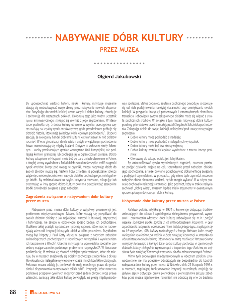 NABYWANIE DÓBR KULTURY PRZEZ MUZEA Olgierd Jakubowski By upowszechniać wartości historii, nauki i kultury, instytucje muzealne starają się rozbudowywać swoje zbiory przez nabywanie nowych eksponatów. Pozyskując do swoich kolekcji cenne zabytki i dobra kultury, chronią je i zachowują dla następnych pokoleń. Dokonują tego jako ważny uczestnik rynku antykwarycznego, stykając się również z jego zagrożeniami. W literaturze podkreśla się, iż dobra kultury utracone w wyniku przestępstwa często trafiają na legalny rynek antykwaryczny, gdzie przedmiotom próbuje się dorobić historie, które mają świadczyć o ich legalnym pochodzeniu1. Eksperci szacują, że nielegalny handel dobrami kultury jest wart nawet 6 mld dolarów rocznie2. W erze globalizacji dzieła sztuki i antyki o wątpliwym pochodzeniu łatwo przemieszczają się między krajami. Dotyczy to zwłaszcza strefy Schengen – osoby przekraczające granice wewnętrzne Unii Europejskiej nie podlegają kontroli granicznej lub podlegają jej w ograniczonym zakresie. Dobro kultury zakupione w Hiszpanii może być po paru dniach oferowane w Polsce, z drugiej strony wywiezione z Polski dzieło sztuki może szybko trafić na grecki rynek antyków. Biorąc pod uwagę te czynniki, muzea nabywając dzieła do swoich zbiorów muszą się, niestety, liczyć z faktem, iż powiększenie kolekcji wiąże się z niebezpieczeństwem nabycia obiektu pochodzącego z nielegalnego źródła. By zminimalizować to ryzyko, instytucja muzealna, zakupując lub otrzymując w inny sposób dobro kultury powinna przedsięwziąć szczególne środki ostrożności związane z jego nabyciem. 88 wą i społeczną. Status podmiotu zaufania publicznego powoduje, iż oczekuje się od nich podejmowania należytej staranności przy powiększaniu swoich kolekcji. W przypadku instytucji państwowych i samorządowych nietrafiona transakcja i obowiązek zwrotu zakupionego obiektu może się wiązać z utratą publicznych środków. W związku z tym muzea nabywając dobra kultury powinny priorytetowo przed transakcją ustalić legalność ich źródła pochodzenia. Zakupując obiekt do swojej kolekcji, należy brać pod uwagę następujące zagrożenia: • Dobro kultury może pochodzić z kradzieży; • Dobro kultury może pochodzić z nielegalnych wykopalisk; • Dobro kultury może być tzw. stratą wojenną; • Dobro kultury zostało nielegalnie wywiezione z terenu innego państwa; • Oferowany do zakupu obiekt jest falsyfikatem. By zminimalizować ryzyko wymienionych zagrożeń, muzeum powinno podjąć działania mające na celu sprawdzenie przed nabyciem obiektu jego pochodzenie, a także powinno przechowywać dokumentację związaną z podjętymi czynnościami. W przypadku, gdy mimo tych czynności, muzeum nabędzie obiekt obarczony wadami, będzie mogło wykazać, iż w całym procesie dochowało należytej staranności. Jako podmiot, który w trakcie nabycia zachował „dobrą wiarę”, muzeum będzie miało argumenty w ewentualnym sporze sądowym dotyczącym dobra kultury. Zagrożenia związane z nabywaniem dóbr kultury przez muzea Nabywanie dóbr kultury przez muzea w Polsce Nabywanie przez muzea dóbr kultury o wątpliwej proweniencji jest problemem międzynarodowym. Muzea, które starają się pozyskiwać do swoich zbiorów obiekty o jak największej wartości kulturowej, artystycznej i historycznej, nie zawsze w odpowiedni sposób badają ich pochodzenie. Skutkiem takiej praktyki są skandale i procesy sądowe, które mocno nadwerężają wizerunki instytucji biorących udział w takim procederze. Przykładem mogą być kłopoty J. Paul Getty Museum, związane z nabyciem zabytków archeologicznych pochodzących z rabunkowych wykopalisk i wywiezieniem ich bezprawnie z Włoch3. Obecnie instytucja ta wprowadziła specjalne procedury, mające zapobiec podobnym problemom na przyszłość4. W literaturze podkreśla się, iż zmienia się również dzisiejsze społeczeństwo, które nie toleruje, by w muzeach znajdowały się obiekty pochodzące z rabunków z okresu Holokaustu czy nielegalnie wywiezione w czasie innych konfliktów zbrojnych. Światowe muzea oddają je, ponieważ nie mają moralnego prawa do posiadania i eksponowania na wystawach takich dzieł5. Instytucje, które nawet na podstawie przepisów cywilnych mogłyby przed sądem obronić swoje prawa własności, zwracają takie dobra kultury ze względu na presję międzynarodo- Państwo polskie, ratyfikując w 1974 r. konwencję dotyczącą środków zmierzających do zakazu i zapobiegania nielegalnemu przywozowi, wywozowi i przenoszeniu własności dóbr kultury, zobowiązało się m.in.: podjąć wszelkie konieczne środki, zgodne z ich ustawodawstwem krajowym, w celu zapobieżenia nabywaniu przez muzea i inne instytucje tego typu, znajdujące się na ich terytorium, dóbr kultury pochodzących z innego Państwa, które zostały nielegalnie wywiezione po wejściu w życie niniejszej Konwencji w stosunku do obu zainteresowanych Państw; informować w miarę możliwości Państwo Stronę niniejszej Konwencji, z którego takie dobra kultury pochodzą, o oferowanych dobrach kultury nielegalnie wywiezionych z terytorium tego Państwa po wejściu w życie niniejszej Konwencji w stosunku do obu zainteresowanych Państw6. Mimo tych zobowiązań międzynarodowych w obecnym polskim ustawodawstwie nie ma przepisów odnoszących się bezpośrednio do kontroli nabywania dóbr kultury przez muzea. W Ustawie z dnia 21 listopada 1996 r. o muzeach, regulującej funkcjonowanie instytucji muzealnych, znajdują się jedynie zapisy dotyczące prawa pierwokupu i pierwszeństwa zakupu zabytków przez muzea rejestrowane, natomiast nie odnoszą się one do badania UZEALNICTWO 53 badania proweniencyjne muzealiów ich pochodzenia7. W praktyce część polskich instytucji muzealnych podjęło się przestrzegania Kodeksu Etyki ICOM dla Muzeów, opracowanego przez Międzynarodową Radę Muzeów8. W dokume