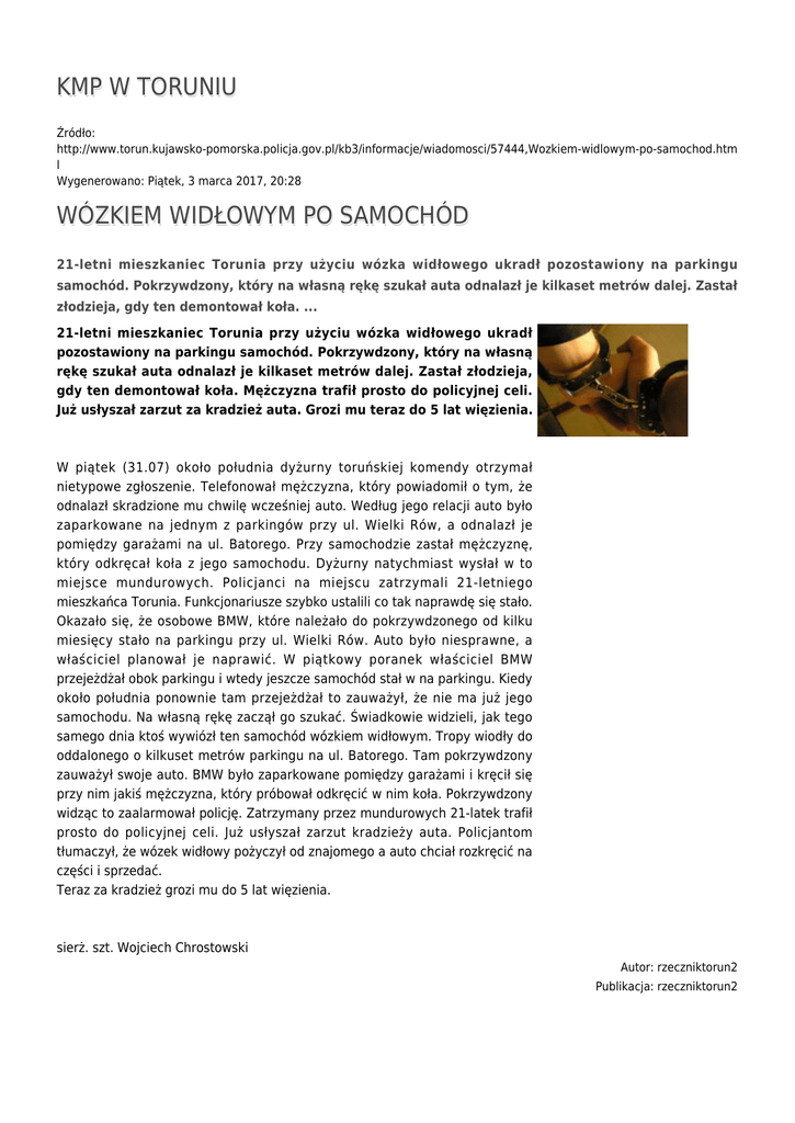 KMP W TORUNIU Źródło: http://www.torun.kujawsko-pomorska.policja.gov.pl/kb3/informacje/wiadomosci/57444,Wozkiem-widlowym-po-samochod.htm l Wygenerowano: Piątek, 3 marca 2017, 20:28 WÓZKIEM WIDŁOWYM PO SAMOCHÓD 21-letni mieszkaniec Torunia przy użyciu wózka widłowego ukradł pozostawiony na parkingu samochód. Pokrzywdzony, który na własną rękę szukał auta odnalazł je kilkaset metrów dalej. Zastał złodzieja, gdy ten demontował koła. ... 21-letni mieszkaniec Torunia przy użyciu wózka widłowego ukradł pozostawiony na parkingu samochód. Pokrzywdzony, który na własną rękę szukał auta odnalazł je kilkaset metrów dalej. Zastał złodzieja, gdy ten demontował koła. Mężczyzna trafił prosto do policyjnej celi. Już usłyszał zarzut za kradzież auta. Grozi mu teraz do 5 lat więzienia. W piątek (31.07) około południa dyżurny toruńskiej komendy otrzymał nietypowe zgłoszenie. Telefonował mężczyzna, który powiadomił o tym, że odnalazł skradzione mu chwilę wcześniej auto. Według jego relacji auto było zaparkowane na jednym z parkingów przy ul. Wielki Rów, a odnalazł je pomiędzy garażami na ul. Batorego. Przy samochodzie zastał mężczyznę, który odkręcał koła z jego samochodu. Dyżurny natychmiast wysłał w to miejsce mundurowych. Policjanci na miejscu zatrzymali 21-letniego mieszkańca Torunia. Funkcjonariusze szybko ustalili co tak naprawdę się stało. Okazało się, że osobowe BMW, które należało do pokrzywdzonego od kilku miesięcy stało na parkingu przy ul. Wielki Rów. Auto było niesprawne, a właściciel planował je naprawić. W piątkowy poranek właściciel BMW przejeżdżał obok parkingu i wtedy jeszcze samochód stał w na parkingu. Kiedy około południa ponownie tam przejeżdżał to zauważył, że nie ma już jego samochodu. Na własną rękę zaczął go szukać. Świadkowie widzieli, jak tego samego dnia ktoś wywiózł ten samochód wózkiem widłowym. Tropy wiodły do oddalonego o kilkuset metrów parkingu na ul. Batorego. Tam pokrzywdzony zauważył swoje auto. BMW było zaparkowane pomiędzy garażami i kręcił się przy nim jakiś mężczyzna, który próbował odkręcić w nim koła. Pokrzywdzony widząc to zaalarmował policję. Zatrzymany przez mundurowych 21-latek trafił prosto do policyjnej celi. Już usłyszał zarzut kradzieży auta. Policjantom tłumaczył, że wózek widłowy pożyczył od znajomego a auto chciał rozkręcić na części i sprzedać. Teraz za kradzież grozi mu do 5 lat więzienia. sierż. szt. Wojciech Chrostowski Autor: rzeczniktorun2 Publikacja: rzeczniktorun2 Ocena: 0/5 (0) Tweetnij
