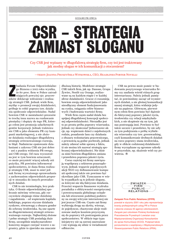 oczami pr-owca CSR – STRATEGIA ZAMIAST SLOGANU Czy CSR jest wpisany w długofalową strategię firm, czy też jest traktowany jak modny slogan w ich komunikacji z otoczeniem? —tekst: Joanna Pruszyńska-Witkowska, CEO, Headlines Porter Novelli Z badania Forum Odpowiedzialnego Biznesu z 2012 roku wynika, że 80 proc. firm w Polsce zatrudniających powyżej 150. pracowników deklaruje wdrożenie i realizację strategii CSR. Jednak wiele firm, myśląc o promocji swojej działalności, próbuje to robić poprzez tzw. działania społecznie odpowiedzialne. Nadal bowiem CSR w mentalności prezesów to trochę inna nazwa na rozdawanie pieniędzy i dopięty do tego PR, którego celem jest promocja szlachetnych gestów korporacji. Jednak traktowanie CSR-u jako elementu PR czy kampanii marketingowej, a nie złożone działania realizujące długofalową strategię zrównoważonego rozwoju, to błąd. Nadmierne epatowanie działaniami z zakresu CSR nie jest dobre – ani z punktu widzenia PR-owego, ani CSR-owego. Od razu wyczuwalna jest w tym bowiem sztuczność, co może przynieść więcej szkody niż pożytku. PR powinien informować społeczeństwo, że dana firma realizuje strategię CSR, musi to mieć jednak formę wyważonego sprawozdania z zachowaniem odpowiednich proporcji w stosunku do innych prowadzonych działań. CSR to nie terminologia, lecz praktyka. O firmie odpowiedzialnej społecznie mówimy wówczas, gdy rzeczywiście obejmuje różne dziedziny i zagadnienia – od wspierania kapitału ludzkiego, poprzez etyczne działania rynkowe, równowagę z obszaru gender do ochrony środowiska. Są one oparte na długoterminowej strategii zrównoważonego rozwoju. Najbardziej złożone i pełne strategie CSR posiadają duże firmy, szczególnie międzynarodowe koncerny mogące czerpać wzorce z zagranicy, gdzie to zjawisko ma znacznie 40 dłuższą historię. Modelowe strategie CSR takich firm, jak np. Danone, Grupa Żywiec, Nestlé czy Orange, realizowane są na każdym etapie i w każdej sferze działalności. Gracze ci rozumieją bowiem swoją odpowiedzialność jako nieodłączny element funkcjonowania na rynku, osiągania celów biznesowych i budowania wartości firmy. Wiele firm często nadal działa bez spójnej długofalowej koncepcji społecznej odpowiedzialności. Nierzadko jest to po prostu próba poprawy wizerunku. Jednak czy skuteczna? Jednorazowe akcje, np. wspieranie dzieci z najuboższych rodzin, posadzenie lasu czy działania z obszaru wolontariatu pracowniczego, z pewnością są godne pochwały, jednak należy zdawać sobie sprawę z faktu, iż nie można ich nazwać strategią społecznej odpowiedzialności. Nie idzie za nimi bowiem długofalowa zmiana i prawdziwa poprawa jakości życia. Coraz częściej też firmy nawiązują współpracę z sektorem pozarządowym. Jednak wsparcie pojedynczych akcji NGO czy dofinansowanie kampanii społecznej także nie powinno być określane jako CSR. Tymczasem w wielu wypadkach są to jedynie slogany, za którymi nie idą faktyczne działania. Przecież wsparcie finansowe wydruku poradnika o efektywności energetycznej i powstrzymaniu globalnego ocieplenia lub stworzenie podobnej podstrony na swojej witrynie internetowej nie jest jeszcze CSR-em. Często zaś firmy wybierają drogę na skróty, wierząc, że pojedyncze, chaotyczne akcje realizowane małym kosztem przyczynią się do poprawy ich postrzegania przez społeczeństwo. W efekcie tego typu inicjatywy nie są szerzej zauważane i nie wpisują się silnie w świadomość odbiorców. cover CSR na pewno może pomóc w budowaniu pozytywnego wizerunku firmy czy zaufania wśród różnych grup interesariuszy. Należy jednak pamiętać, że powinniśmy zacząć od wymiernych działań, a nie głośnej komunikacji naszej strategii, która widnieje jedynie na papierze. Głównym, pierwotnym celem firm powinno być dążenie do faktycznej poprawy jakości życia, środowiska czy relacji międzyludzkich, a nie skupienie się na tym, jak nas postrzegają inni. Powinno to być także szczere i prawdziwe, by nie szły za tym podejrzenia o próbę wybielenia wizerunku czy tzw. greenwashing, czyli komunikowanie drobnych działań na rzecz poprawy stanu środowiska, gdy w efekcie codziennej działalności firmy wyrządzane są ogromne szkody w przyrodzie, np. skażenie wód czy powietrza. Związek Firm Public Relations (ZFPR) powstał w styczniu 2001 roku jako reprezentacja branży profesjonalnych usług PR w Polsce i obecnie zrzesza 40 agencji członkowskich. Związek jest członkiem Polskiej Konfederacji Pracodawców Prywatnych Lewiatan oraz Międzynarodowej Organizacji Konsultantów do spraw Komunikacji (ICCO). Podpisał także porozumienie o współpracy z Międzynarodowym Stowarzyszeniem Public Relations (IPRA).